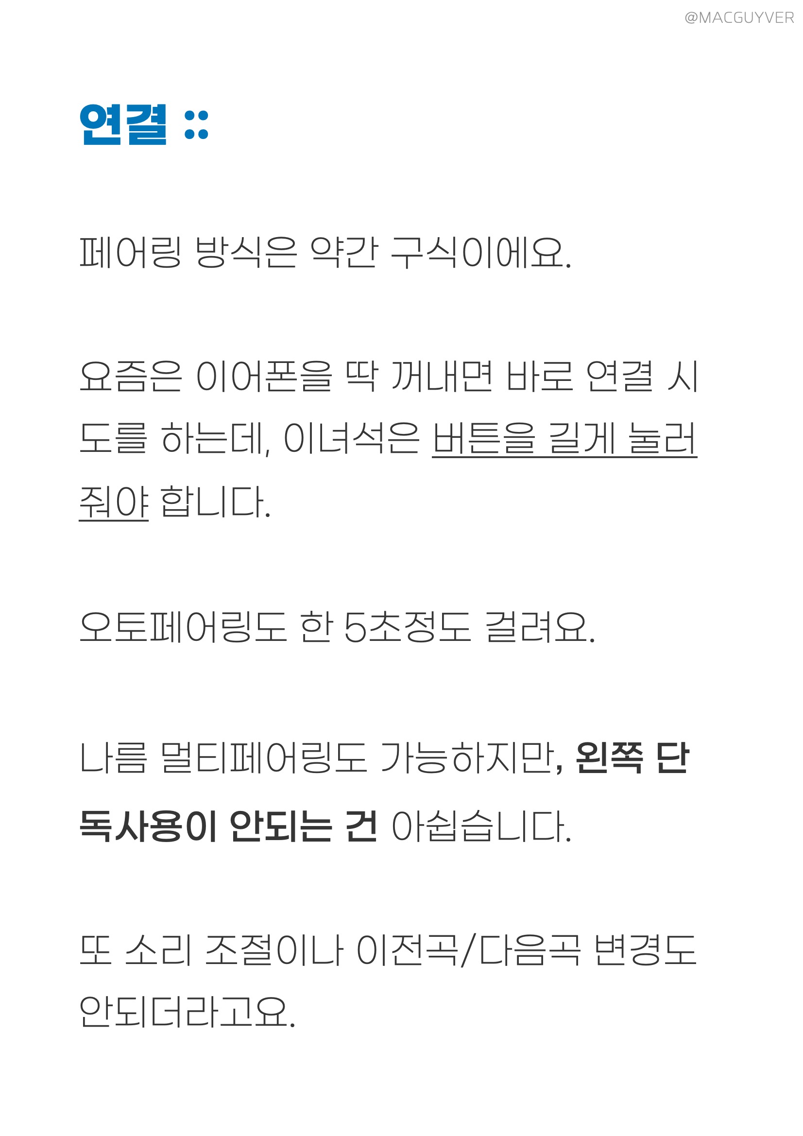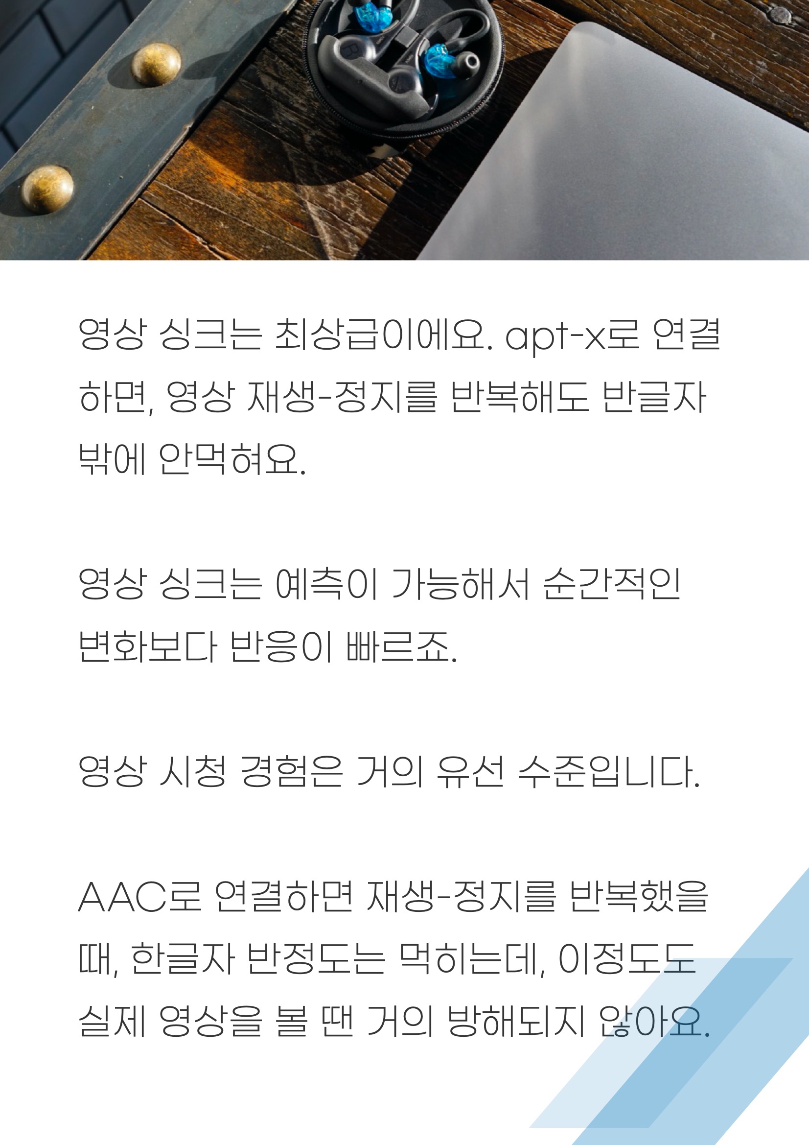 연결 :: 이 고음질 코드리스 이어폰의 페어링 방식은 약간 구식이에요. 요즘은 이어폰을 딱 꺼내면 바로 연결 시도를 하는데, 이녀석은 버튼을 길게 눌러줘야 합니다. 오토페어링도 한 5초정도 걸려요. 나름 멀티페어링도 가능하지만, 왼쪽 단독사용이 안되는 건 아쉽습니다. 또 소리 조절이나 이전곡/다음곡 변경도 안되더라고요. 반면에 이 블루투스 이어폰의 연결거리는 장난아니에요. 야외에서 40m까지 안정적이었고, 80m까지도 연결이 유지되더라고요. 거의 뭐 무전기 수준인데, 야외에서 폰을 놓아두고 주변에서 운동하기 좋았어요. 그런데 실내는 사정이 달라요. 두꺼운 벽이 있으면 8m 정도만 떨어져도 불안정해지거든요. AONIC 215 고음질 코드리스 이어폰의 영상 싱크는 최상급이에요. apt-x로 연결하면, 영상 재생-정지를 반복해도 반글자 밖에 안먹혀요. 영상 싱크는 예측이 가능해서 순간적인 변화보다 반응이 빠르죠. 슈어 AONIC 215 고음질 코드리스 이어폰의 영상 시청 경험은 거의 유선 수준입니다. AAC로 연결하면 재생-정지를 반복했을 때, 한글자 반정도는 먹히는데, 이정도도 실제 영상을 볼 땐 거의 방해되지 않아요.
