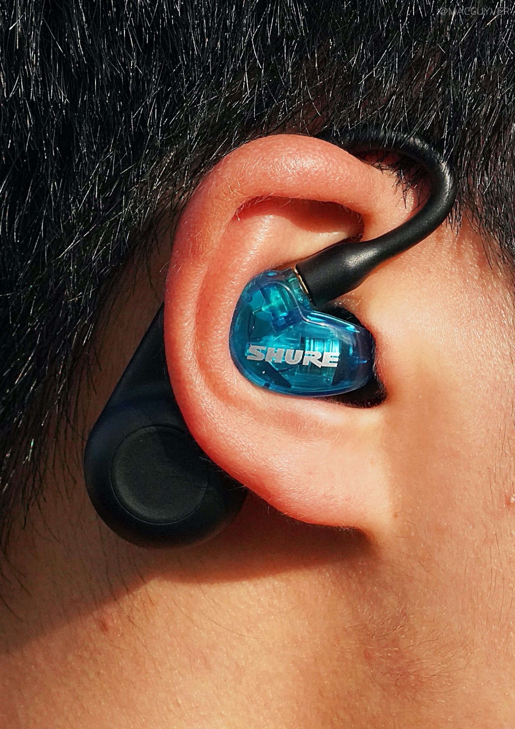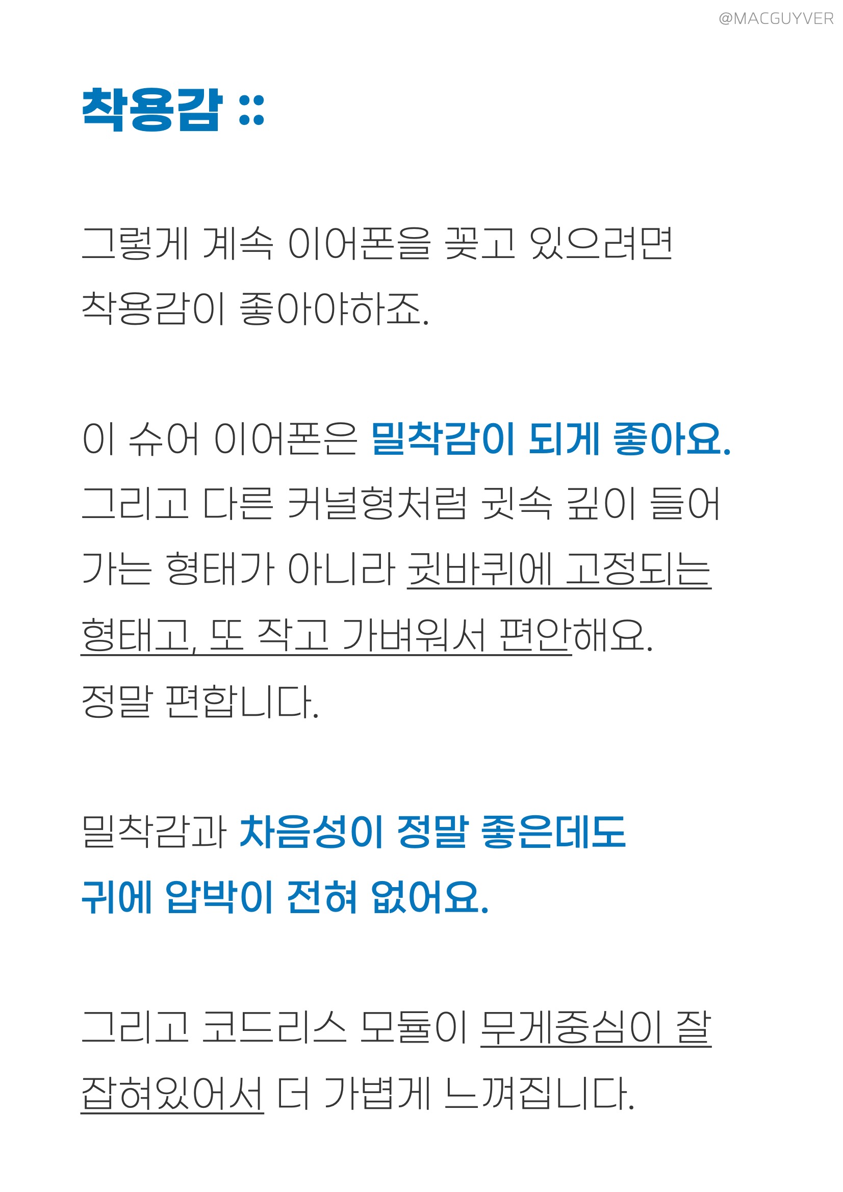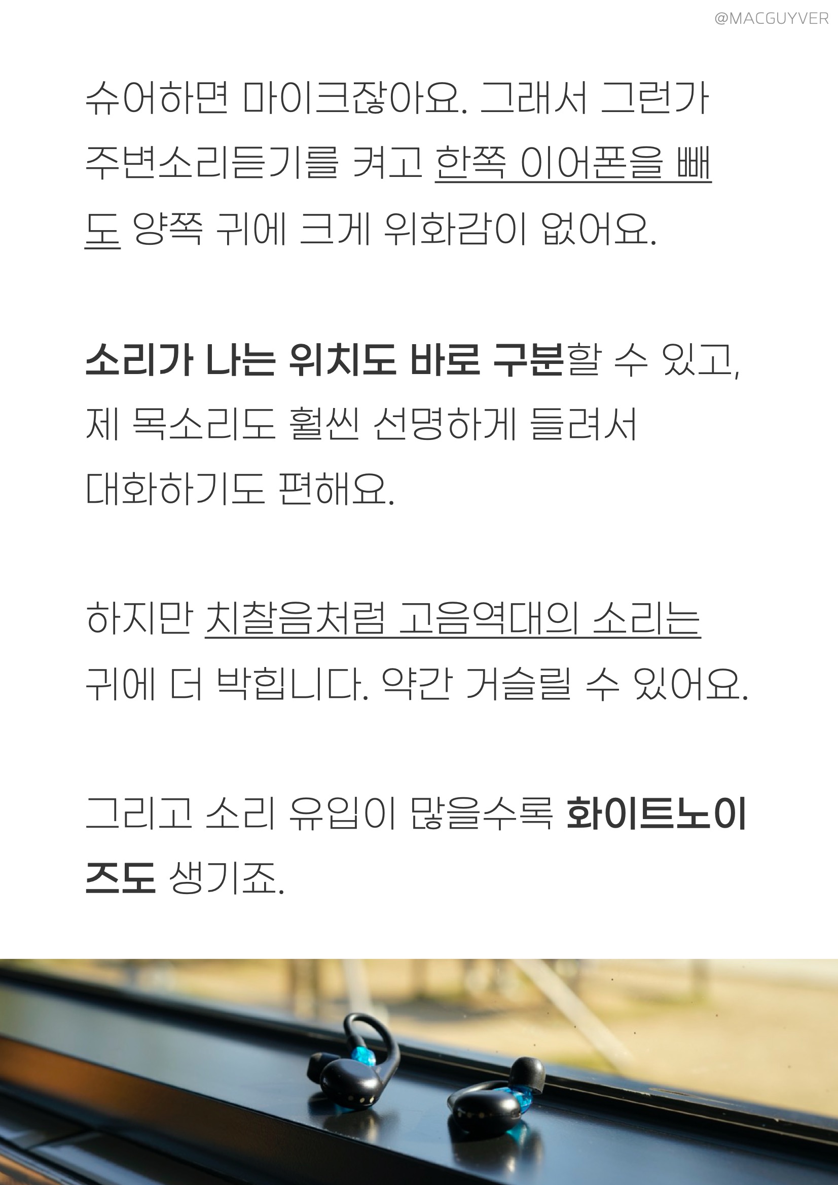 착용감 :: 그렇게 계속 이어폰을 꽂고 있으려면 착용감이 좋아야하죠. 이 슈어 모니터링 이어폰은 밀착감이 되게 좋아요. 그리고 다른 커널형처럼 귓속 깊이 들어가는 형태가 아니라 귓바퀴에 고정되는 형태고, 또 작고 가벼워서 편안해요. 정말 편합니다. 밀착감과 차음성이 정말 좋은데도 귀에 압박이 전혀 없어요. 그리고 코드리스 모듈이 무게중심이 잘 잡혀있어서 더 가볍게 느껴집니다. 보통 이런 오버이어 무선 이어폰은 바깥쪽으로 커다랗게 나와서 불안하게 느껴지곤 하는데, 이 슈어 이어폰은 디자인은 조금 보청기 같아도 착용감은 진짜 안정적입니다. 일반 인이어 완전무선 이어폰과 비교해도더 편안하고 안정적이에요. 참고로 오버이어 타입은 처음 착용할 때 진짜 어색하거든요. 이어버드를 먼저 귀에 넣고 이어가이드를 뒤로 넘겨주시면 쉽게 착용하실 수 있을거에요.