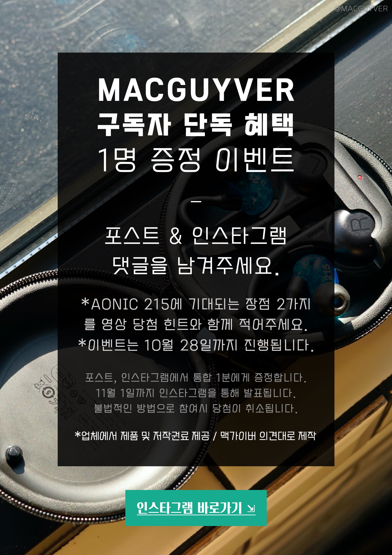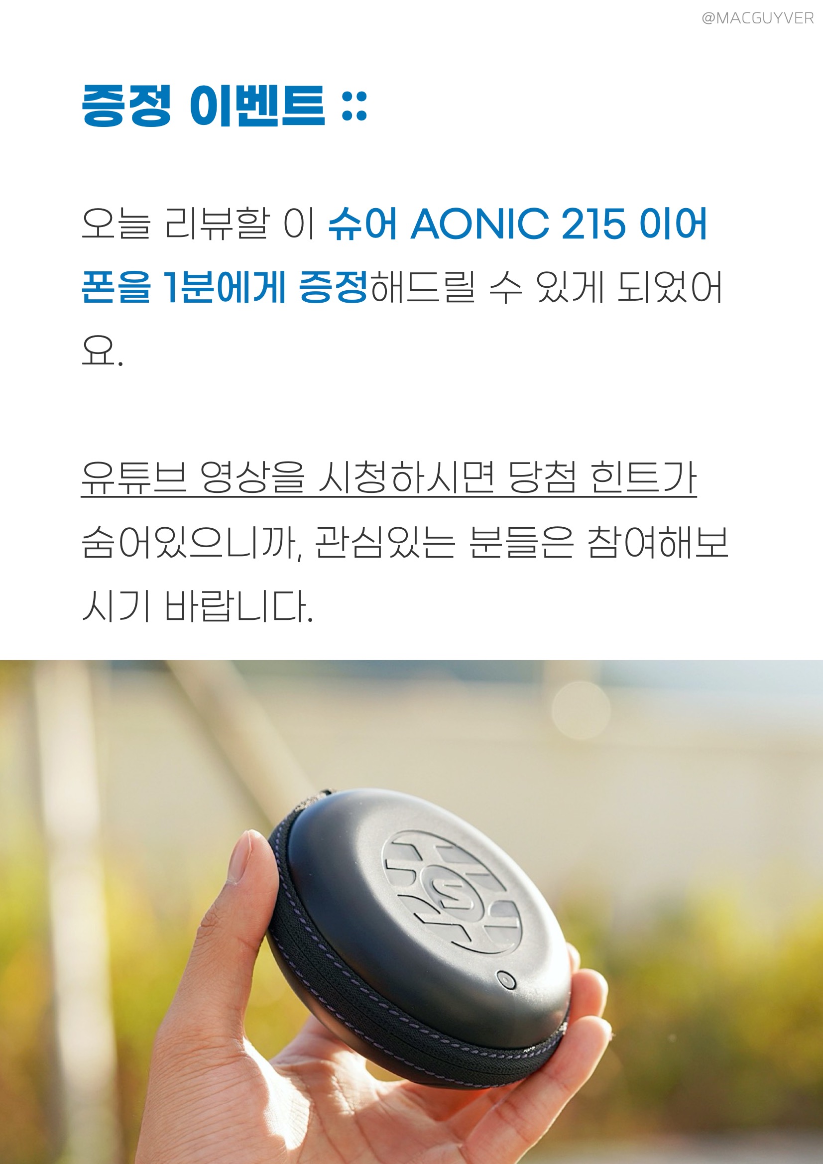 증정 이벤트 :: 오늘 리뷰할 이 슈어 AONIC 215 고음질 무선 이어폰을 1분에게 증정해드릴 수 있게 되었어요. 유튜브 영상을 시청하시면 당첨 힌트가 숨어있으니까, 관심있는 분들은 참여해보시기 바랍니다.