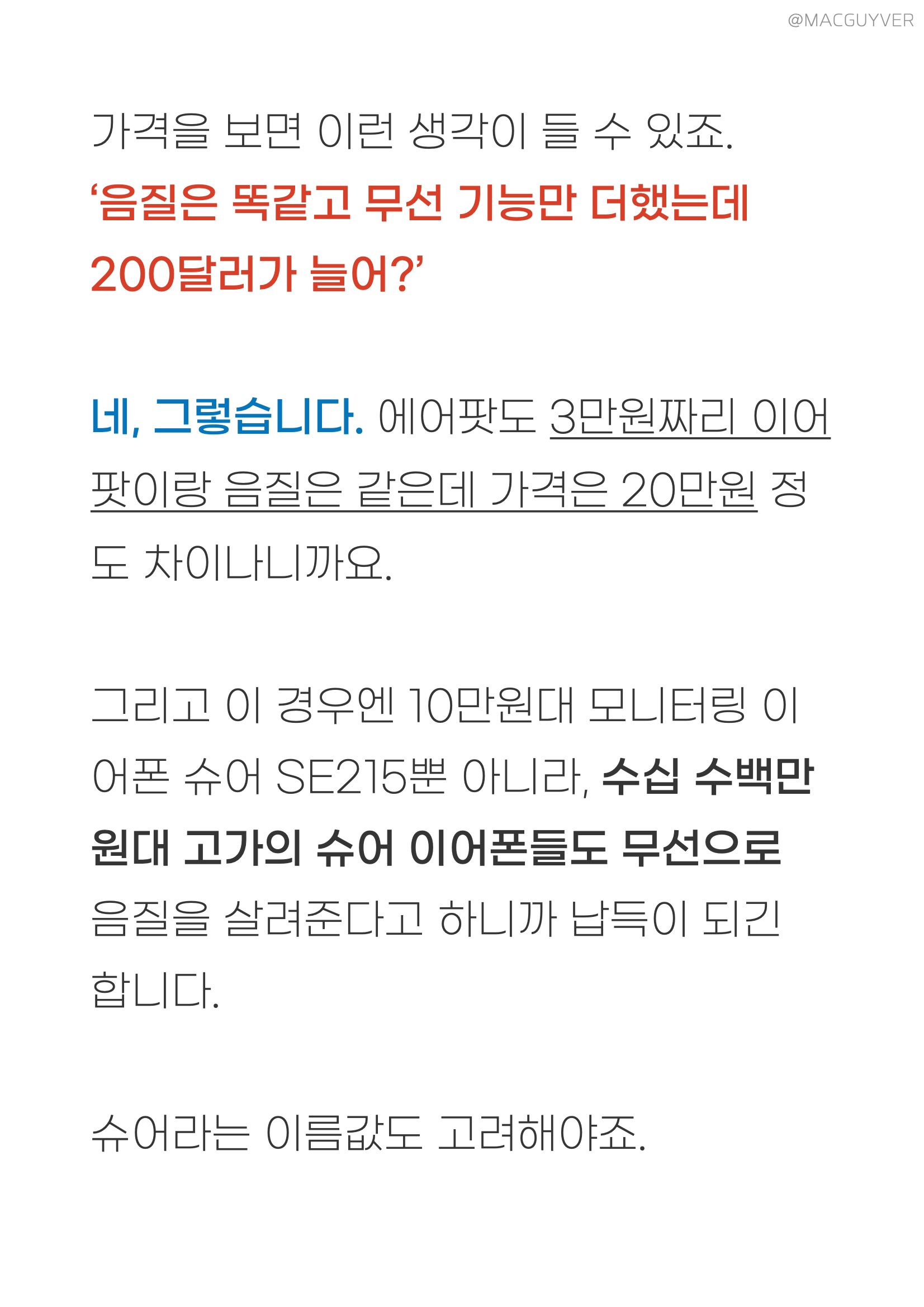 SHURE AONIC 215 이 AONIC 215은 고품질 음향장비로 유명한 슈어 제품인데요. 슈어 모니터링 이어폰 중 가장 대중적이고 가성비가 좋은 SE215에 코드리스 모듈을 연결한 형태에요. 슈어 고음질 이어폰은 MMCX 이어폰이라고 해서, 이 머리만 똑따서 케이블을 바꿀 수 있는데요. 유선 버전 79달러 무선 버전 279달러 무선 모듈 229달러 이 고음질 블루투스 이어폰의 가격을 보면 이런 생각이 들 수 있죠. ‘음질은 똑같고 무선 기능만 더했는데 200달러가 늘어?’ 네, 그렇습니다. 에어팟도 3만원짜리 이어팟이랑 음질은 같은데 가격은 20만원 정도 차이나니까요. 그리고 이 경우엔 10만원대 모니터링 이어폰 슈어 SE215뿐 아니라, 수십 수백만원대 고가의 슈어 고음질 이어폰들도 무선으로 음질을 살려준다고 하니까 납득이 되긴 합니다. 슈어라는 이름값도 고려해야죠. 참고로 슈어는 넥밴드 블루투스 케이블도 있는데요. 10만원초반 제품은 AAC 코덱도 지원하지 않고, 저음 튜닝이 약간 달라졌었어요. 음감용으론 더 좋을 수 있지만, 모니터링 이어폰이라는 컨셉에는 조금 아쉬운 면이 있었죠. 그런데 이번 AONIC 215 고음질 블루투스 이어폰의 코드리스 모듈은 AAC뿐 아니라 APT-X도 지원하고 원음을 더 잘 유지하는게 느껴집니다.