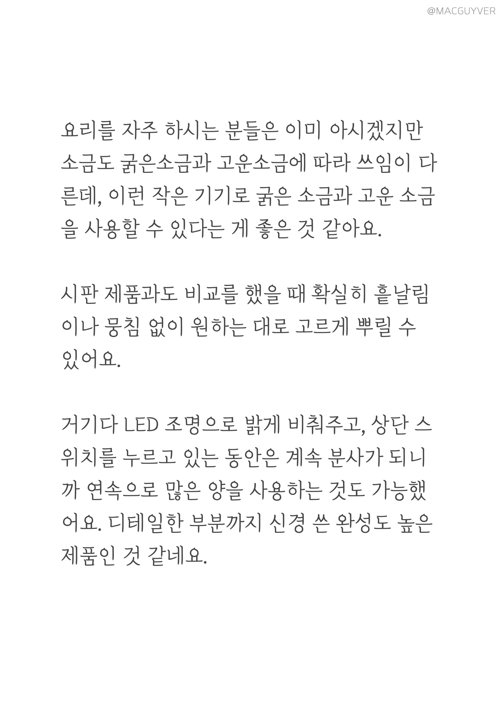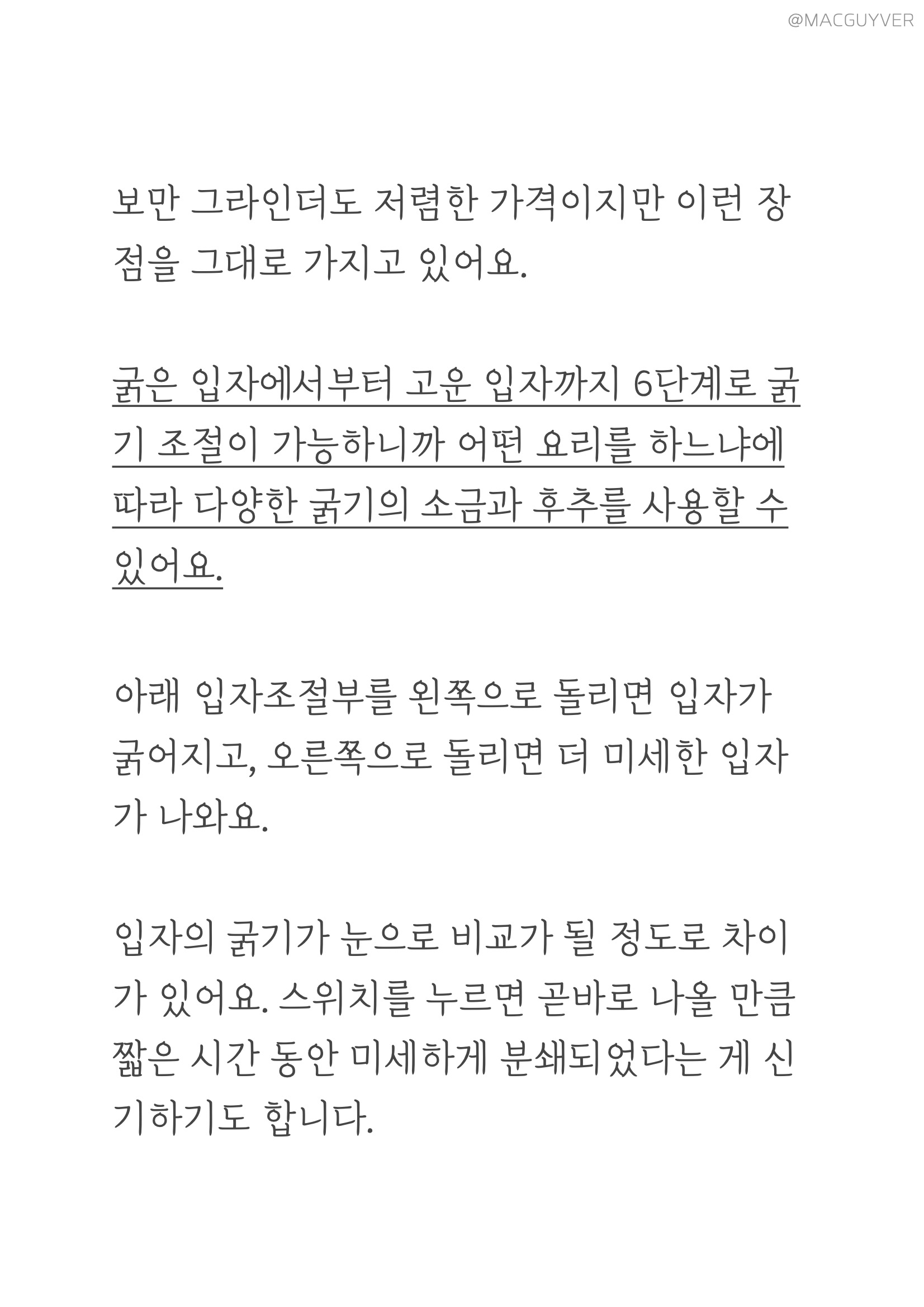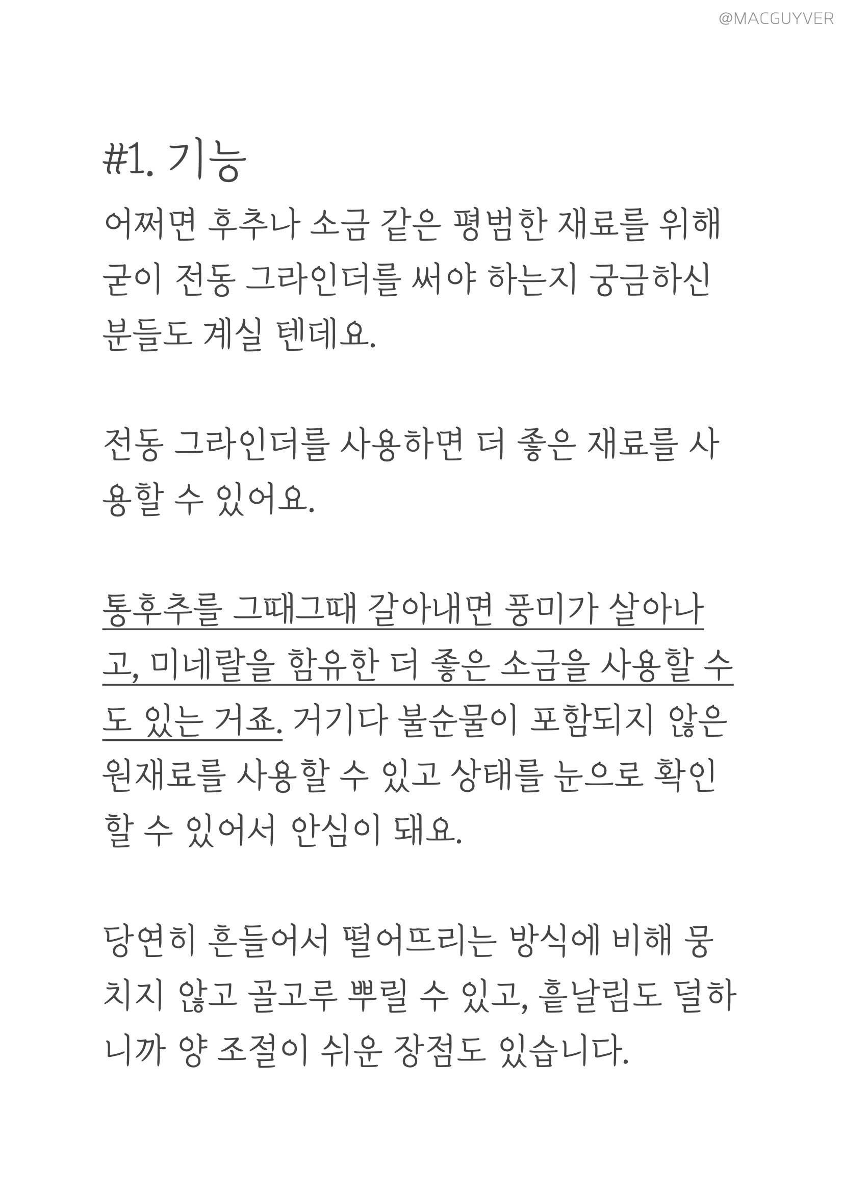 #1. 기능 어쩌면 후추나 소금을 위해 굳이 전동 그라인더를 써야 하는지 궁금하신 분들도 계실 텐데요. 전동 그라인더를 사용하면 더 좋은 재료를 사용할 수 있어요. 통후추를 그때그때 갈아내면 풍미가 살아나고, 미네랄을 함유한 더 좋은 소금을 사용할 수도 있는 거죠. 거기다 불순물이 포함되지 않은 원재료를 사용할 수 있고 상태를 눈으로 확인할 수 있어서 안심이 돼요. 당연히 흔들어서 떨어뜨리는 방식에 비해 뭉치지 않고 골고루 뿌릴 수 있고, 흩날림도 덜하니까 양 조절이 쉬운 장점도 있습니다. 보만 전동 그라인더도 저렴한 가격이지만 이런 장점을 그대로 가지고 있어요.