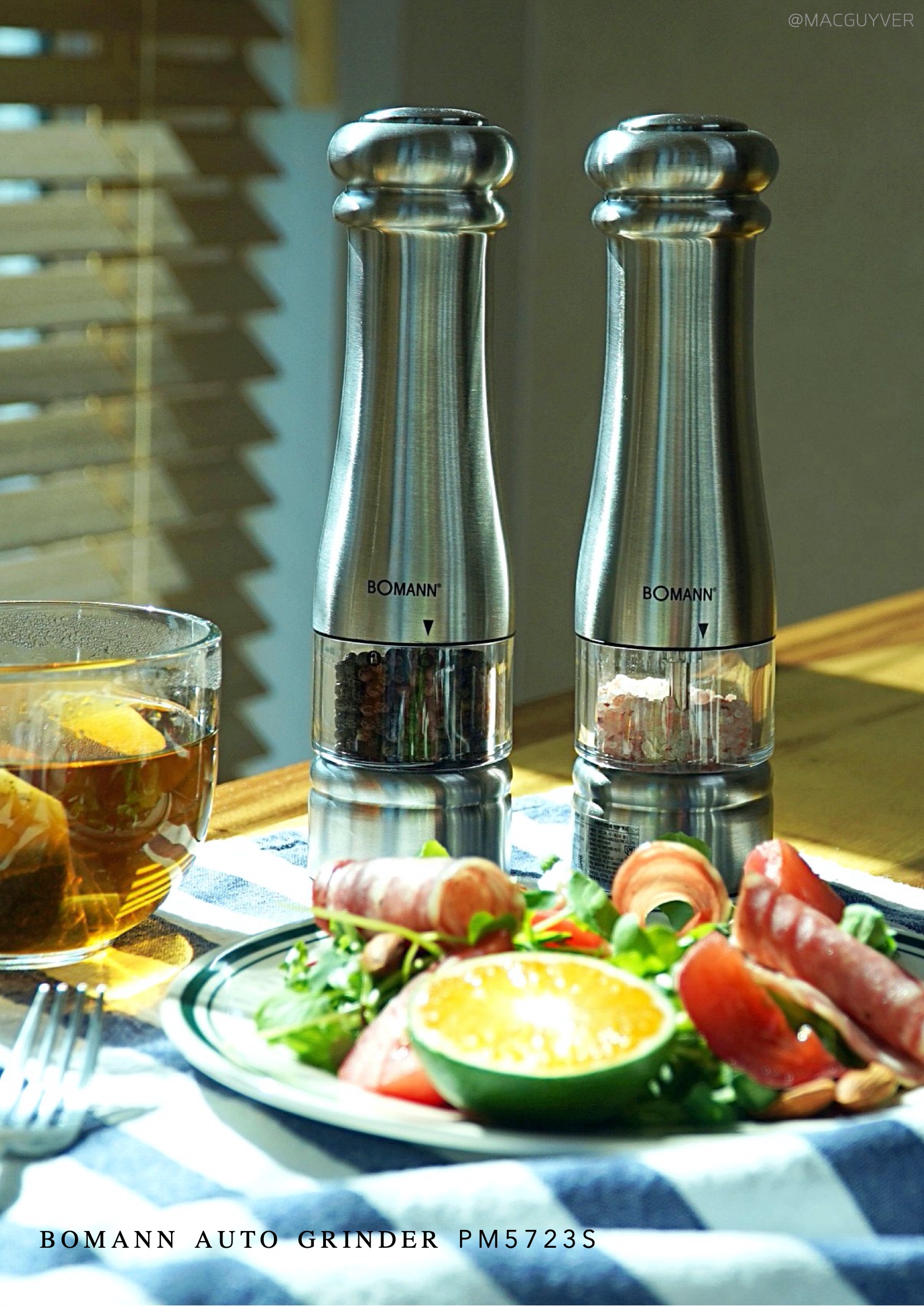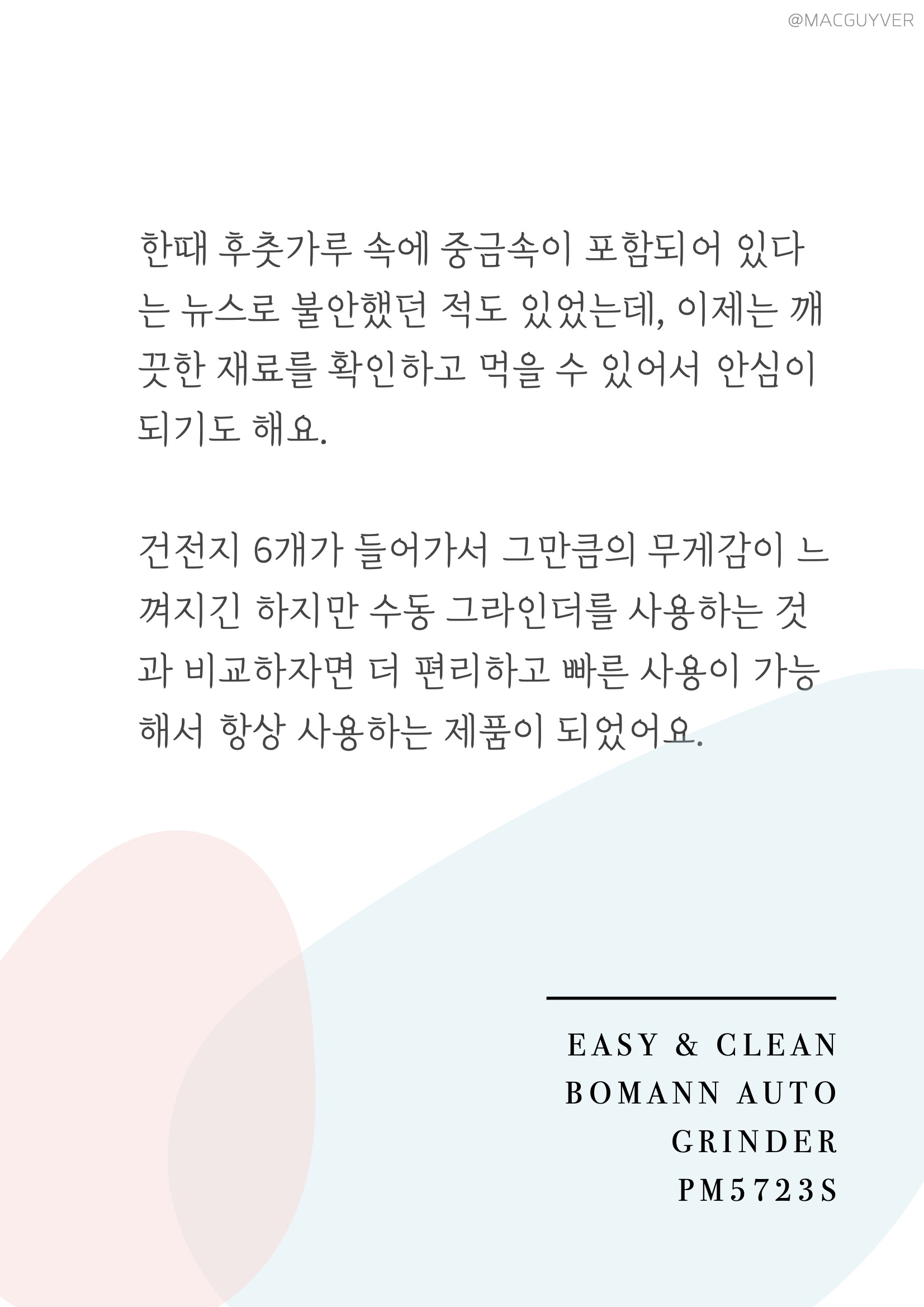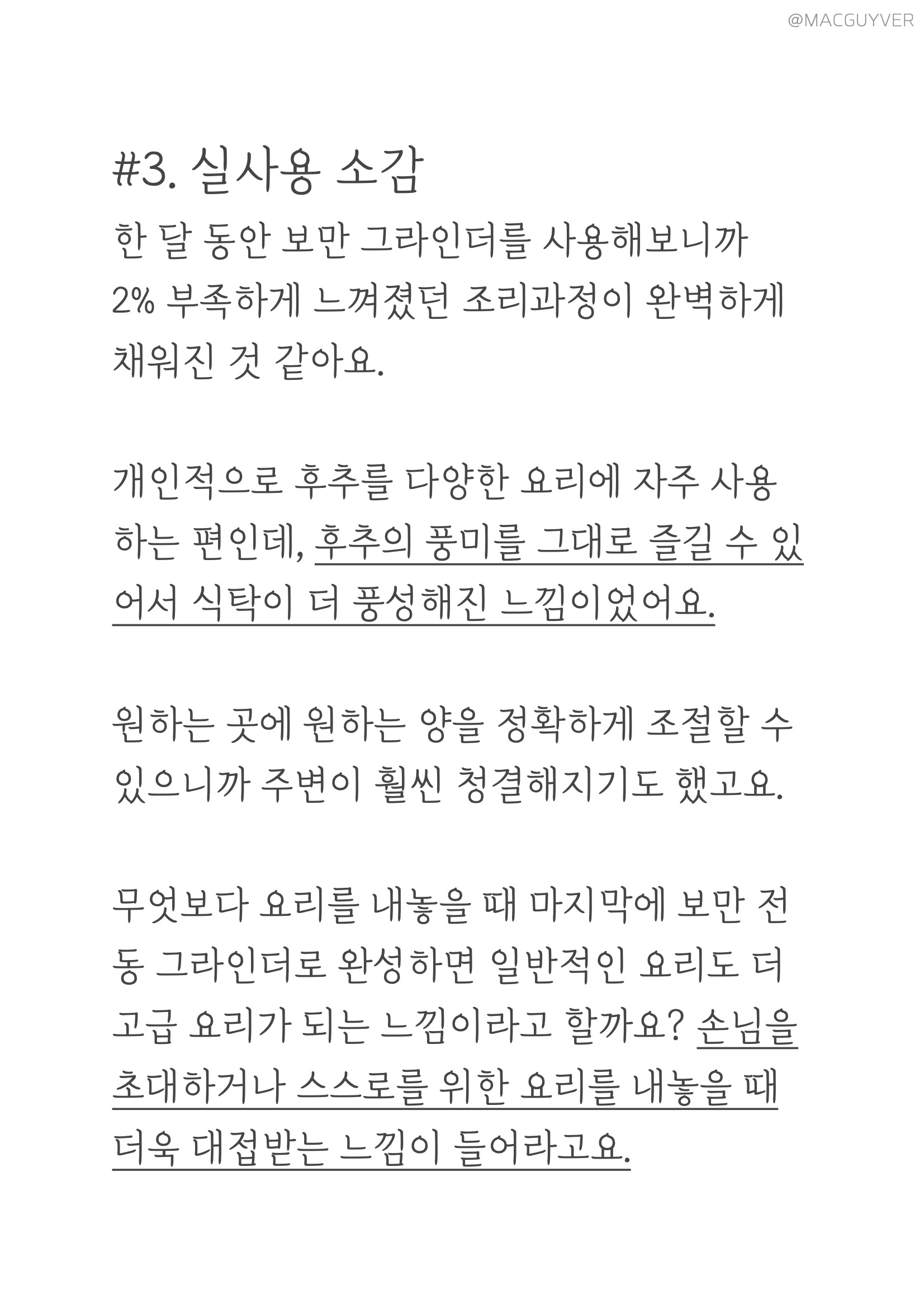 #3. 실사용 소감 한 달 동안 보만 그라인더를 사용해보니까 2% 부족하게 느껴졌던 조리과정이 완벽하게 채워진 것 같아요. 개인적으로 후추를 다양한 요리에 자주 사용하는 편인데, 보만 후추 그라인더를 사용하면 후추의 풍미를 그대로 즐길 수 있어서 식탁이 더 풍성해진 느낌이었어요. 원하는 곳에 원하는 양을 정확하게 조절할 수 있으니까 주변이 훨씬 청결해지기도 했고요. 무엇보다 요리를 내놓을 때 마지막에 보만 통후추 그라인더, 락솔트 그라인더로 완성하면 일반적인 요리도 더 고급 요리가 되는 느낌이라고 할까요? 손님을 초대하거나 스스로를 위한 요리를 내놓을 때 전동 그라인더를 사용하면 더욱 대접받는 느낌이 들어라고요. 한때 후춧가루 속에 중금속이 포함되어 있다는 뉴스로 불안했던 적도 있었는데, 이제는 통후추 그라인더, 소금 그라인도에서 깨끗한 재료를 눈으로 확인하고 먹을 수 있어서 안심이 되기도 해요. 전동 그라인더에 건전지 6개가 들어가서 그만큼의 무게감이 느껴지긴 하지만 수동 그라인더를 사용하는 것과 비교하자면 더 편리하고 빠른 사용이 가능해서 항상 사용하는 제품이 되었어요.