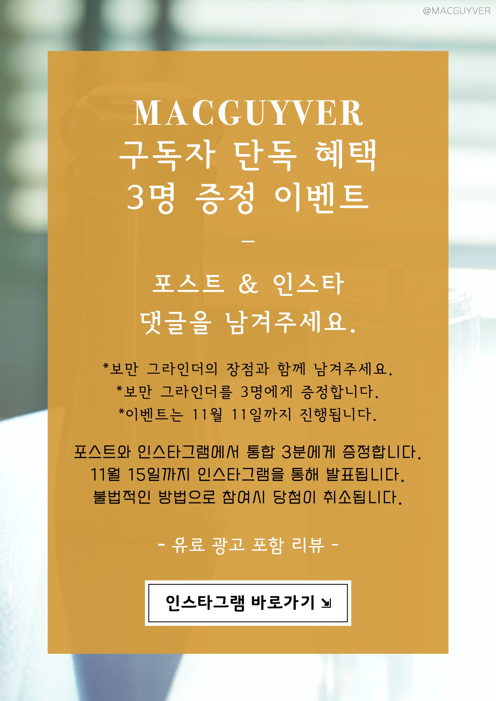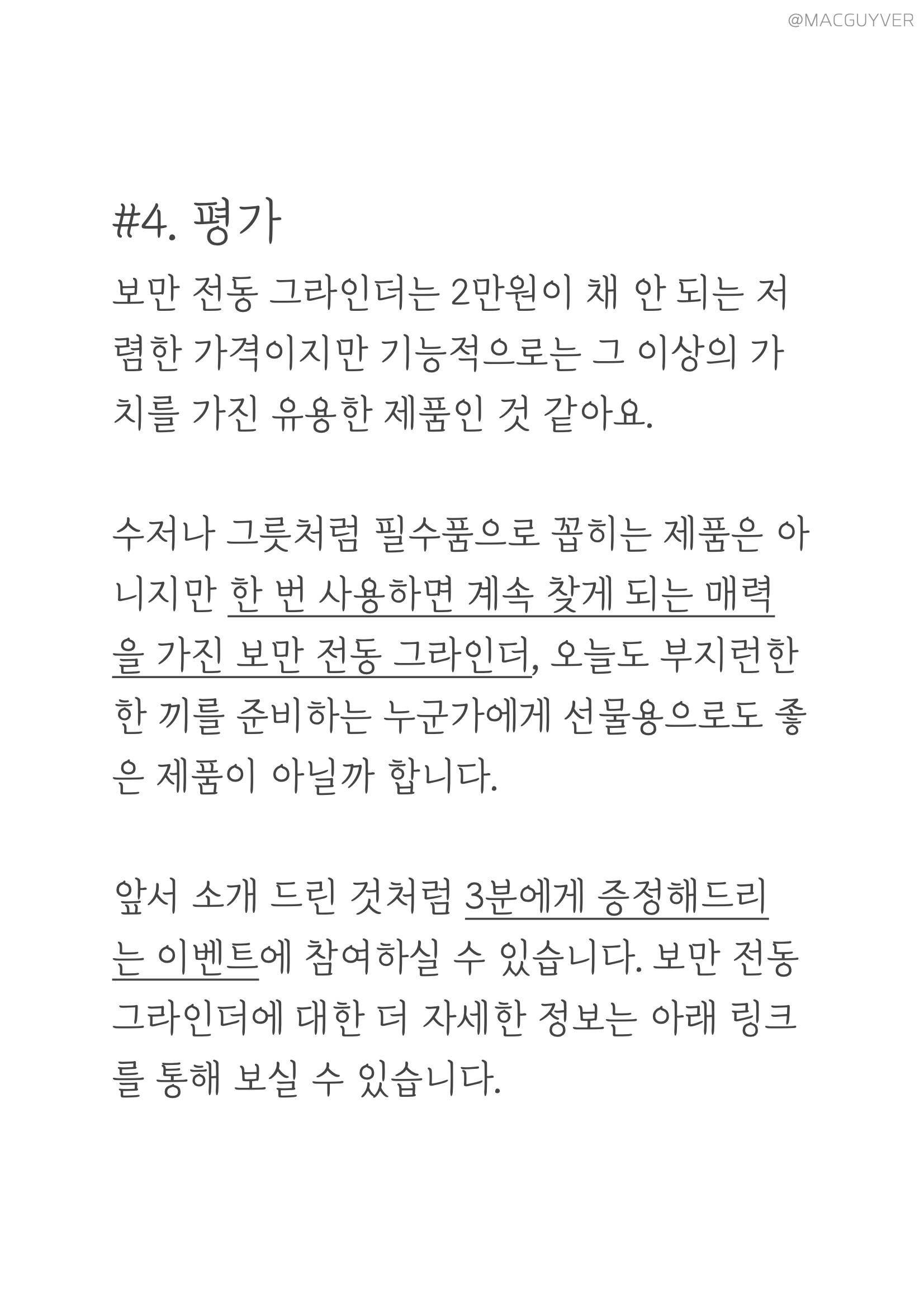 #4. 평가 보만 전동 그라인더는 2만원이 채 안 되는 저렴한 가격이지만 기능적으로는 그 이상의 가치를 가진 유용한 제품인 것 같아요. 수저나 그릇처럼 필수품으로 꼽히는 제품은 아니지만 한 번 사용하면 계속 찾게 되는 매력을 가진 보만 전동 그라인더, 오늘도 부지런한 한 끼를 준비하는 누군가에게 선물용으로도 좋은 제품이 아닐까 합니다. 앞서 소개 드린 것처럼 3분에게 보만 양념 그라인더를 증정해드리는 이벤트에 참여하실 수 있습니다. 보만 전동 그라인더에 대한 더 자세한 정보는 아래 링크를 통해 보실 수 있습니다.