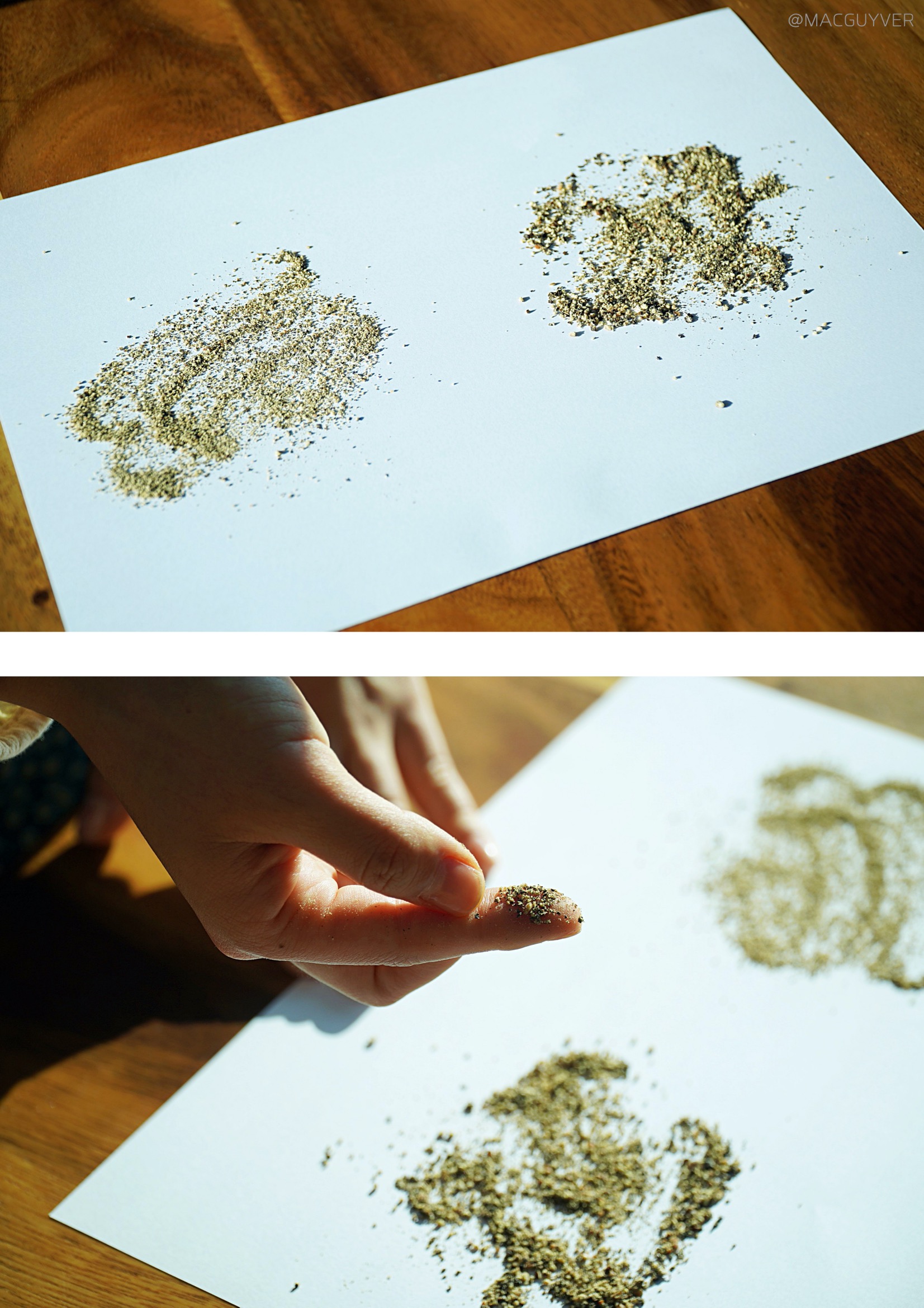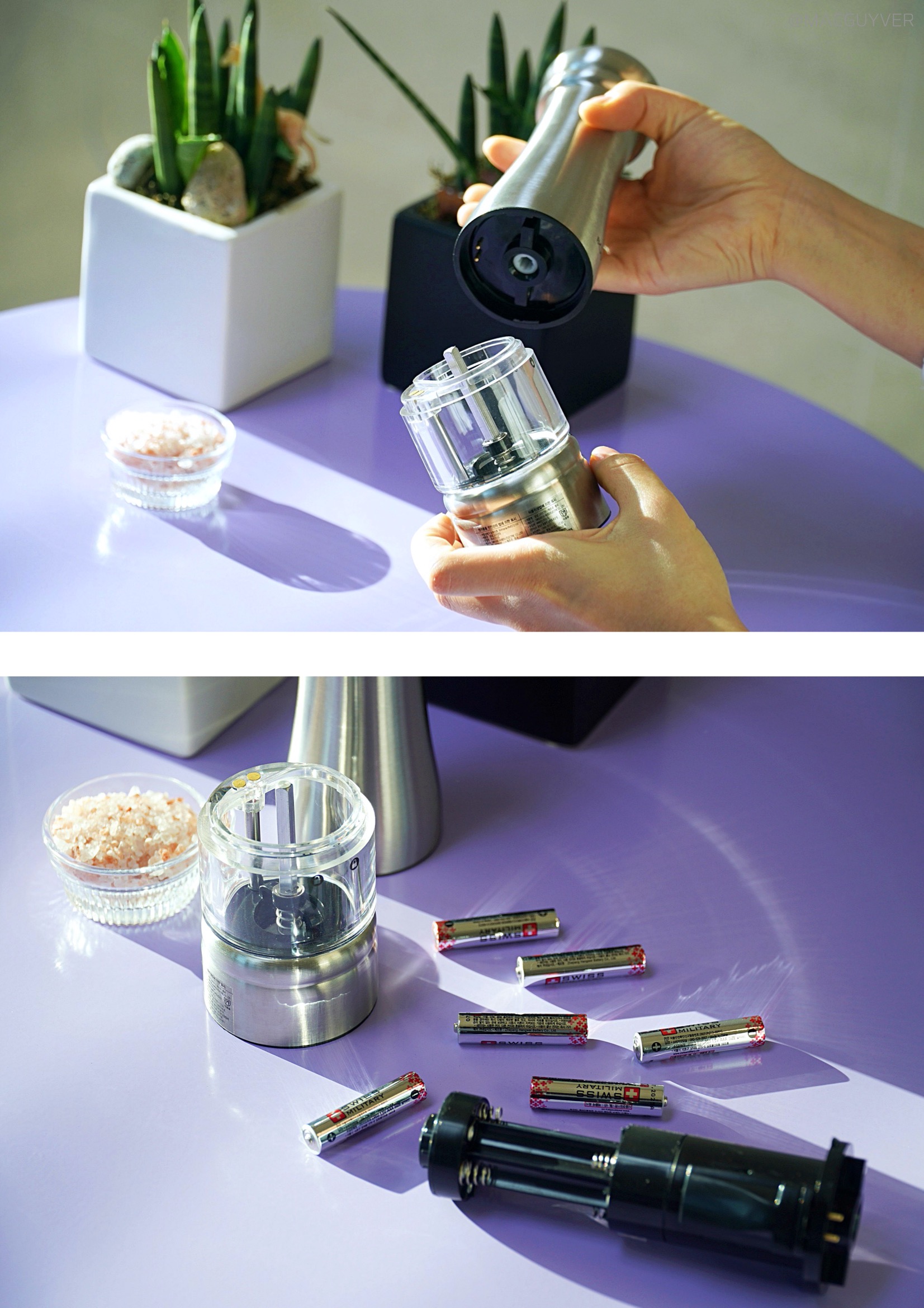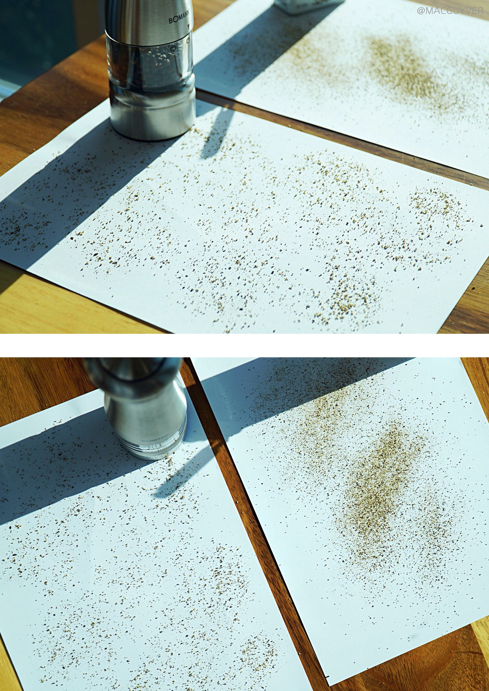 보만 양념그라인더를 사용하면 굵은 입자에서부터 고운 입자까지 6단계로 굵기 조절이 가능하니까 어떤 요리를 하느냐에 따라 다양한 굵기의 락솔트, 암염 같은 소금과 후추, 페퍼밀을 활용할 수 있어요. 통 후추 그라인더 또는 핑크소금 그라인더의 아래 입자조절부를 왼쪽으로 돌리면 입자가 굵어지고, 오른쪽으로 돌리면 더 미세한 입자가 나와요. 보이는 것처럼 입자의 굵기가 눈으로 비교가 될 정도로 차이가 있어요. 전동 그라인더 상단의 스위치를 누르면 곧바로 나올 만큼 짧은 시간 동안 미세하게 분쇄되었다는 게 신기하기도 합니다. 요리를 자주 하시는 분들은 아시겠지만 소금도 굵은소금과 고운소금에 따라 쓰임이 다른데, 이런 작은 기기로 굵은 소금과 고운 소금을 사용할 수 있다는 게 좋은 것 같아요. 보만 전동 그라인더를 시판 제품과도 비교를 했을 때 확실히 흩날림이나 뭉침 없이 원하는 대로 고르게 뿌릴 수 있어요. 거기다 LED 조명으로 밝게 비춰주고, 상단 스위치를 누르고 있는 동안은 계속 분사가 되니까 연속으로 많은 양을 사용하는 것도 가능했어요.