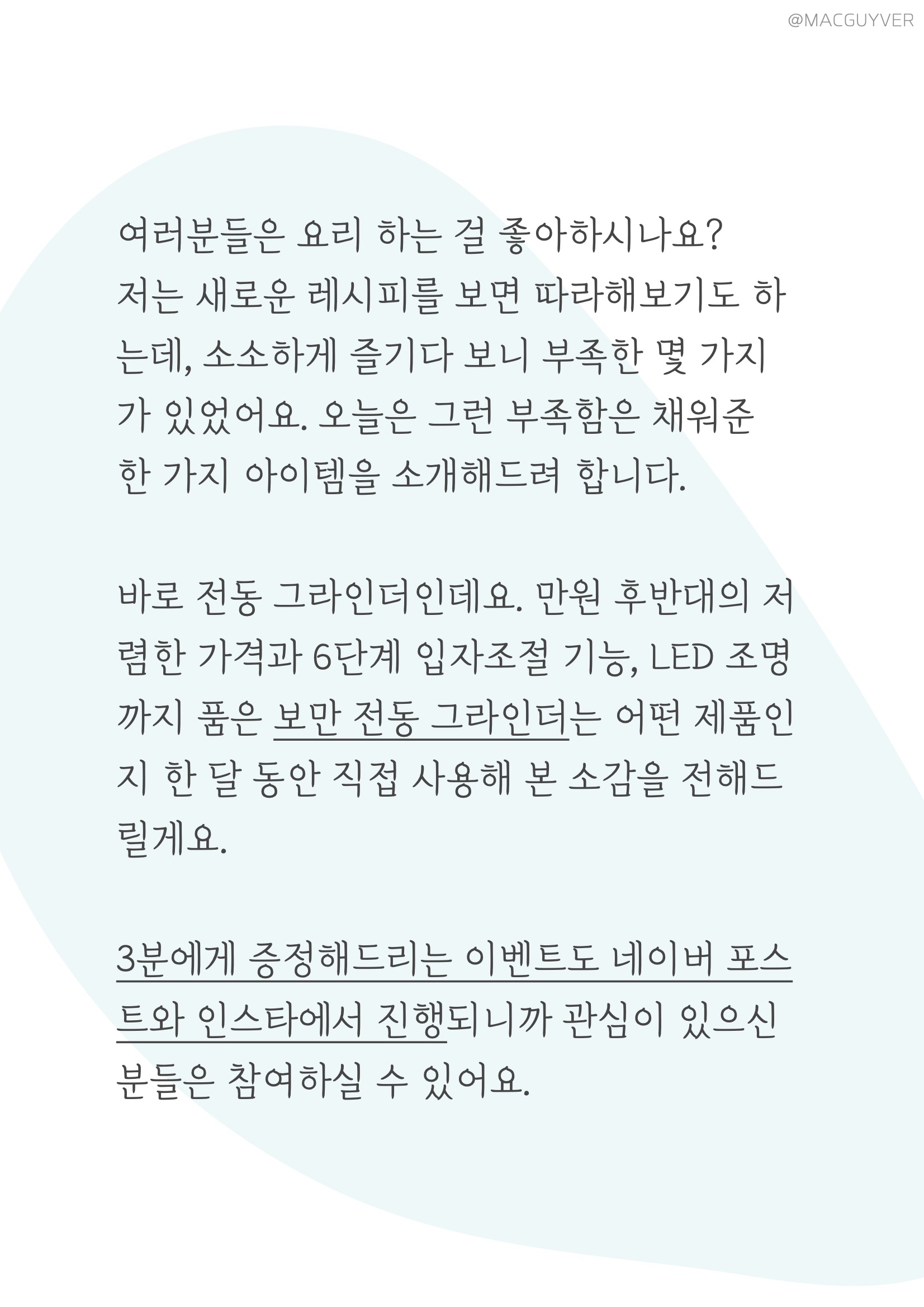 오늘은 제가 그동안 2% 부족했던 빈틈을 완벽하게 채워준 아이템을 하나 소개해드릴게요. 바로 전동 그라인더인데요. 만원 후반대의 저렴한 가격과 6단계 입자조절 기능, LED 조명까지 품은 보만 전동 그라인더 또는 보만 양념그라인더 PM5723S는 어떤 제품인지 한 달 동안 사용해 본 소감을 전해드릴게요. 3분에게 보만 양념그라인더를 증정해드리는 이벤트도 네이버 포스트와 인스타에서 진행되니까 관심이 있으신 분들은 참여하실 수 있어요.