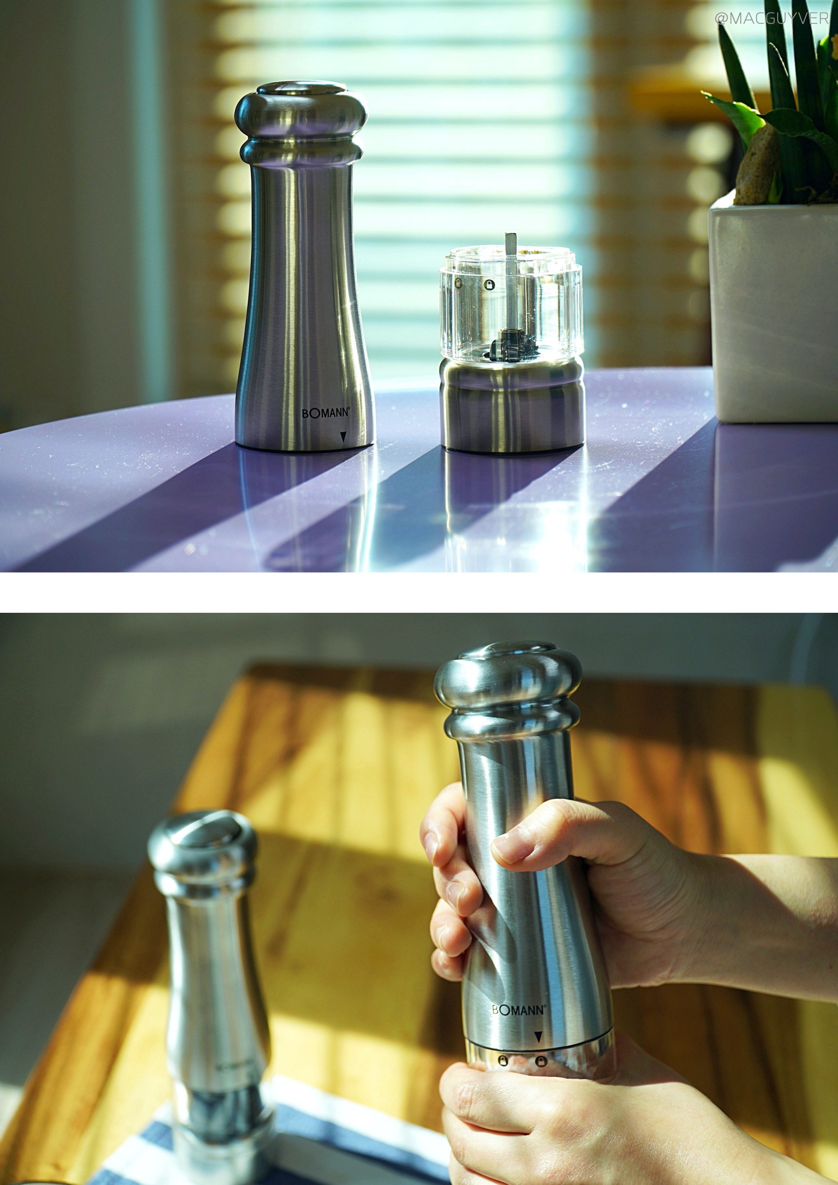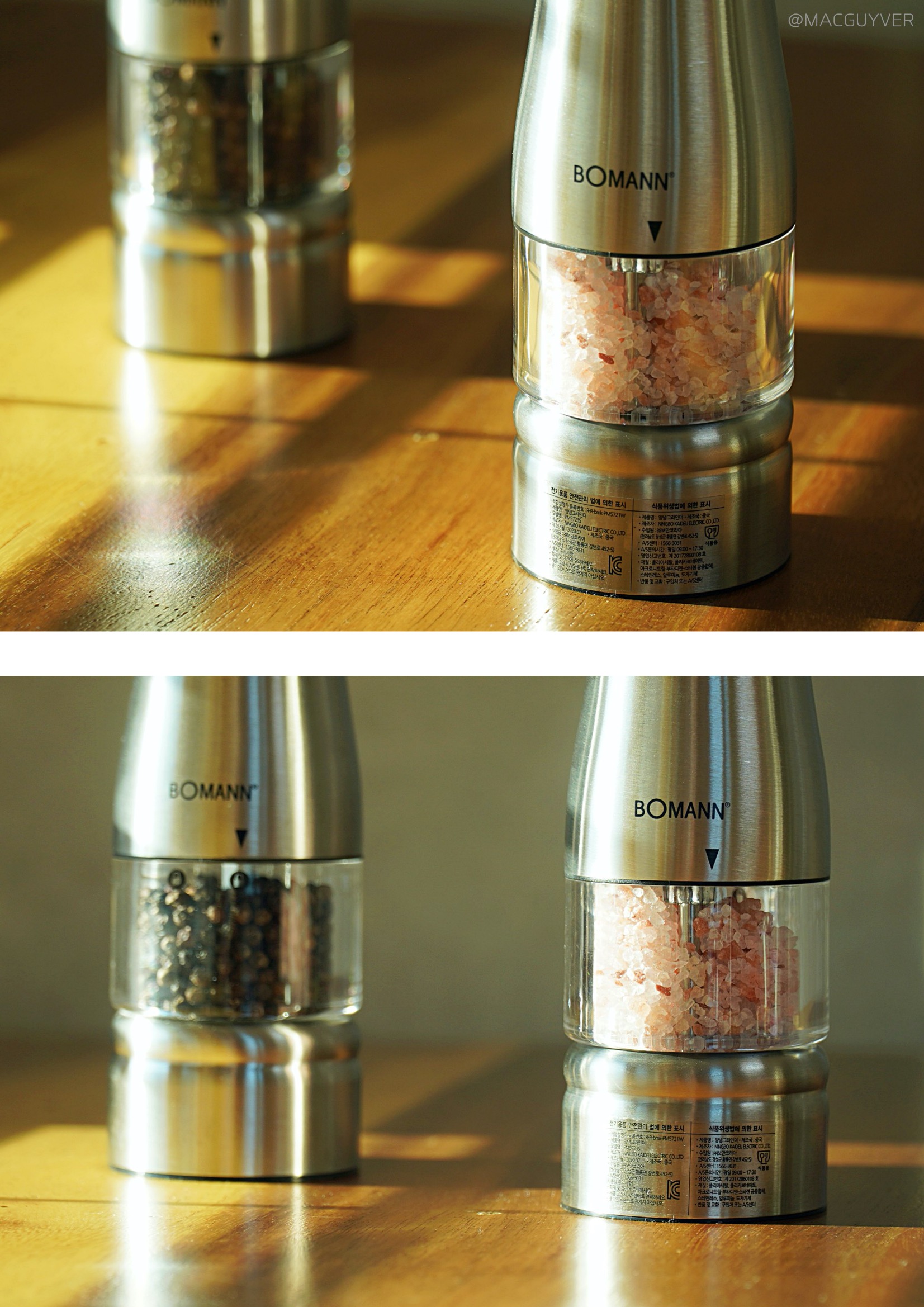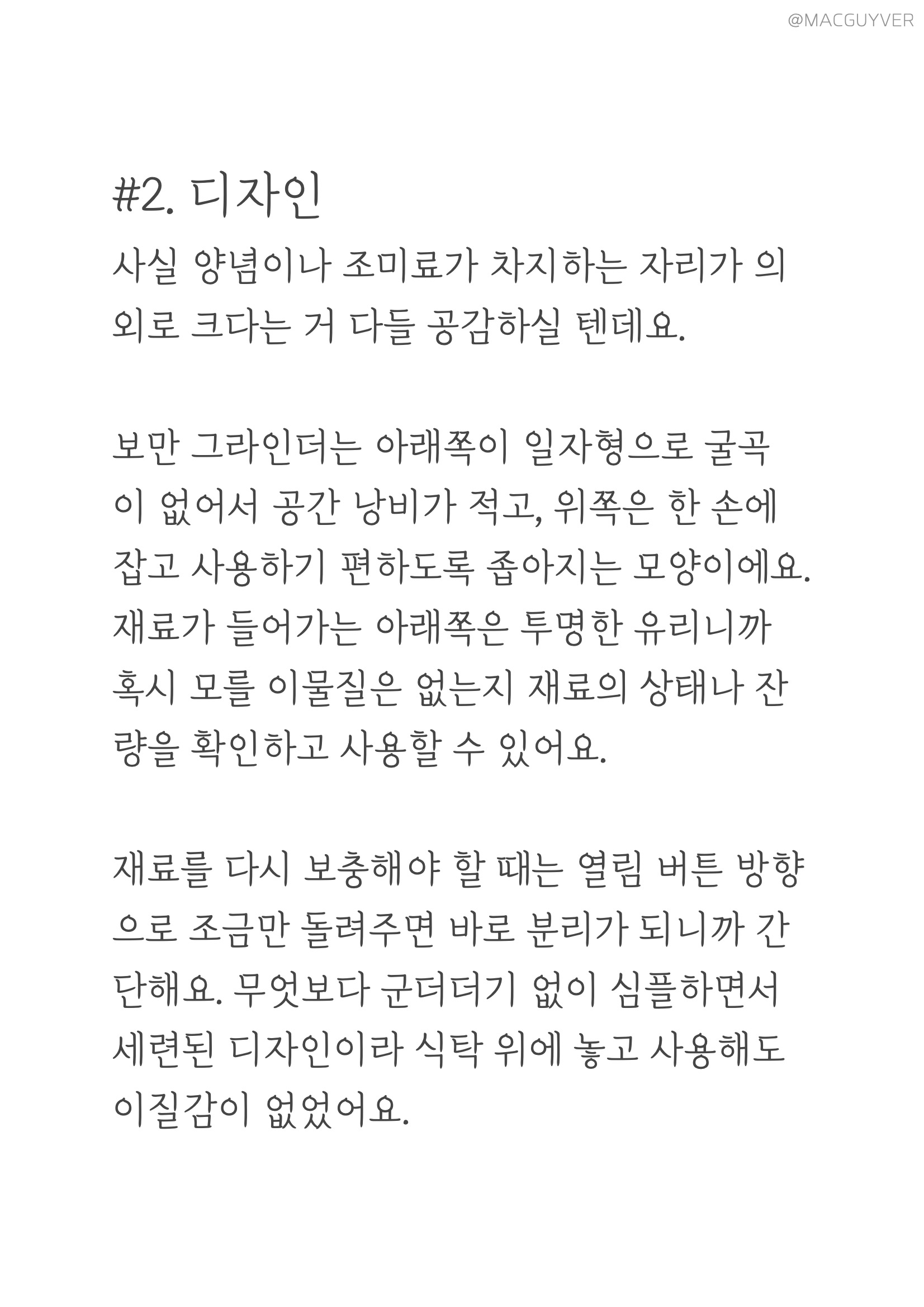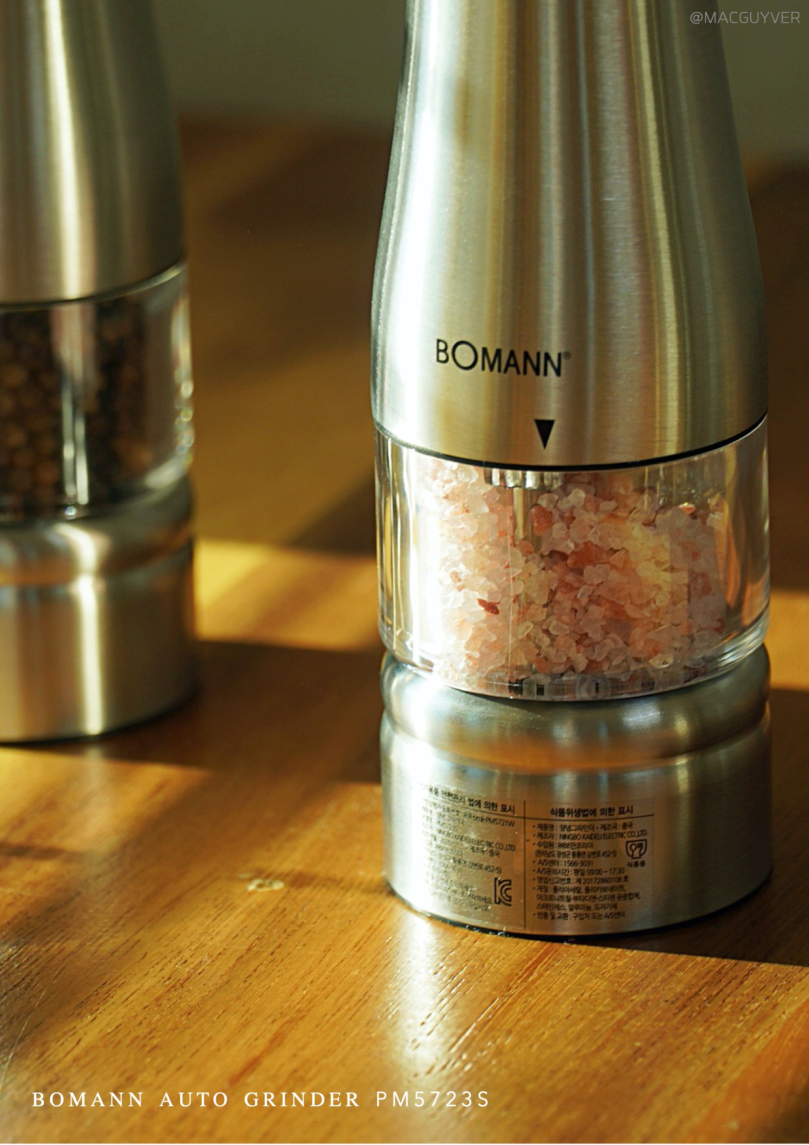 #2. 보만 그라인더 디자인 사실 양념이나 조미료가 차지하는 자리가 의외로 크다는 거 다들 공감하실 텐데요. 보만 그라인더는 아래쪽이 일자형으로 굴곡이 없어서 공간 낭비가 적고, 위쪽은 한 손에 잡고 사용하기 편하도록 좁아지는 모양이에요. 공간 절약과 사용성을 고려한 최적의 디자인인 것 같네요. 전동 그라인더에서 재료가 들어가는 아래쪽은 투명한 유리니까 혹시 모를 이물질은 없는지 재료의 상태나 잔량을 확인하고 사용할 수 있어요. 페퍼밀이나 소금 같은 재료를 다시 보충해야 할 때는 열림 버튼 방향으로 조금만 돌려주면 분리가 되니까 간단해요. 무엇보다 보만 그라인더 PM5723S가 군더더기 없이 심플하면서 세련된 디자인이라 식탁 위에 놓고 사용해도 이질감이 없었어요. 스테인리스 소재의 견고한 느낌과 내구성, 부드러운 그립감도 좋고요.