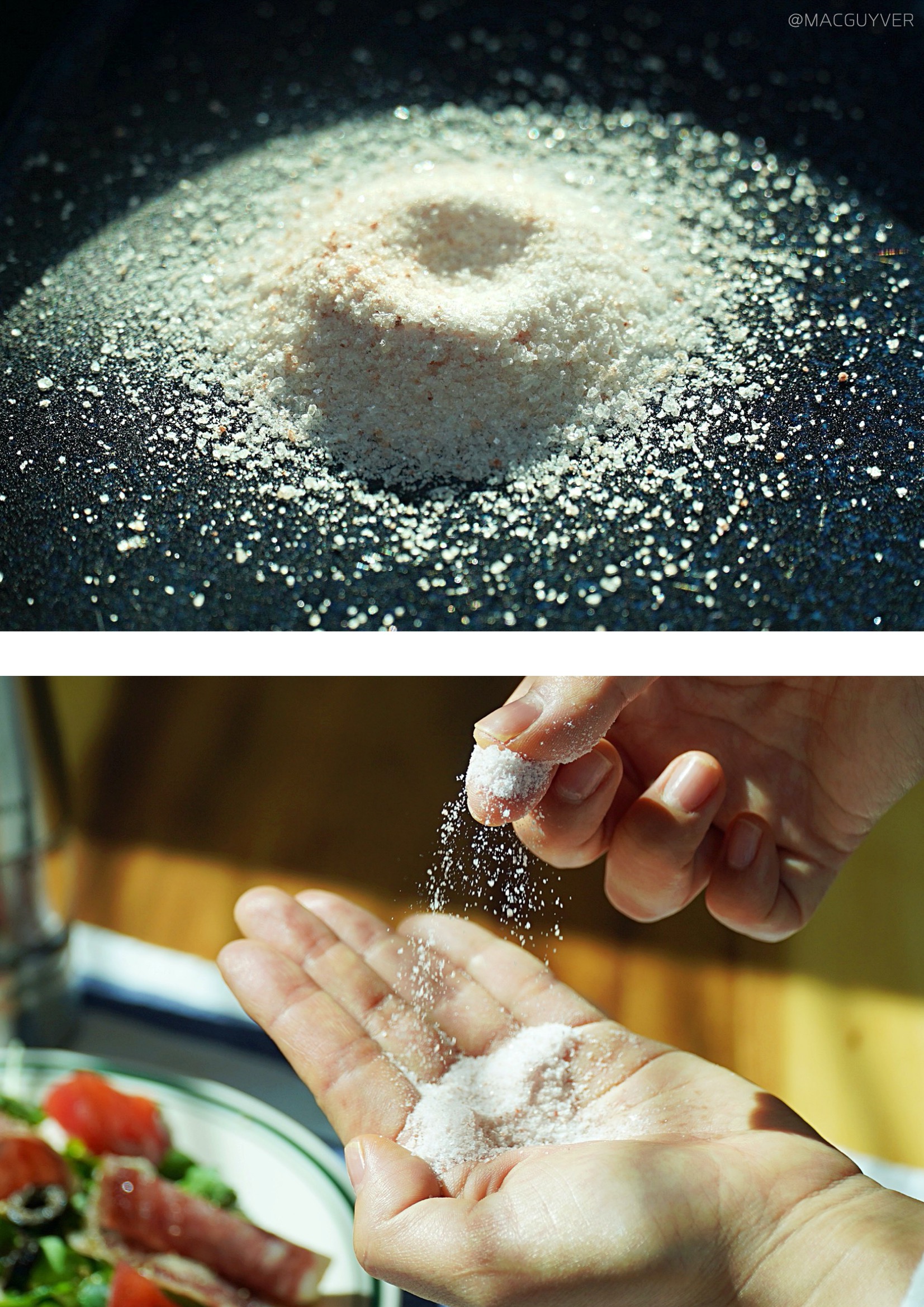 보만 양념그라인더를 사용하면 굵은 입자에서부터 고운 입자까지 6단계로 굵기 조절이 가능하니까 어떤 요리를 하느냐에 따라 다양한 굵기의 락솔트, 암염 같은 소금과 후추, 페퍼밀을 활용할 수 있어요. 통 후추 그라인더 또는 핑크소금 그라인더의 아래 입자조절부를 왼쪽으로 돌리면 입자가 굵어지고, 오른쪽으로 돌리면 더 미세한 입자가 나와요. 보이는 것처럼 입자의 굵기가 눈으로 비교가 될 정도로 차이가 있어요. 전동 그라인더 상단의 스위치를 누르면 곧바로 나올 만큼 짧은 시간 동안 미세하게 분쇄되었다는 게 신기하기도 합니다. 요리를 자주 하시는 분들은 아시겠지만 소금도 굵은소금과 고운소금에 따라 쓰임이 다른데, 이런 작은 기기로 굵은 소금과 고운 소금을 사용할 수 있다는 게 좋은 것 같아요. 보만 전동 그라인더를 시판 제품과도 비교를 했을 때 확실히 흩날림이나 뭉침 없이 원하는 대로 고르게 뿌릴 수 있어요. 거기다 LED 조명으로 밝게 비춰주고, 상단 스위치를 누르고 있는 동안은 계속 분사가 되니까 연속으로 많은 양을 사용하는 것도 가능했어요.