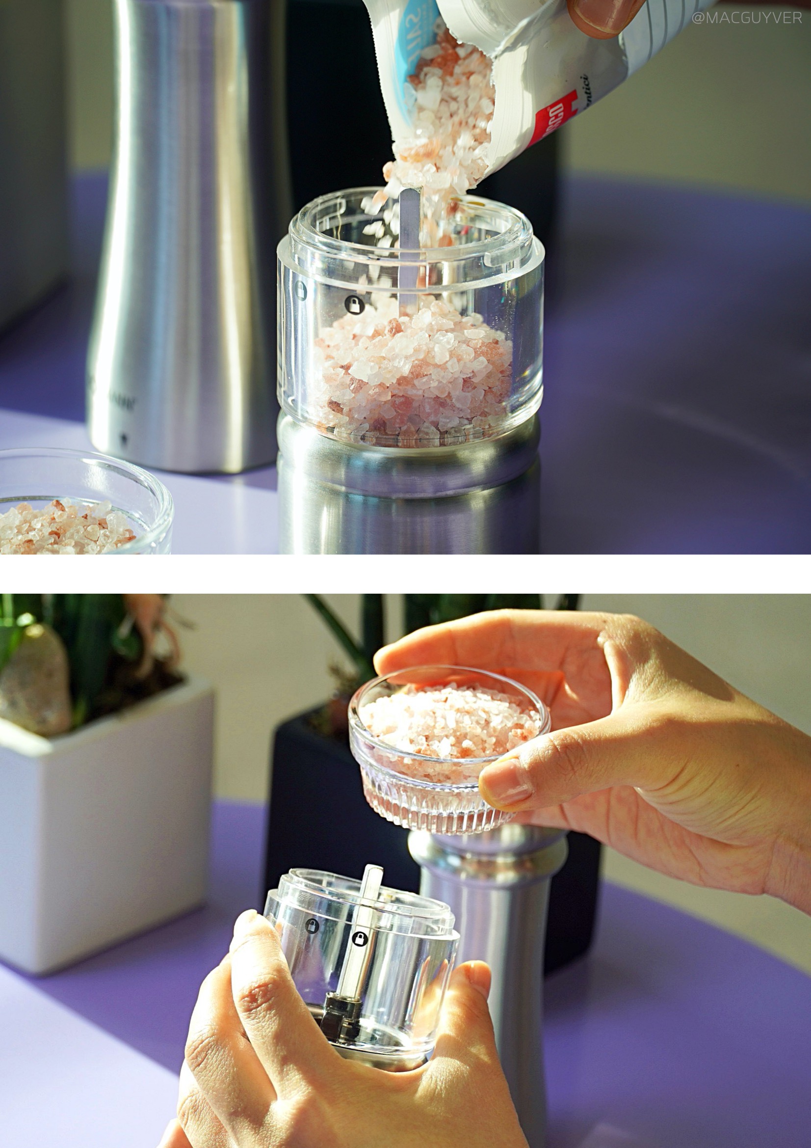 #2. 보만 그라인더 디자인 사실 양념이나 조미료가 차지하는 자리가 의외로 크다는 거 다들 공감하실 텐데요. 보만 그라인더는 아래쪽이 일자형으로 굴곡이 없어서 공간 낭비가 적고, 위쪽은 한 손에 잡고 사용하기 편하도록 좁아지는 모양이에요. 공간 절약과 사용성을 고려한 최적의 디자인인 것 같네요. 전동 그라인더에서 재료가 들어가는 아래쪽은 투명한 유리니까 혹시 모를 이물질은 없는지 재료의 상태나 잔량을 확인하고 사용할 수 있어요. 페퍼밀이나 소금 같은 재료를 다시 보충해야 할 때는 열림 버튼 방향으로 조금만 돌려주면 분리가 되니까 간단해요. 무엇보다 보만 그라인더 PM5723S가 군더더기 없이 심플하면서 세련된 디자인이라 식탁 위에 놓고 사용해도 이질감이 없었어요. 스테인리스 소재의 견고한 느낌과 내구성, 부드러운 그립감도 좋고요.