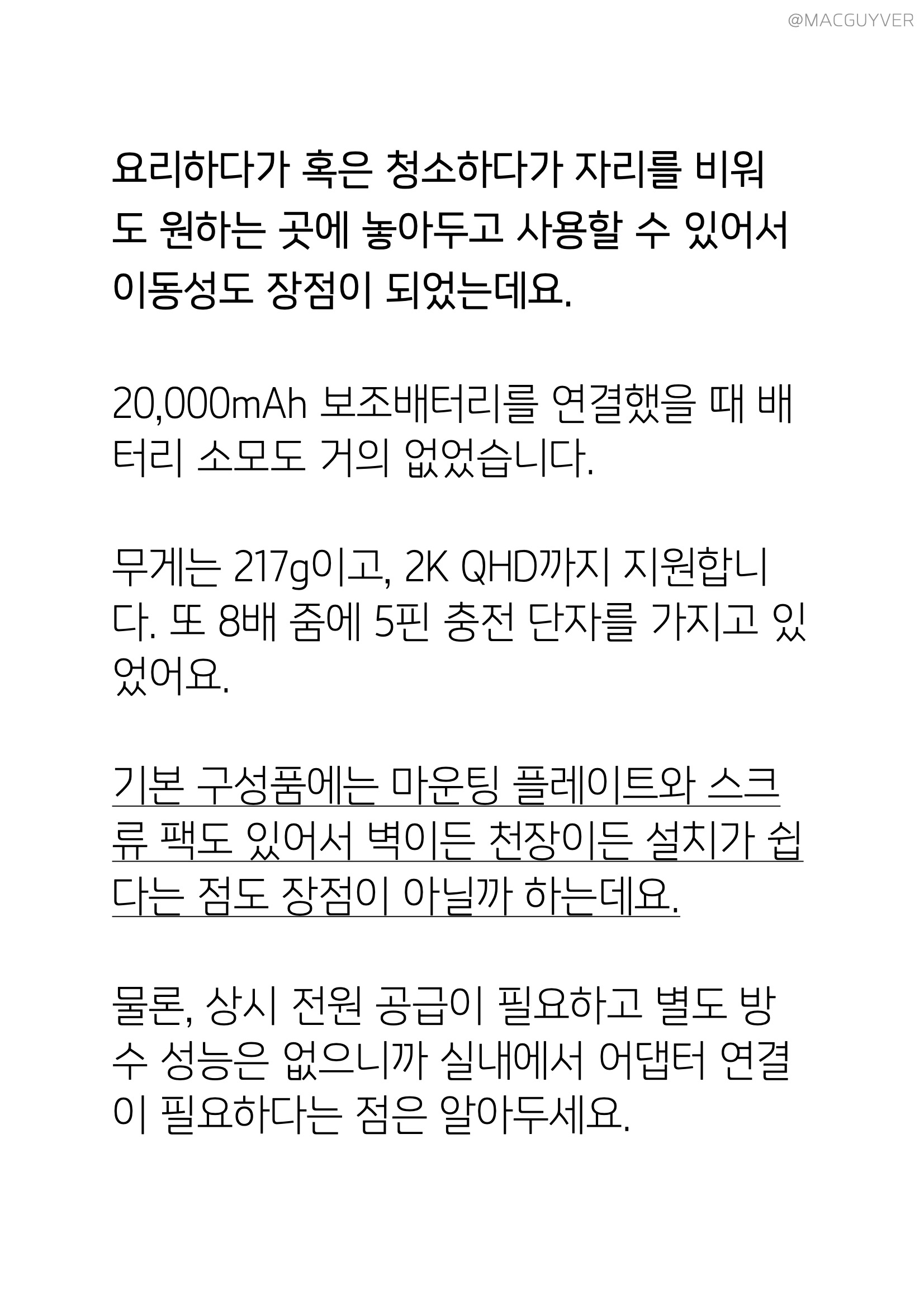 #. 기타 유용한 기능 가운데 양방향 음성 대화도 있는데요. 기본적으로 앱을 실행하고 실시간 화면을 보는 상황에서는 카메라가 촬영하는 화면과 소리를 실시간으로 들려줍니다. 추가적으로 마이크 버튼을 눌러서 스마트 홈 카메라에서 목소리가 나오게 할 수도 있는데요. 그래서 홈 CCTV로 아이와 인사하거나 위험을 알려주거나 강아지와 대화하는 것도 가능한 거죠. 이외에도 화질 설정이나 녹화, 스피커, 개인화 설정도 디테일해서 만족스럽기도 하더라고요. 참고로, micro SD 카드가 있거나 클라우드 서비스를 활용해야 Eufy 홈카메라로 실시간 상시 녹화가 가능한데요. 최대 128GB micro SD 카드를 인식하고, 7일 밤낮으로 녹화가 가능했습니다. 아쉬움은 용량을 비워줘야 한다는 점인데요. 보안카메라의 용량이 모두 차면 오래된 촬영 파일을 지우고 다시 촬영하는 게 아니라 앱에서 포맷을 누르고, 다시 녹화를 해줘야 하니까 번거로운 거죠. 대신 클라우드 서비스는 최대 30일까지 저장이 가능한 기본 스토리지 플랜이 매월 2.99달러 혹은 매년 29.99달러니까 어디서나 최대 30일 단위로 저장이 가능한 플랜을 사용하는 것도 나쁘지 않아 보입니다. 왜냐하면, 누군가 침입하거나 기기를 손상시키더라도 바로 그 순간부터 이전 30일까지 모든 영상이 클라우드에 저장되니까 안심이 되기 때문인데요. 이외에도 Eufy 홈카메라는 상시 전원 모델로 어댑터 연결이 필요하지만 보조배터리를 연결하니까 어디서나 사용이 가능했어요. 요리하다가 혹은 청소하다가 자리를 비워도 원하는 곳에 놓아두고 사용할 수 있어서 이동성도 장점이 되었는데요. 배터리도 20,000mAh 보조배터리를 연결했을 때 거의 소모가 없어서 신기하기도 했거든요.