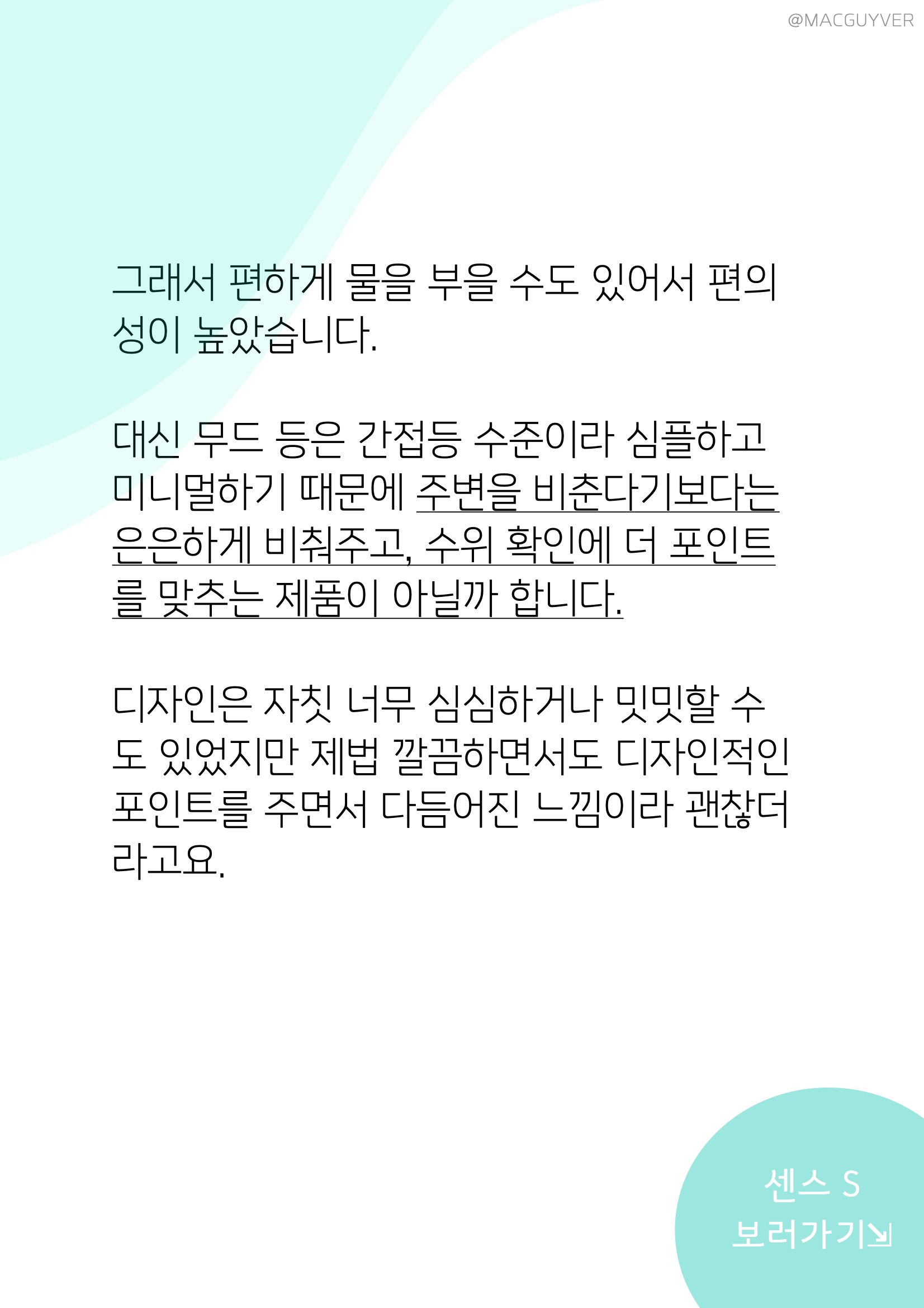 디자인도 관전 포인트가 되는데요. 사실 이제는 눈으로 보는 가전이라는 말도 있을 정도로 인테리어 소품용으로, 그리고 눈으로 볼 때 만족스러운 디자인이 인기를 끌고 있거든요. 그 점에서 오아 센스 가습기는 잔량 확인도 간단했고, 전체적으로 군더더기가 없는 디자인이라 더 깔끔하다는 점이 만족스럽더라고요. 확실히 미니멀리즘하고 심플해서 어디에 놓아도 잘 어울리기도 했고 오아 가습기가 단순한 아름다움이 느껴져서 질리지 않는다는 점도 장점이 되어줬습니다. 거기다 물이 묻어도 안심이 되는 무선 가습기의 꼼꼼한 마감으로 안심하고 사용할 수 있는 제품이기도 했습니다.