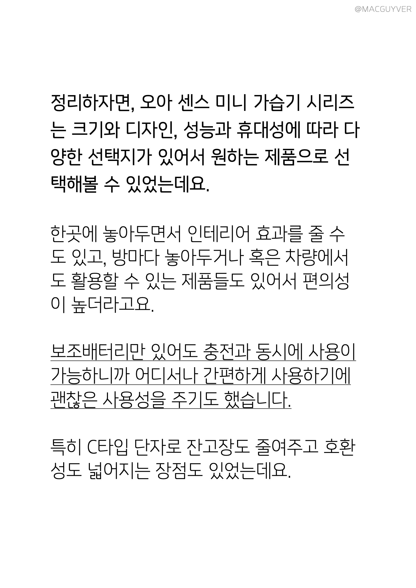 미니 가습기 추천 가습기 추천글을 정리하자면, 오아 센스 미니 가습기 시리즈는 크기와 디자인, 성능과 휴대성에 따라 다양한 선택지가 있어서 원하는 제품으로 선택해볼 수 있었는데요. 한곳에 놓아두면서 인테리어 효과를 줄 수도 있고, 방마다 놓아두거나 혹은 차량에서도 활용할 수 있는 제품들도 있어서 편의성이 높더라고요. 보조배터리만 있어도 오아 미니 가습기를 충전과 동시에 사용이 가능하니까 어디서나 간편하게 사용하기에 괜찮은 사용성을 주기도 했습니다. 특히 오아 센스 가습기는 C타입 단자로 잔고장도 줄여주고 호환성도 넓어지는 장점도 있었는데요. 기본기에 충실하면서 디자인도 예쁘고 다양한 선택지를 가진 이 오아 미니 가습기가 궁금하신 분들은 아래 배너를 통해 알아보실 수 있습니다. 미니 가습기 추천 또한 앞서 소개 드린 것처럼 4분에게 각각 하나씩 증정해드릴 예정이기 때문에, 원하시는 모델과 그 이유를 남겨주세요. 4대 모두 참여를 원하실 경우 각각 댓글을 남겨주시면 됩니다.