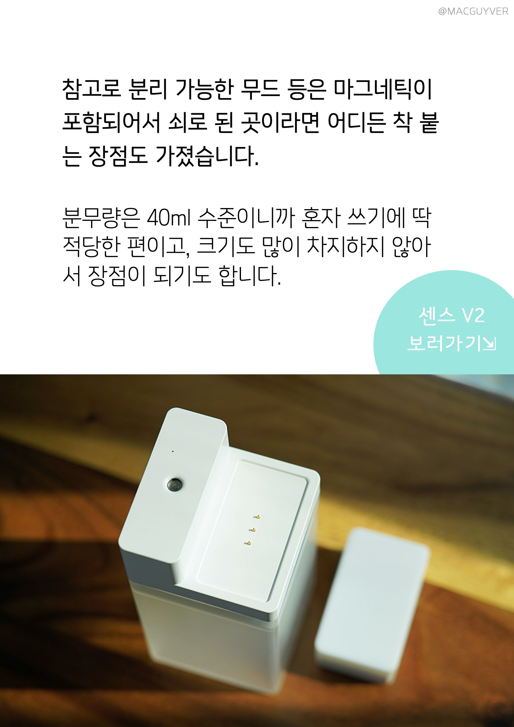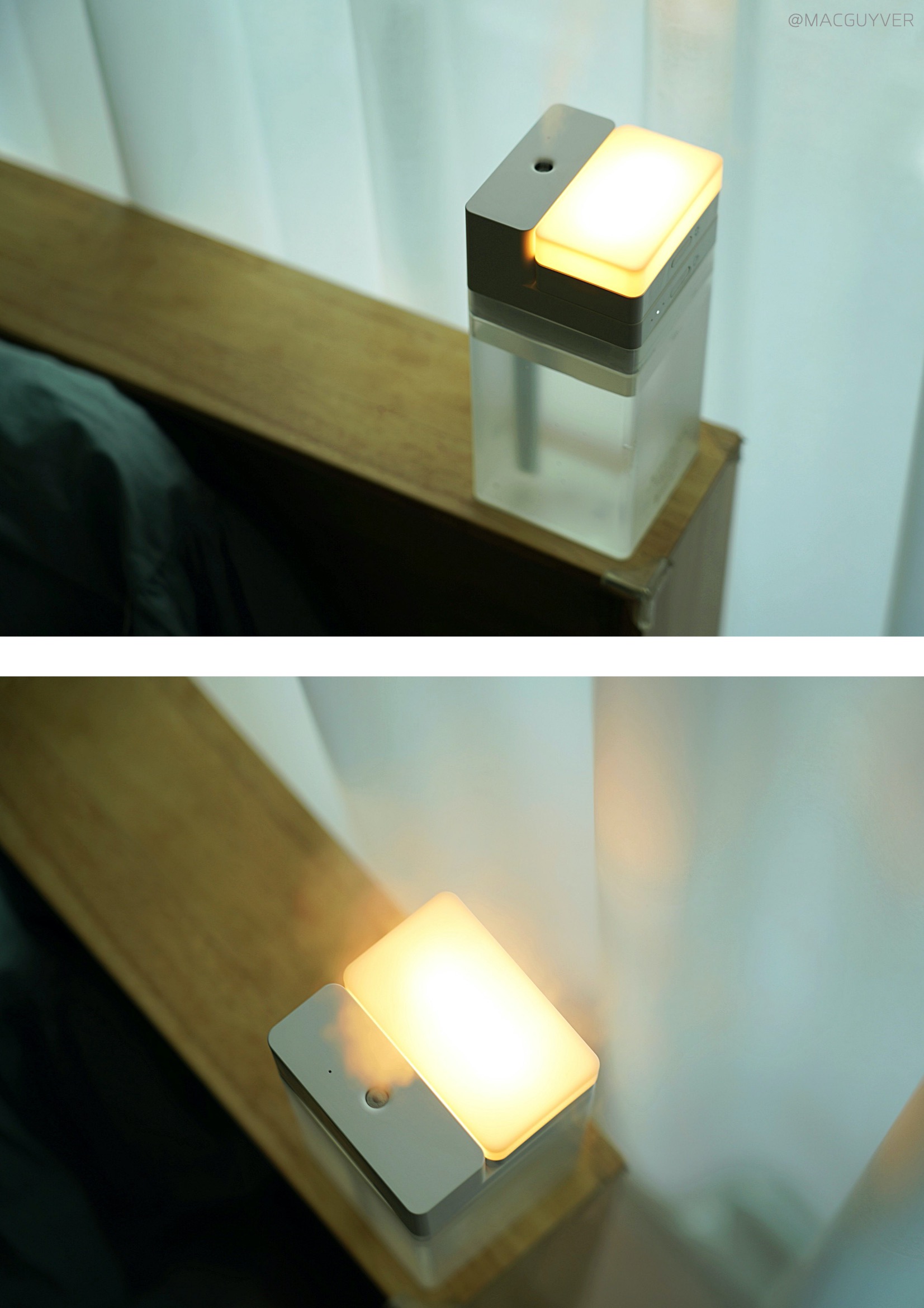 오아 센스 V2 가습기는 모듈형이라는 독특함을 가지고 있는데요. 물리 버튼으로 누르는 방식이라 조금 더 명확하고, LED가 흰색 혹은 주황색으로 바뀌니까 원하는 컬러로 선택할 수도 있더라고요. 무선 가습기가 층층이 쌓인 것처럼 보이는 모듈형 디자인이지만 복잡하지 않게 절제된 느낌도 인상적이고, 속이 잘 보여서 확인이 쉽다는 점도 장점이었습니다. 하지만 확실히 LED를 분리할 수 있다는 게 최대 장점이 아닐까 싶거든요. 원할 때 미니 가습기를 분리해서 필요한 곳을 비추는 조명으로 사용하거나 다양한 활용도 할 수 있더라고요. 물론 오아 센스 가습기를 분리할 때 접점 부분이 드러나니까 물이 묻어도 괜찮을지 걱정이 되기는 했습니다. 참고로 분리 가능한 무드 등은 마그네틱이 포함되어서 쇠로 된 곳이라면 어디든 착 붙는 장점도 가졌습니다. 분무량은 40ml 수준이니까 혼자 쓰기에 딱 적당한 편이고, 크기도 많이 차지하지 않아서 장점이 되기도 합니다.