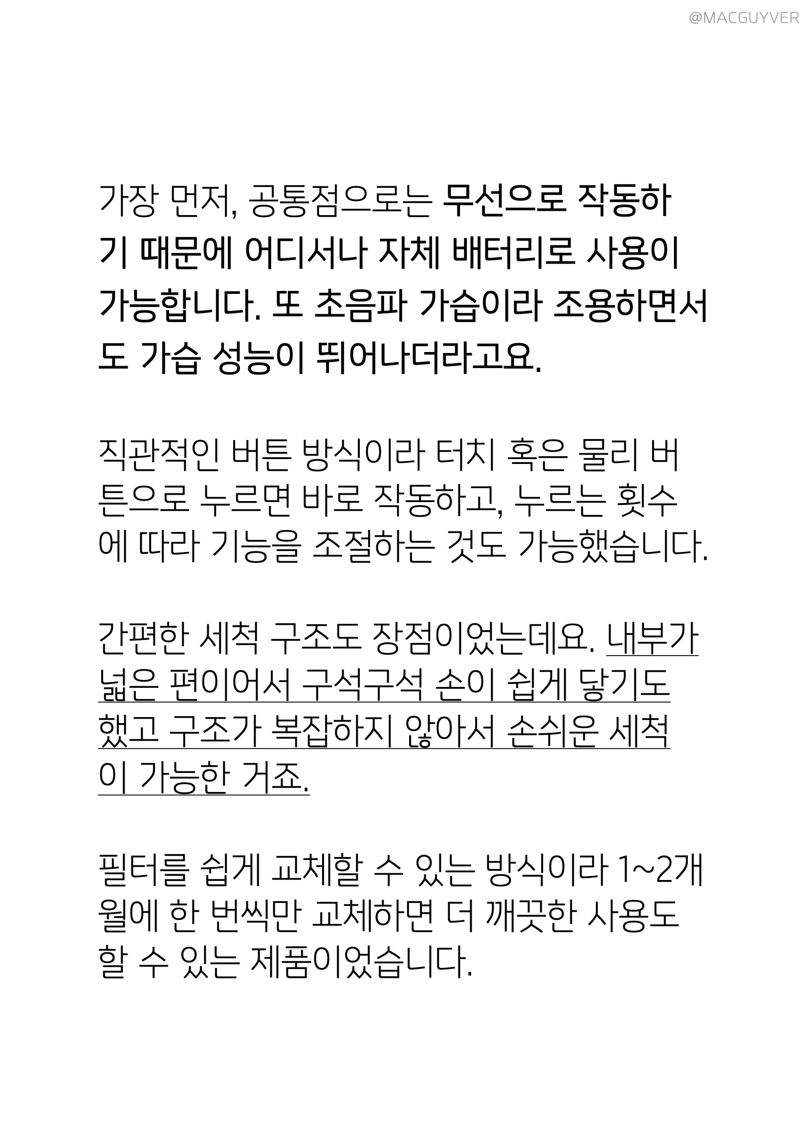 가습기 추천 벌써 가습기의 계절이 돌아오면서 많은 분들이 가습기를 찾으시는 것 같습니다. 특히 휴대가 가능하고 배터리도 자체로 탑재한 미니 가습기를 찾는 분들도 많으신데요. 이번에 살펴본 제품은 모두 4종으로 디자인이 독특하고 크기도 달라서 취향이나 목적에 따라 선택이 가능할 것 같거든요. 그러면, 오아 센스 가습기 시리즈는 어떤 제품이었을지 하나씩 살펴본 소감을 전해드리겠습니다. 참고로 이번 무선 가습기 리뷰에서는 댓글 이벤트로 각 제품별 1대씩 총 4대를 증정해드릴 예정이니까 이벤트에도 참여해보실 수 있습니다. 가장 먼저, 공통점으로는 무선으로 작동하기 때문에 어디서나 자체 배터리로 사용이 가능합니다. 또 초음파 가습이라 조용하면서도 가습 성능이 뛰어나더라고요. 오아 가습기는 직관적인 버튼 방식이라 터치 혹은 물리 버튼으로 누르면 바로 작동하고, 누르는 횟수에 따라서 기능을 조절하는 것도 가능했습니다. 무선 가습기의 간편한 세척 구조도 장점이었는데요. 내부가 넓은 편이어서 손이 쉽게 닿기도 했고 구조가 복잡하지 않아서 손쉬운 세척이 가능한 거죠. 필터를 쉽게 교체할 수 있는 방식이라 1~2개월에 한 번씩만 교체하면 더 깨끗한 사용도 할 수 있는 제품이었습니다.