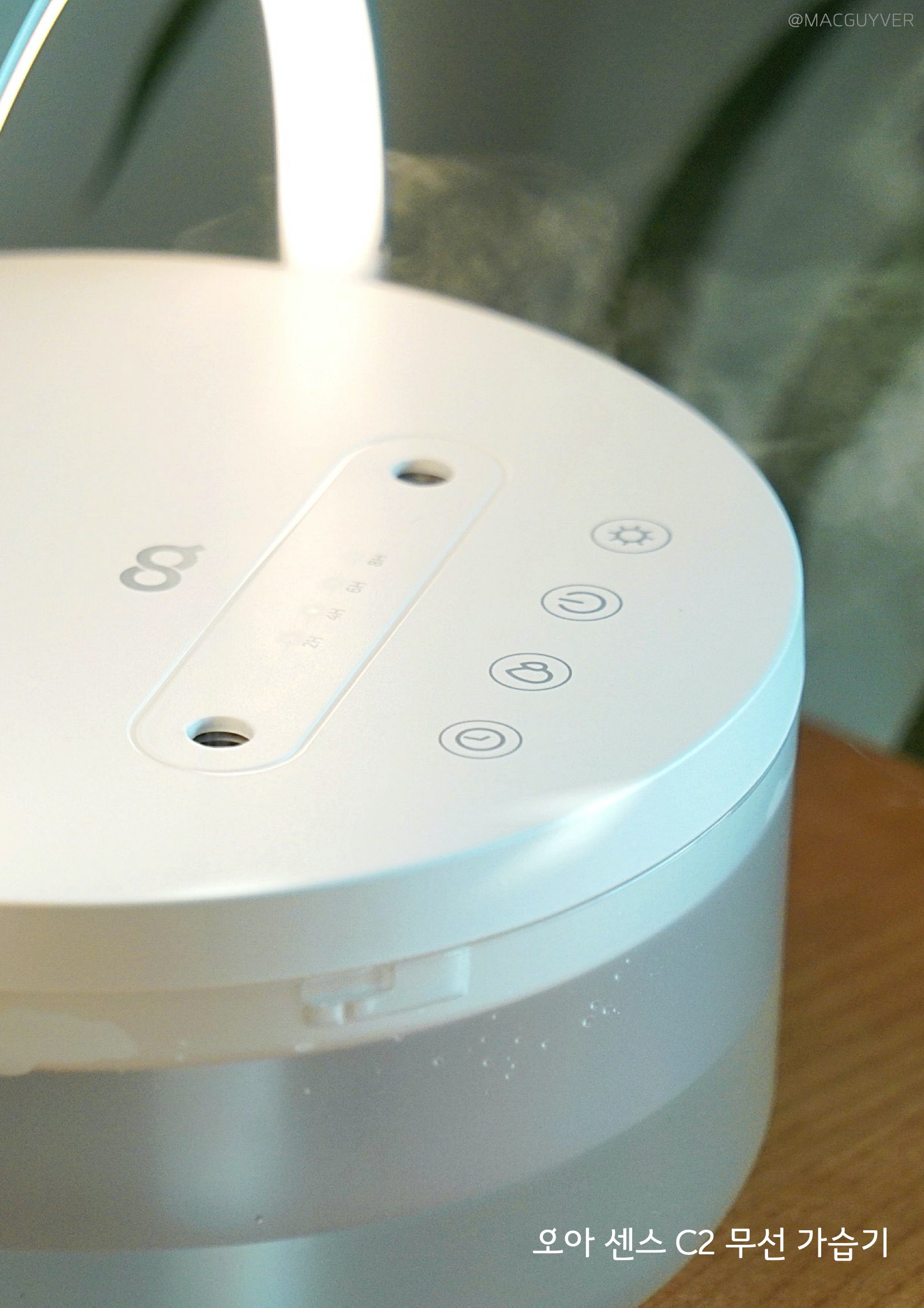 오아 센스 C2 가습기의 경우는 작은 애들 가운데 가장 큰 제품으로, 용량이 무려 1.2L에 달하니까 장시간 사용도 거뜬했어요. 약 모드에서 6시간까지 사용이 가능했고, 강 모드에서는 3시간까지 사용할 수 있었는데요. 기기 무게도 443g으로 적당한 편이라 부담 없는 사용이 장점이 되더라고요. 확실히 수조의 용량이 큰 제품답게 회전해서 고정하는 방식으로 실수로 열리지 않도록 설계된 점도 인상적이었습니다. 거기다 손잡이 부분이 은은하게 빛이 나니까 3단계 밝기 조절까지 고려하자면 인테리어 효과로도 상당히 큰 장점이 될 것 같기도 합니다. 무선 가습기에 2개의 분사구를 가졌고, 버튼도 가장 많아서 보다 쉽게 직관적으로 조작할 수 있는 모델이었는데요. 미니 가운데 큰 편이라 놓는 곳에 공간이 필요하다는 점은 알아둘 필요가 있을 것 같습니다. 참고로 분무량은 센스S 제품과 같은 시간당 최대 80ml라서 넉넉한 편입니다. 미니 가습기 손잡이는 각도를 다양하게 해서 조명 효과를 제대로 경험하는 것도 가능하고, 이동할 때 조금 더 쉽고 안전하게 옮길 수 있다는 점도 장점이 되어줬습니다.