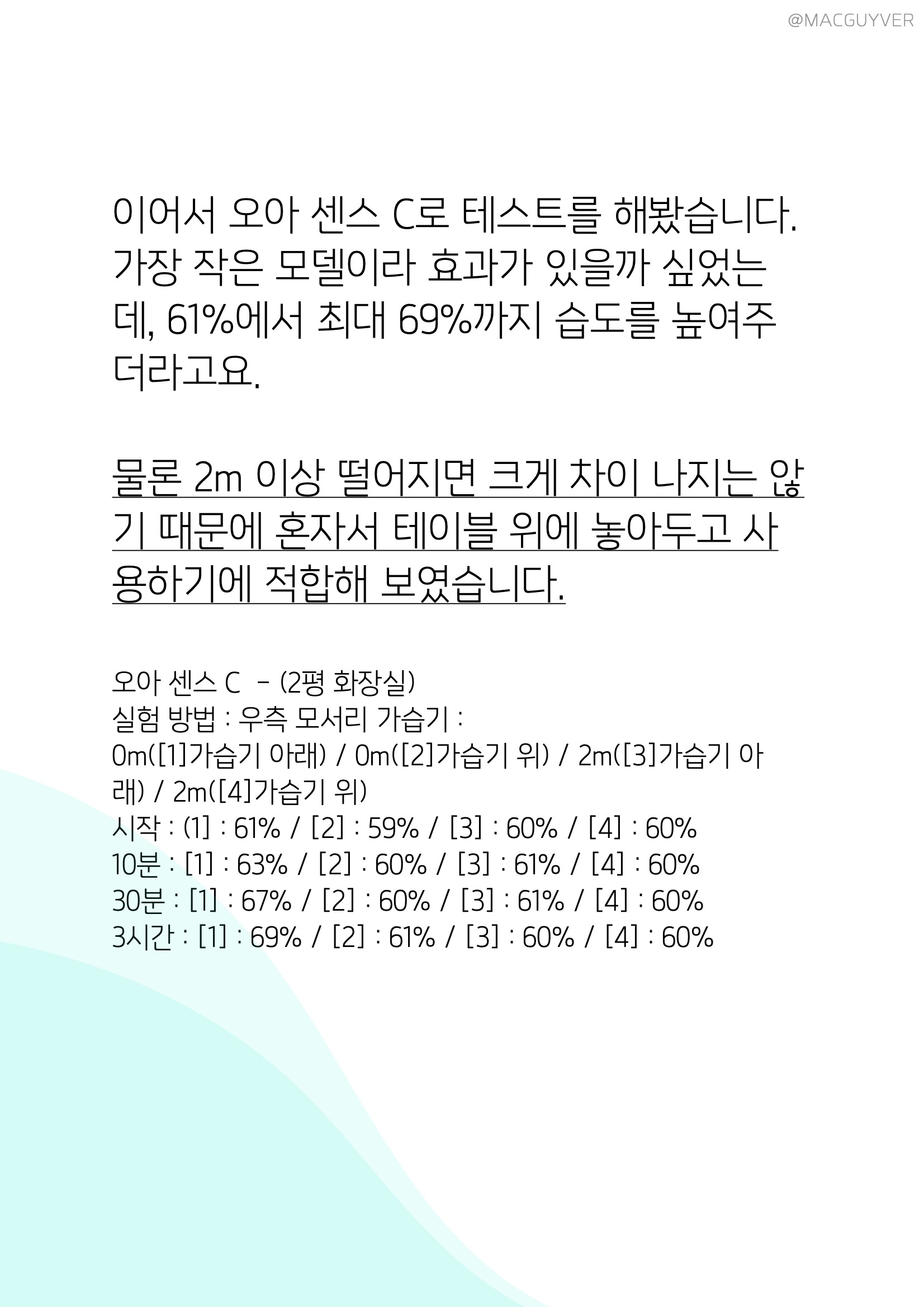 실제로 습도 테스트기로오아 미니 가습기 가습량 실험도 해봤습니다. 오아 센스 C2 가습기 모델로 해보니까 30분 만에 제법 습도가 올라갔고, 3시간이 지나니까 습도가 더 많이 올라가는 모습을 볼 수 있더라고요. 오아 센스 C2 - 듀얼 모드 (5평방) 실험 방법 : 우측 모서리 가습기 : 0m / 2m / 4m / 대각선 5m 시작 : (0m : 57%) / (2m : 57%) / (4m : 57%) / (5m : 57%) 10분 : (0m : 58%) / (2m : 57%) / (4m : 57%) / (5m : 57%) 30분 : (0m : 60%) / (2m : 59%) / (4m : 58%) / (5m : 58%) 3시간 : (0m : 62%) / (2m : 60%) / (4m : 59%) / (5m : 59%) 오아 센스 C2 - 싱글 모드 (5평방) 실험 방법 : 우측 모서리 가습기 : 0m / 2m / 4m / 대각선 5m 시작 : (0m : 58%) / (2m : 58%) / (4m : 58%) / (5m : 57%) 10분 : (0m : 59%) / (2m : 58%) / (4m : 57%) / (5m : 57%) 30분 : (0m : 59%) / (2m : 59%) / (4m : 58%) / (5m : 58%) 이어서 오아 센스 C로 테스트를 해봤습니다. 가장 작은 모델이라 효과가 있을까 싶었는데, 61%에서 최대 69%까지 습도를 높여주더라고요. 물론 2m 이상 떨어지면 크게 차이 나지는 않기 때문에 혼자서 테이블 위에 놓아두고 사용하기에 적합해 보였습니다. 오아 센스 C - (2평 화장실) 실험 방법 : 우측 모서리 가습기 : 0m([1]가습기 아래) / 0m([2]가습기 위) / 2m([3]가습기 아래) / 2m([4]가습기 위) 시작 : (1] : 61% / [2] : 59% / [3] : 60% / [4] : 60% 10분 : [1] : 63% / [2] : 60% / [3] : 61% / [4] : 60% 30분 : [1] : 67% / [2] : 60% / [3] : 61% / [4] : 60% 3시간 : [1] : 69% / [2] : 61% / [3] : 60% / [4] : 60%