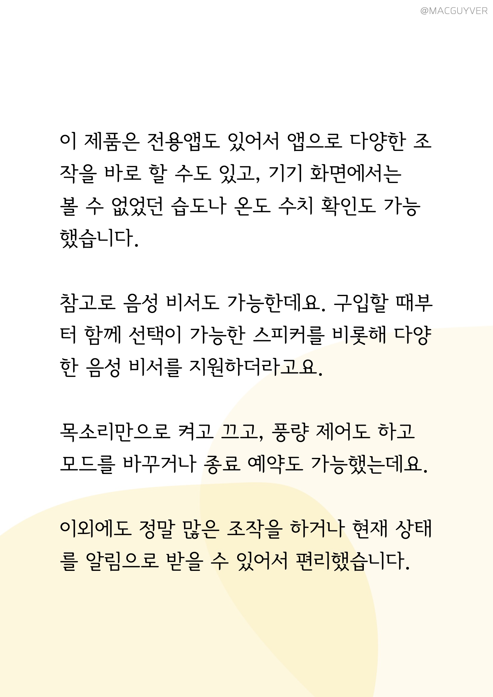 미로 맑음은 전용앱도 있어서 앱으로 다양한 조작을 바로 할 수도 있고, 기기 화면에서는 볼 수 없었던 습도나 온도 수치 확인도 가능했습니다. 참고로 미세먼지 공기청정기 음성 비서도 가능한데요. 구입할 때부터 함께 선택이 가능한 스피커를 비롯해 다양한 음성 비서를 지원하더라고요. 목소리만으로 켜고 끄고, 풍량 제어도 하고 모드를 바꾸거나 종료 예약도 가능했는데요. 이외에도 정말 많은 조작을 하거나 현재 상태를 알림으로 받을 수 있어서 편리했습니다.