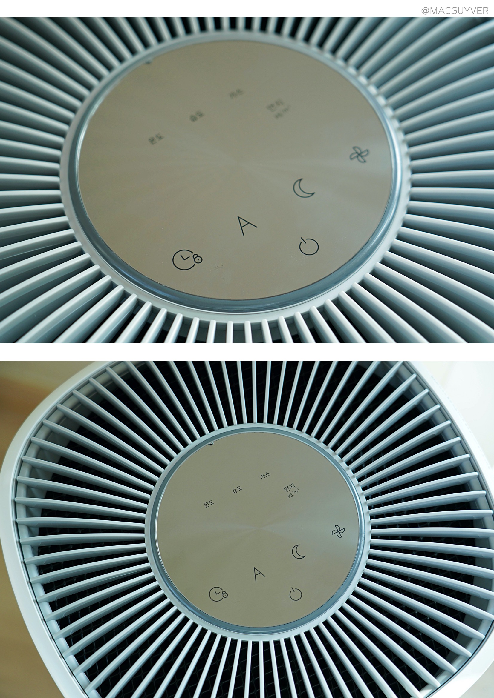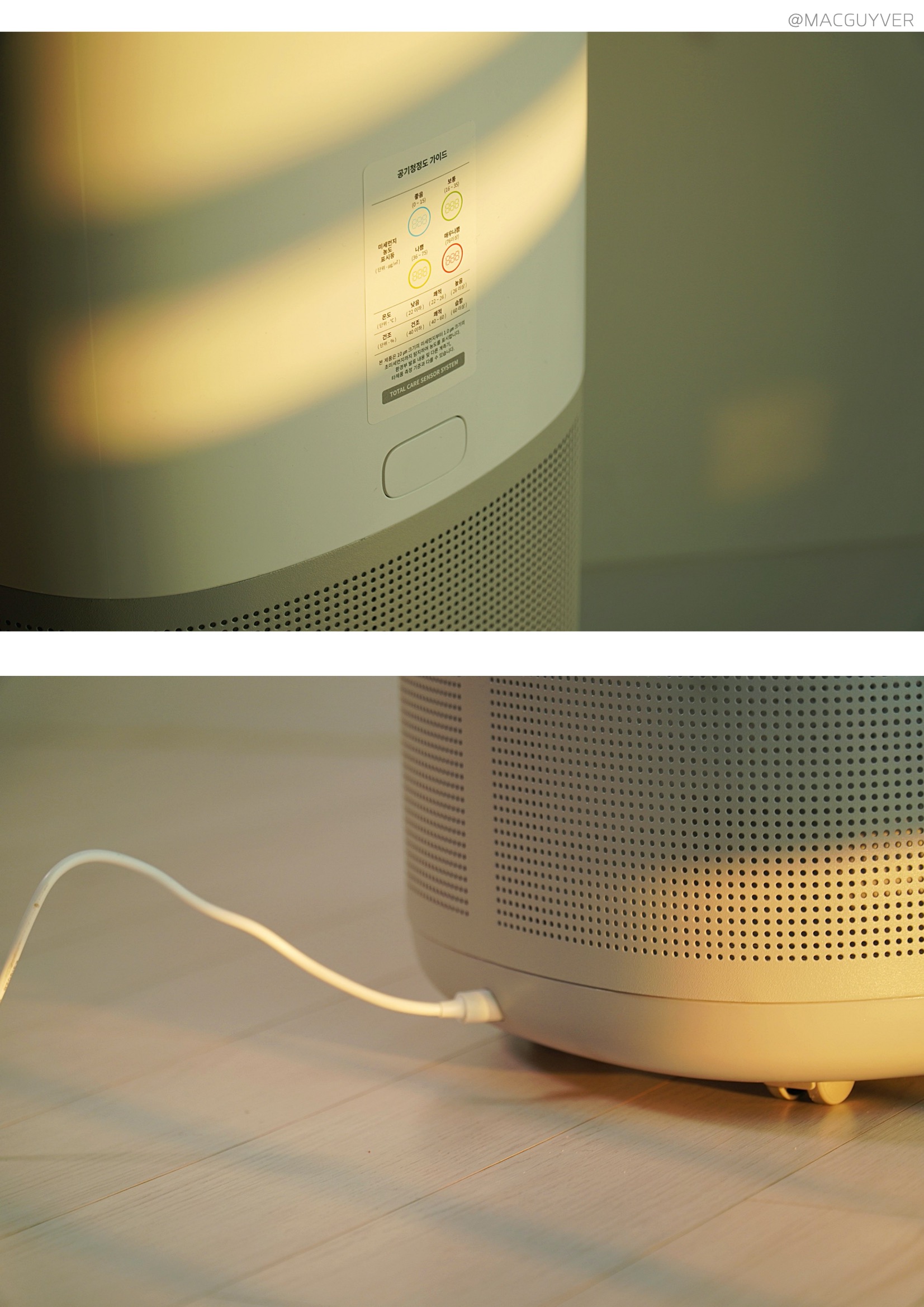 미로 맑음은 디자인도 빼놓을 수 없는 장점인데요. 차분하고 따뜻한 느낌이기도 했고, 18,000개나 되는 홀이 있지만 섬세하고 세밀하게 뚫어둬서 보기에 거슬리지 않고 단정해 보이더라고요. 둥글둥글하면서도 타워형으로 이동도 쉽고 상단부 조작까지 간편해서 만족스럽기도 했습니다. 참고로 기기 화면으로는 공기청정기 필터, 헤파필터 H13 필터 수명 체크부터 미세먼지 농도 확인, 온도 습도 가스를 컬러로 알려줘서 편리했어요. 타이머 조절, 풍량 조절, 자동, 수동 모드로 설정이 간편하니까 조작성도 나쁘지 않더라고요.