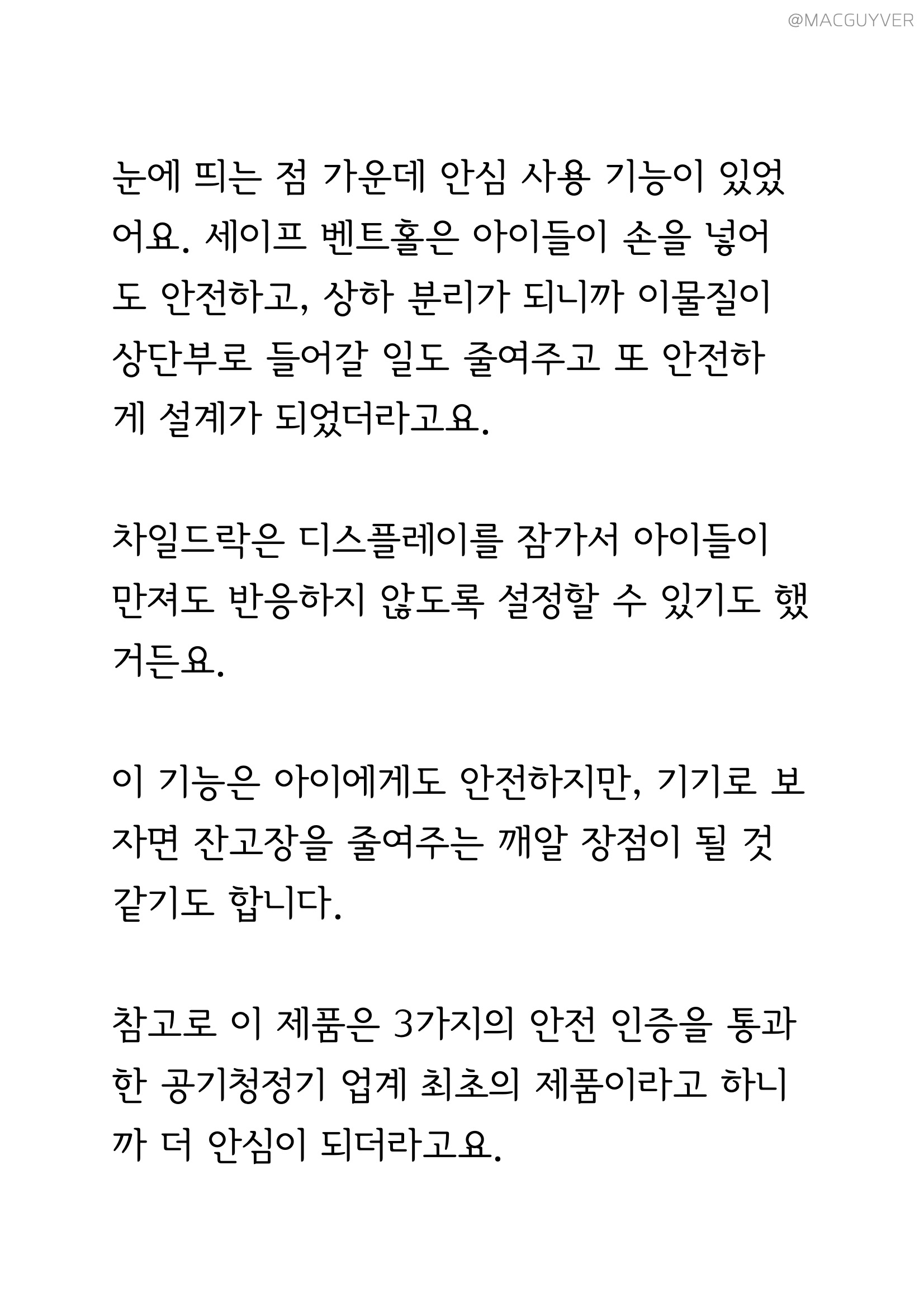 공기청정기 순위, 공기청정기 추천에서 눈에 띄는 점 가운데 안심 사용 기능이 있었어요. 세이프 벤트홀은 아이들이 손을 넣어도 안전하고, 상하 분리가 되니까 이물질이 상단부로 들어갈 일도 줄여주고 또 안전하게 설계가 되었더라고요. 차일드락은 디스플레이를 잠가서 아이들이 만져도 반응하지 않도록 설정할 수 있기도 했거든요. 이 기능은 아이에게도 안전하지만, 기기로 보자면 잔고장을 줄여주는 깨알 장점이 될 것 같기도 합니다.