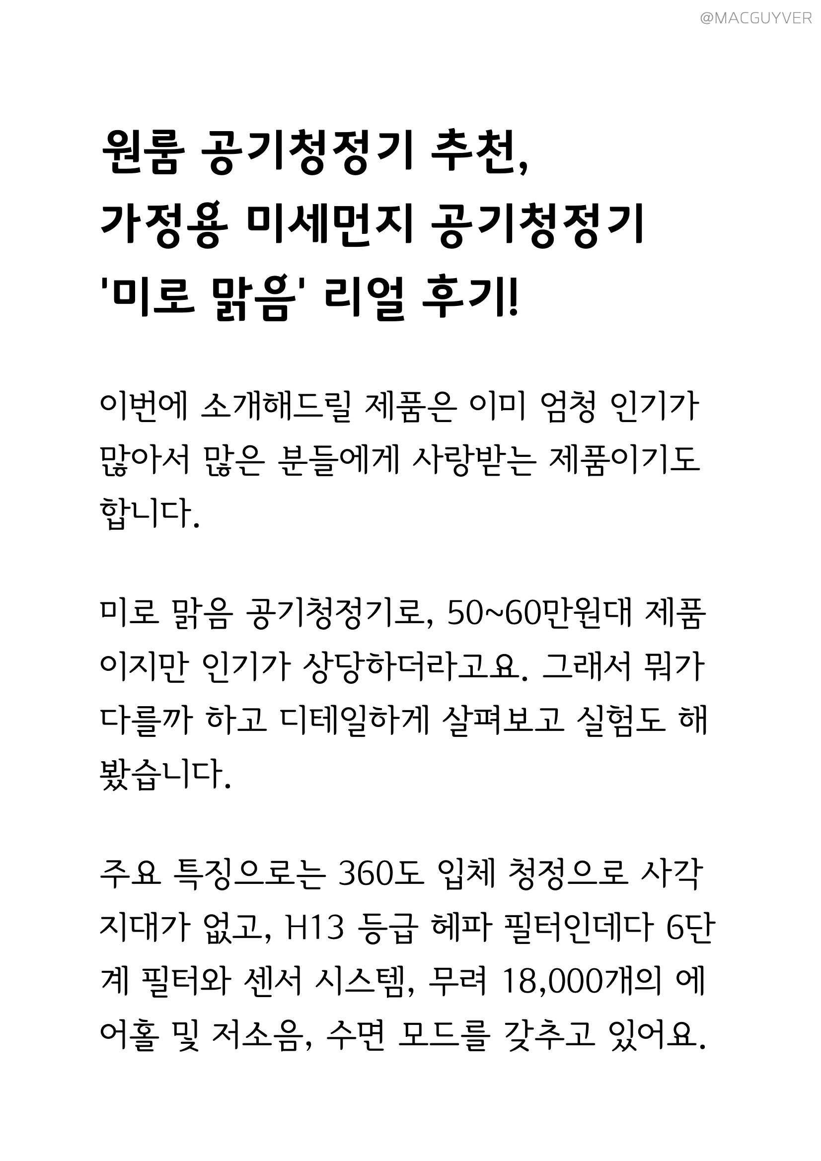 공기청정기 추천 이번에 소개해드릴 제품은 이미 엄청 인기가 많아서 많은 분들에게 사랑받는 제품이기도 합니다. 미로 맑음 공기청정기로, 50~60만원대 제품이지만 인기가 상당하더라고요. 그래서 뭐가 다를까 하고 디테일하게 살펴보고 실험도 해봤습니다. 미로 맑음의 주요 특징으로는 360도 입체 청정으로 사각 지대가 없고, H13 등급 헤파 필터인데다 6단계 필터와 센서 시스템, 무려 18,000개의 에어홀 및 저소음, 수면 모드를 갖추고 있더라고요.