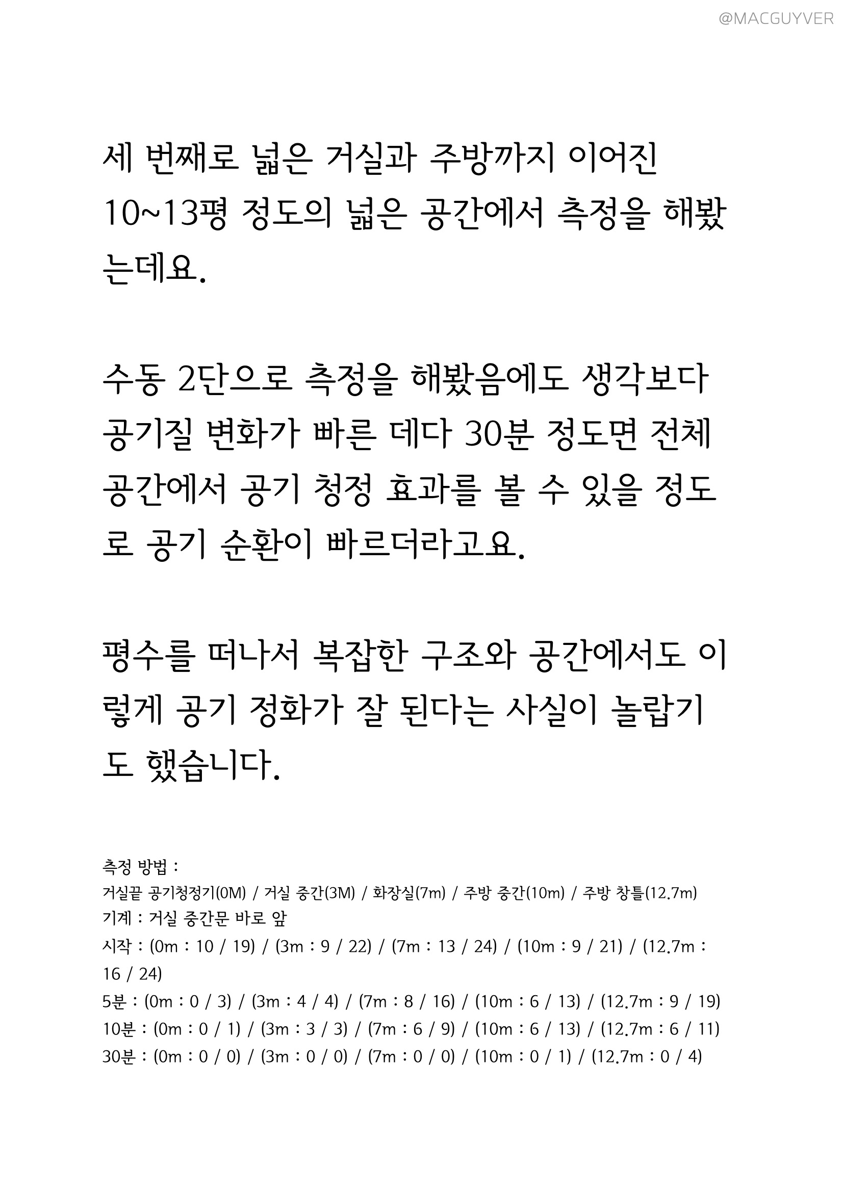 공기청정기 추천 세 번째로 넓은 거실과 주방까지 이어진 10~13평 정도의 넓은 공간에서 측정을 해봤는데요. 수동 2단으로 측정을 해봤음에도 생각보다 공기질 변화가 빠른 데다 30분 정도면 전체 공간에서 공기 청정 효과를 볼 수 있을 정도로 공기 순환이 빠르더라고요. 평수를 떠나서 복잡한 구조와 공간에서도 이렇게 가정용 공기청정기로 공기 정화가 잘 된다는 사실이 놀랍기도 했습니다. 미세먼지 공기청정기 측정 방법 : 거실끝 공기청정기(0M) / 거실 중간(3M) / 화장실(7m) / 주방 중간(10m) / 주방 창틀(12.7m) * 기계 : 거실 중간문 바로 앞 시작 : (0m : 10 / 19) / (3m : 9 / 22) / (7m : 13 / 24) / (10m : 9 / 21) / (12.7m : 16 / 24) 5분 : (0m : 0 / 3) / (3m : 4 / 4) / (7m : 8 / 16) / (10m : 6 / 13) / (12.7m : 9 / 19) 10분 : (0m : 0 / 1) / (3m : 3 / 3) / (7m : 6 / 9) / (10m : 6 / 13) / (12.7m : 6 / 11) 30분 : (0m : 0 / 0) / (3m : 0 / 0) / (7m : 0 / 0) / (10m : 0 / 1) / (12.7m : 0 / 4)