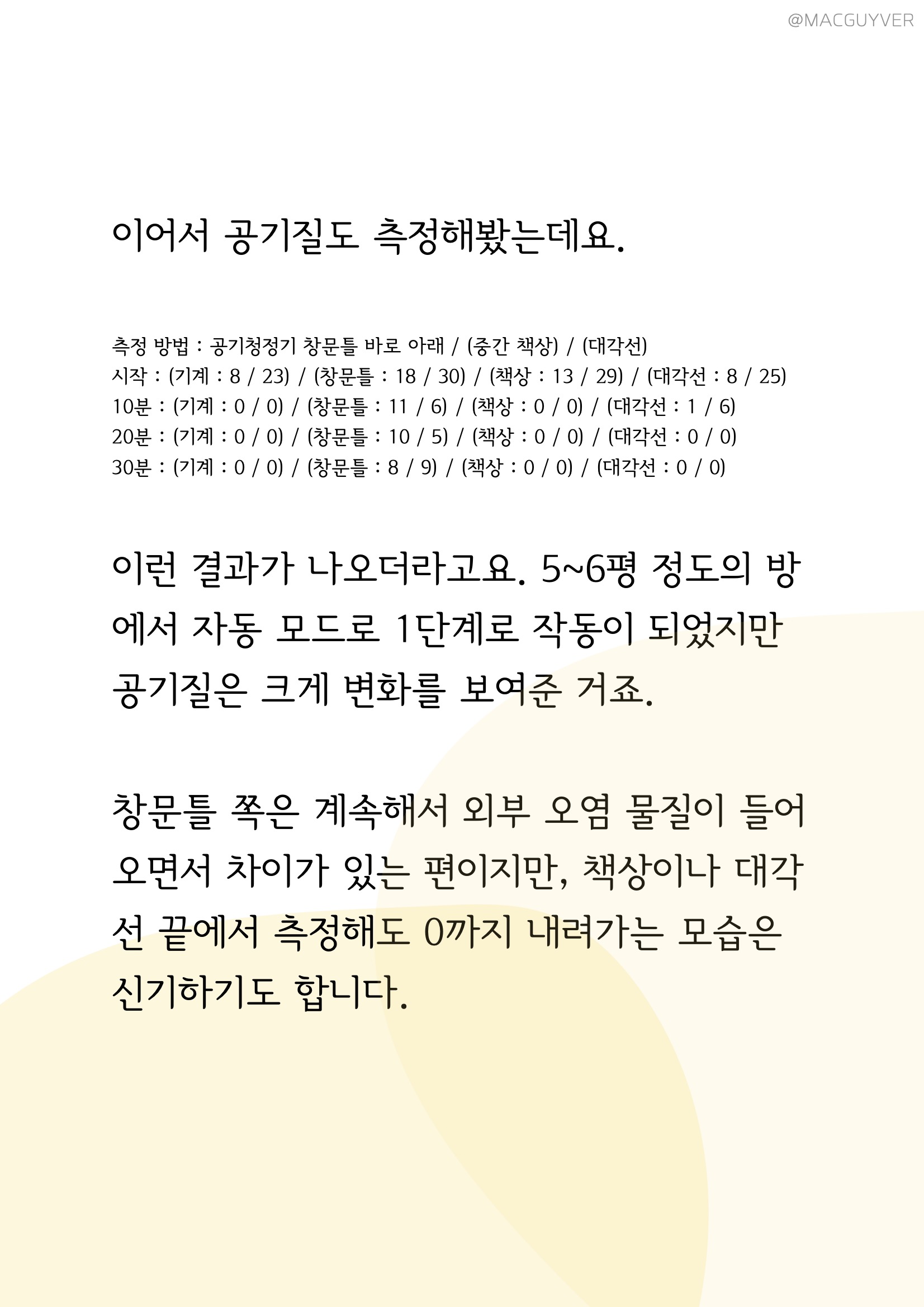 두 번째 공기질 측정도 해봤습니다. 이번에는미로 맑음 수동 터보로 작동을 해봤는데요. 사실상 5분 정도 만에 공기질 차이가 뚜렷할 정도로 눈에 띄는 결과를 보여주더라고요. 여전히 창문틀 근처는 오염 물질이 조금씩 유입되지만 그보다 더 빠르게 공기 정화가 되니까 수치는 상당히 내려가는 모습입니다. 측정 방법 : 공기청정기 창문틀 바로 아래 / (중간 책상 ) / (대각선 끝) 시작 : (기계 : 9 / 18) / (창문틀 : 22 / 27) / (책상 : 8 / 19) / (대각선 끝 : 7 / 30) 5분 : (기계 : 0 / 0) / (창문틀 : 4 / 3) / (책상 : 0 / 0) / (대각선 끝 : 0 / 0) 10분 : (기계 : 0 / 0) / (창문틀 : 0 / 2) / (책상 : 0 / 0) / (대각선 끝 : 0 / 0) 30분 : (기계 : 0 / 0) / (창문틀 : 3 / 6) / (책상 : 0 / 0) / (대각선 끝 : 0 / 0)