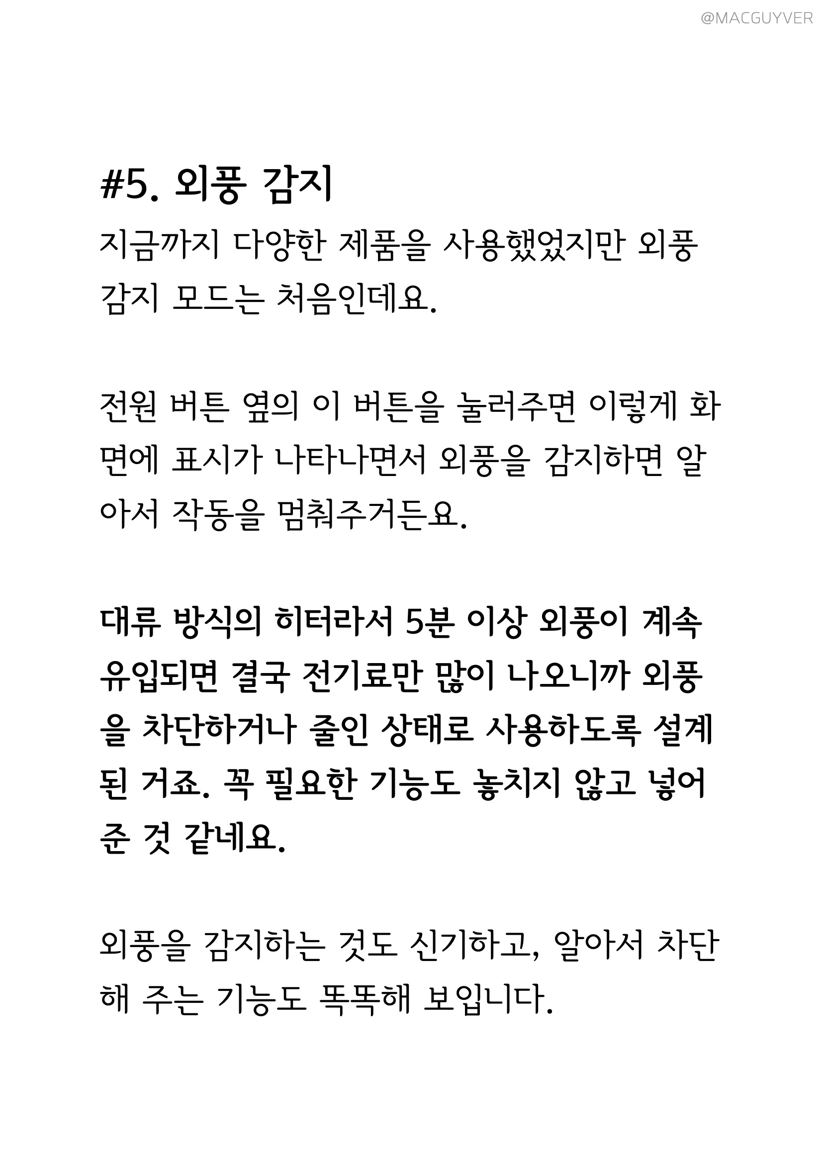 #5. 외풍 감지 지금까지 다양한 제품을 사용했었지만 외풍 감지 모드는 처음인데요. 전기컨벡터의 전원 버튼 옆의 이 버튼을 눌러주면 이렇게 화면에 표시가 나타나면서 외풍을 감지하면 알아서 작동을 멈춰주거든요. 대류 방식의 히터라서 5분 이상 외풍이 계속 유입되면 결국 전기료만 많이 나오니까 외풍을 차단하거나 줄인 상태로 사용하도록 설계된 거죠. 꼭 필요한 기능도 놓치지 않고 넣어준 것 같네요. 마이카 히터, 컨벡션피터가 외풍을 감지하는 것도 신기하고, 알아서 차단해 주는 기능도 똑똑해 보입니다.