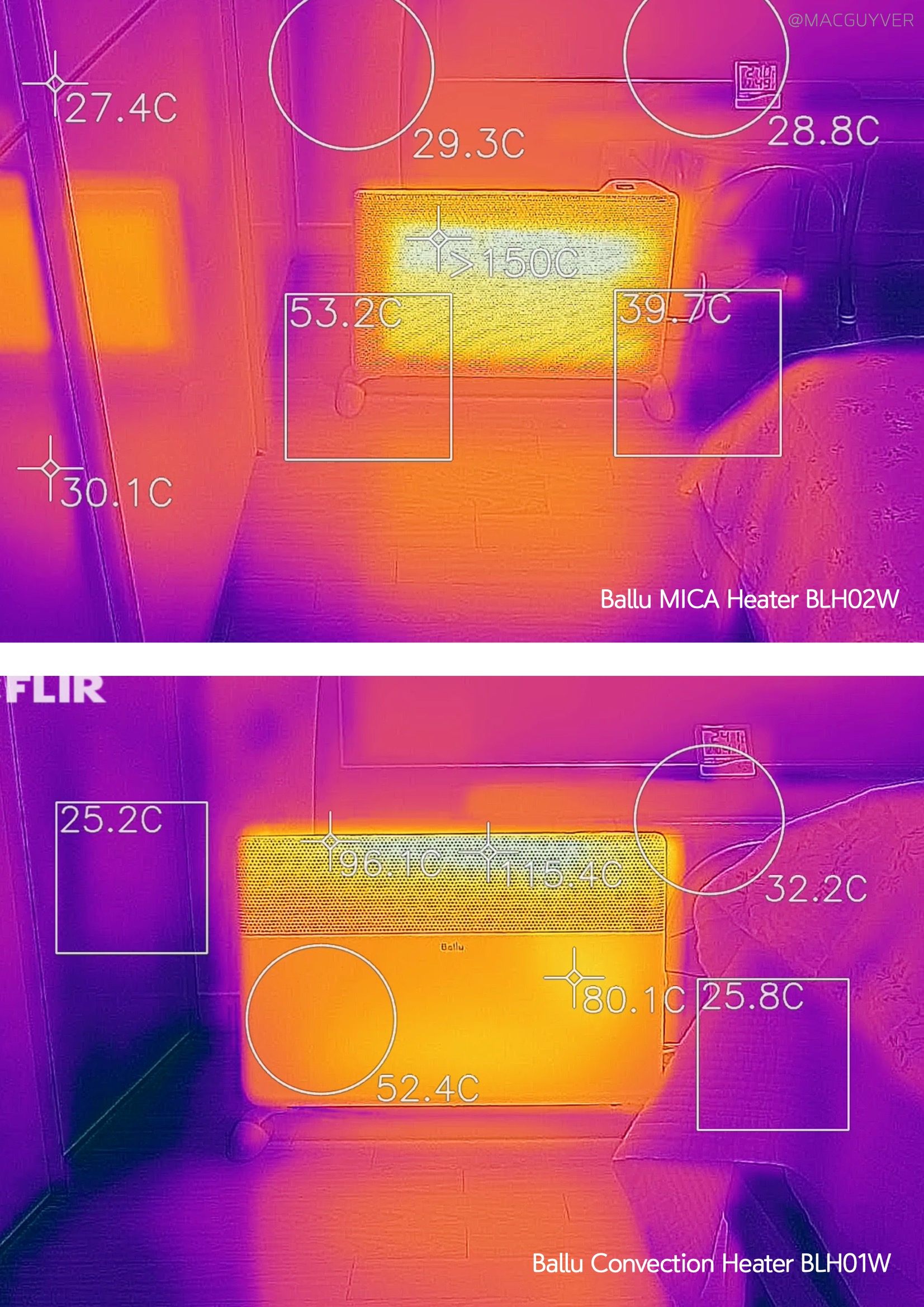 #2. 열화상 전면 전체를 홀로 채워둔 발루 마이카 컨벡션히터 BLH02W는 열화상을 찍어보면 전체 면에서 열기가 나오거나 온도 변화에 따라 자동으로 온도를 낮춰주고, 또 상단부만 온도가 올라가기도 했어요. 먼저 순식간에 주변이 훈훈해지는게 느껴졌고, 30분 단위로 측정해보니까 온도 변화가 눈에 띄었어요. 신기한 건 이때 측면이나 하단부를 만져도 뜨겁지가 않다는 점인데요. 확실히 주변에 아이들이나 반려동물이 있어도 안심이 될 것 같기도 합니다. 이어서 발루 컨벡션 BLH01W도 마찬가지로 열기가 뿜어져 나오는 모습을 볼 수 있더라고요.