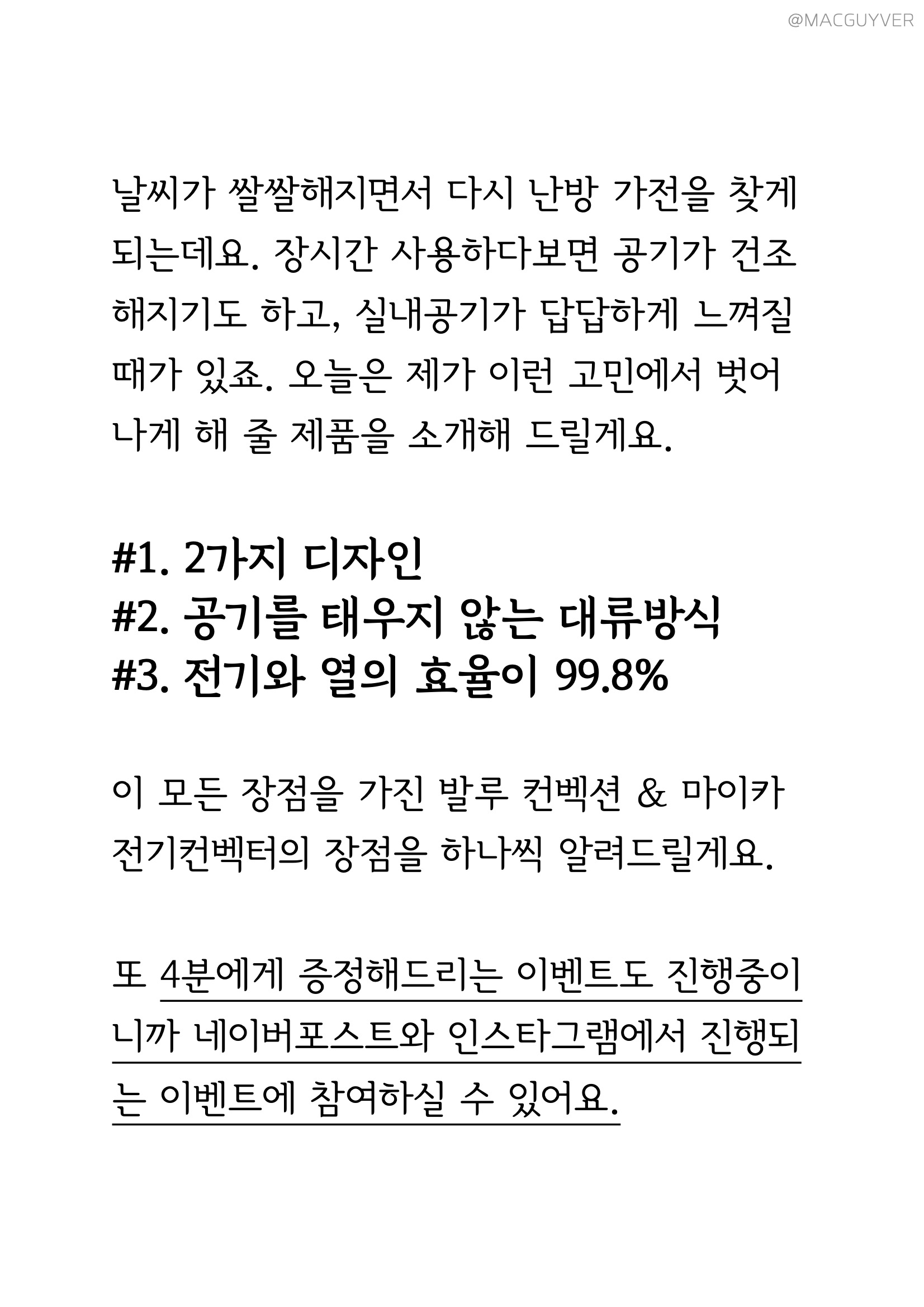 날씨가 쌀쌀해지면서 다시 컨벡션히터 같은 난방 가전을 찾게 되는데요. 장시간 가정용 전기 난로를 사용하다보면 공기가 건조해지기도 하고, 실내공기가 답답하게 느껴질 때가 있죠. 이런 고민에서 벗어나게 해 줄 제품인 발루 컨벡션히터을 소개해 드릴게요. 발루 전기컨벡터 #1. 2가지 디자인 #2. 공기를 태우지 않는 대류방식 #3. 전기와 열의 효율이 99.8% 이 모든 장점을 가진 발루 컨벡션 BLH01W & 마이카 BLH02W 전기컨벡터의 장점을 하나씩 알려드릴게요. 또 4분에게 증정해드리는 이벤트도 진행중이니까 네이버포스트와 인스타그램에서 진행되는 이벤트에 참여하실 수 있어요.