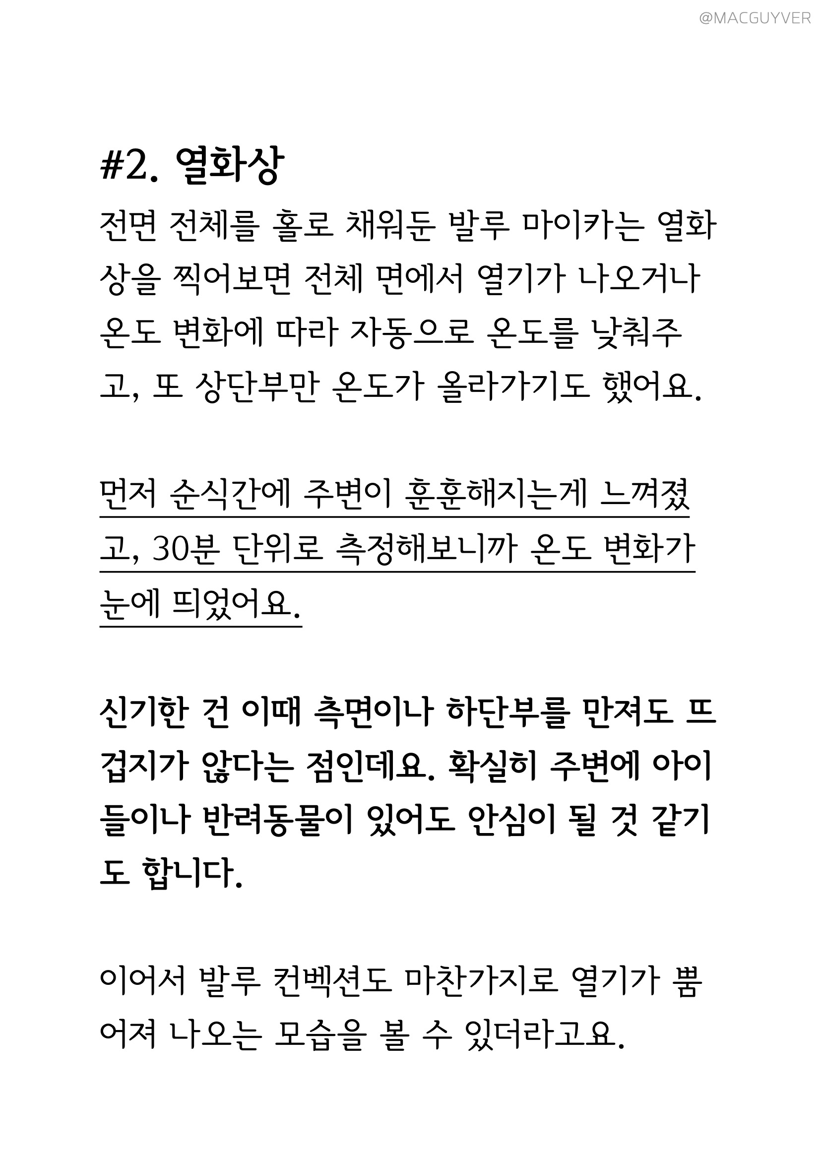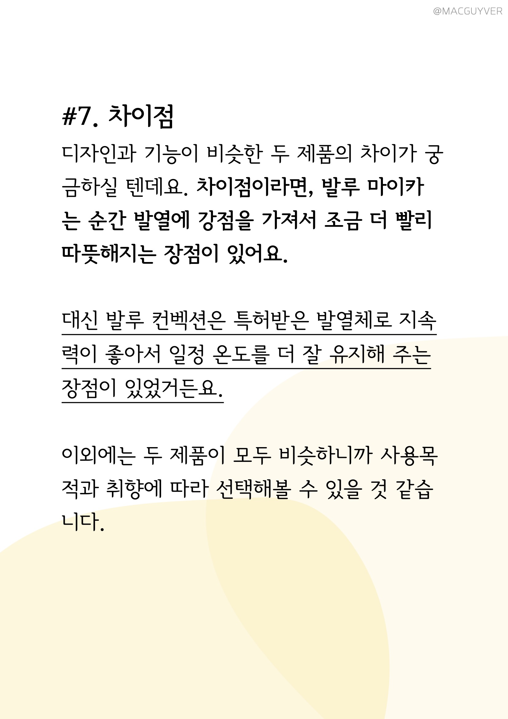#7. 마이카 히터와 컨벡션 히터 차이점 디자인과 기능이 비슷한 BLH01W, 두 제품의 차이가 궁금하실 텐데요. 차이점이라면, 발루 마이카 BLH02W는 순간 발열에 강점을 가져서 조금 더 빨리 따뜻해지는 장점이 있어요. 대신 발루 컨벡션 BLH01W은 특허받은 발열체로 지속력이 좋아서 일정 온도를 더 잘 유지해 주는 장점이 있었거든요. 이외에는 두 제품이 모두 비슷하니까 사용목적과 취향에 따라 선택해볼 수 있을 것 같습니다.