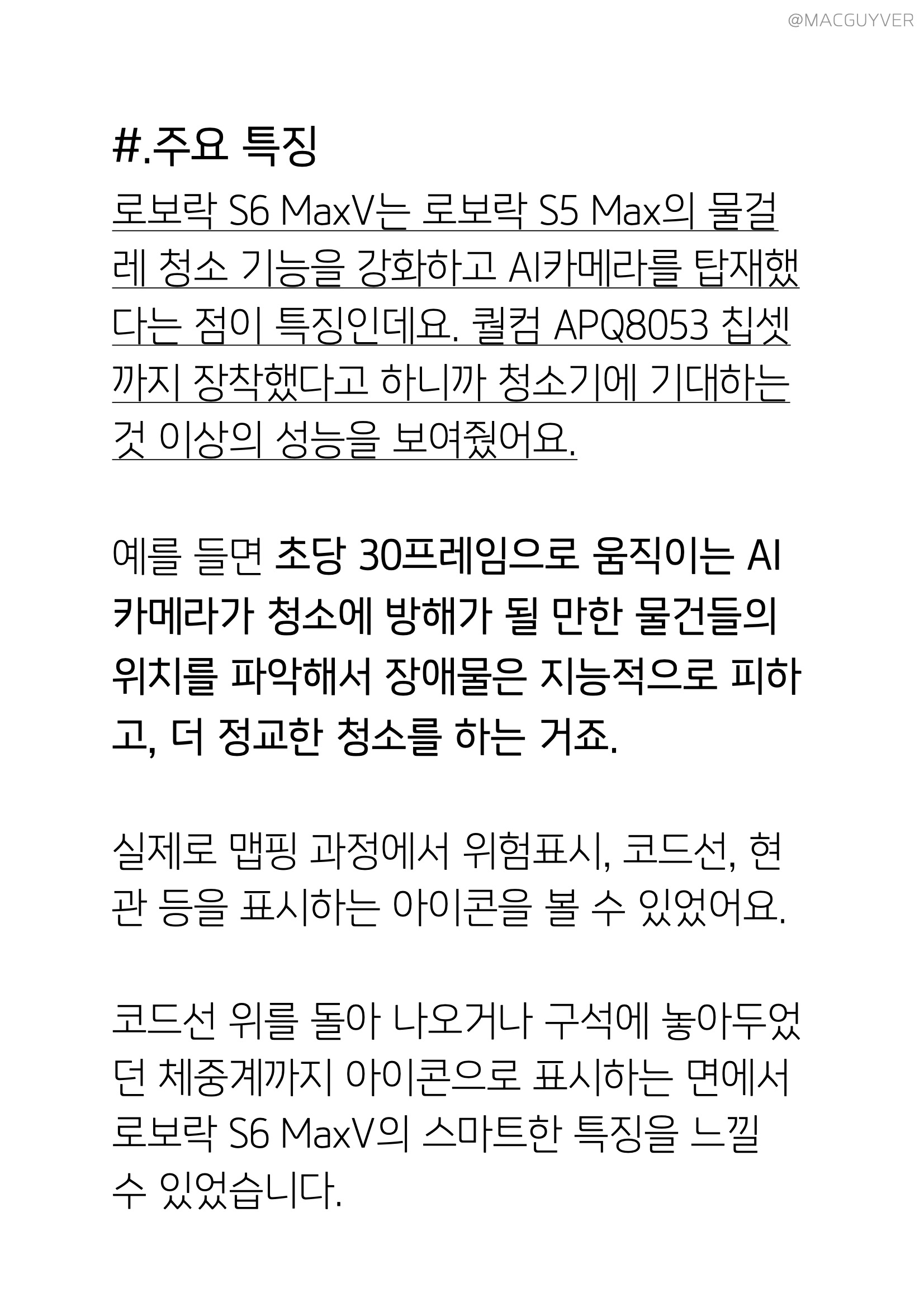 #.주요 특징 로보락 S6 MaxV는 로보락 S5 Max의 물걸레 청소 기능을 강화하고 AI카메라를 탑재했다는 점이 특징인데요. 퀄컴 APQ8053 칩셋까지 장착했다고 하니까 청소기에 기대하는 것 이상의 성능을 보여줬어요. 예를 들면 초당 30프레임으로 움직이는 로봇물걸레청소기 AI카메라가 청소에 방해가 될 만한 물건들의 위치를 파악해서 장애물은 지능적으로 피하고, 더 정교한 청소를 하는 거죠. 실제로 맵핑 과정에서 위험표시, 코드선, 현관 등을 표시하는 아이콘을 볼 수 있었는데요. 코드선 위를 돌아 나오거나 구석에 놓아두었던 체중계까지 아이콘으로 표시하는 면에서 물걸레로봇청소기 로보락 S6 MaxV의 특징을 느낄 수 있었습니다. 여기서 끝이 아니에요. 가성비로봇청소기 로보락 S6 MaxV를 홈 CCTV처럼 활용할 수도 있어요. 전면 트윈 스테레오 카메라로 청소기가 이동하는 곳곳을 볼 수 있을 뿐만 아니라 전용 어플을 리모컨처럼 활용하여 원하는 곳을 볼 수도 있거든요. 심지어 로보락로봇청소기로 음성 메시지도 전송할 수 있다고 하니까 반려동물이나 어린 자녀가 잘 있는지 확인하고 음성메시지도 보낼 수 있는 거죠. 물론 보안에 대해서도 궁금하실 텐데요. 청소기가 홈 CCTV 기능을 사용하려면 전용 앱에서 제스처 로그인을 해줘야 하고, 사용하는 동안은 로봇청소기에서 실시간 비디오 기능이 활성화되었다는 음성 안내가 계속 나오니까 사용자도 모르게 노출될 염려는 없을 것 같아요.