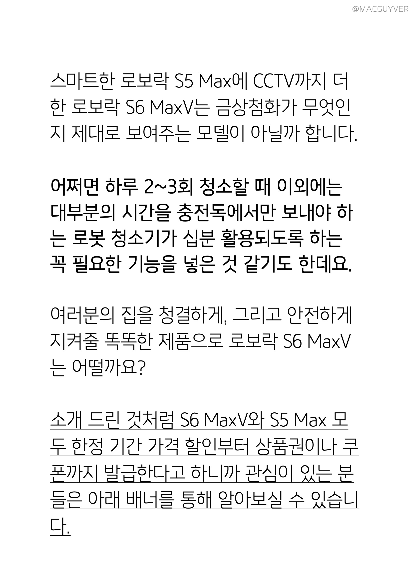 #. 로봇청소기 전용앱 로보락 S6 MaxV의 기능이 다양한 만큼 어플 사용이 필수였어요. 로보락로봇청소기 전용 어플로 영역 구분, 특정 방 청소, 스팟 청소, 예약 청소 같은 기본적인 청소 기능들 부터 음성 설정, 펌웨어 업그레이드와 소모품 교체 주기까지 알 수 있으니까요. 로봇물걸레청소기추천 작업 공간과 요리 중인 공간에는 가상벽과 진입금지 영역을 지정하고, 각 위치별 청소 순서도 지정하는 등 여러 가지 설정을 복잡하게 더해도 오류 없이 즉각 반영이 되어서 정말 스마트한 로보락 S6 MaxV의 기능을 체감할 수 있었습니다. 무엇보다 사용자가 사용하는 방의 목적에 맞게 물걸레로봇청소기의 흡입 모드나 물걸레 수위를 개별화할 수 있다는 점도 만족스러웠는데요. 이런 전용 어플도 복잡한 과정 없이 안내에 따라 간단히 할 수 있었고, 직관적인 앱 조작 방식이라 스마트폰에 익숙한 사용자라면 누구나 사용 가능하다는 점이 매력이 아닐까 합니다. 스마트한 로보락 S5 Max에 CCTV까지 더한 로보락 S6 MaxV는 금상첨화가 무엇인지 제대로 보여주는 모델이 아닐까 합니다. 어쩌면 하루 2~3회 청소할 때 이외에는 대부분의 시간을 충전독에서만 보내야 하는 로봇 청소기가 십분 활용되도록 하는 꼭 필요한 기능을 넣은 것 같기도 한데요. 여러분의 집을 청결하게, 그리고 안전하게 지켜줄 제품으로 가성비로봇청소기 로보락 S6 MaxV는 어떨까요? 앞서 소개 드린 것처럼 로보락 S6 MaxV와 S5 Max 모두 한정 기간 가격 할인부터 상품권이나 쿠폰까지 발급한다고 하니까 관심이 있는 분들은 아래 배너를 통해 알아보실 수 있습니다.