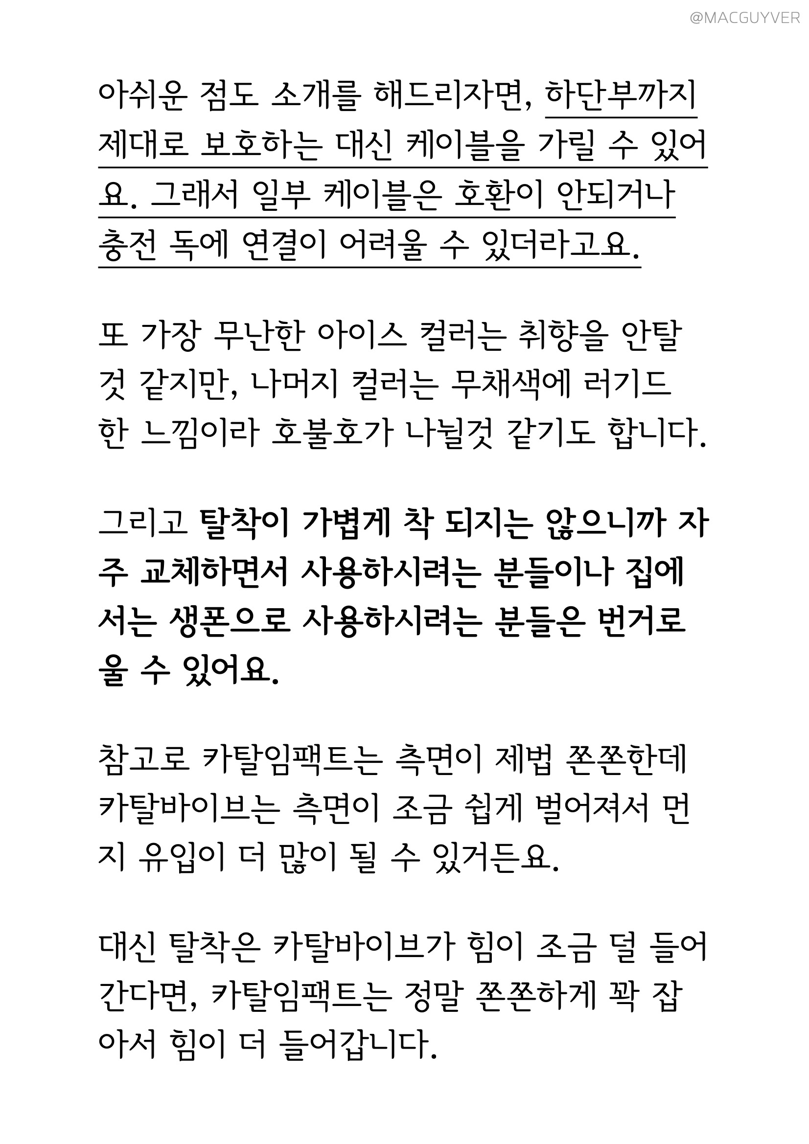이제 아쉬운 점도 소개를 해드리자면, 아이폰12 케이스 하단부까지 제대로 보호하는 대신 케이블을 가릴 수 있어요. 그래서 일부 케이블은 호환이 안되거나 충전 독에 연결이 어려울 수 있더라고요. 또 가장 무난한 아이스 컬러는 취향을 안탈 것 같지만, 나머지 컬러는 다소 무채색에 러기드한 느낌이라 호불호가 있을 것 같기도 합니다. 그리고 탈착이 가볍게 착 되지는 않으니까 자주 교체하면서 사용하시려는 분들이나 집에서는 생폰으로 사용하시려는 분들은 번거로울 수 있어요. 참고로 카탈임팩트는 측면이 제법 쫀쫀한데 카탈바이브는 측면이 조금 쉽게 벌어져서 먼지 유입이 더 많이 될 수 있거든요. 대신 탈착은 카탈바이브가 힘이 조금 덜 들어간다면, 카탈임팩트는 정말 쫀쫀하게 꽉 잡아서 힘이 더 들어갑니다.