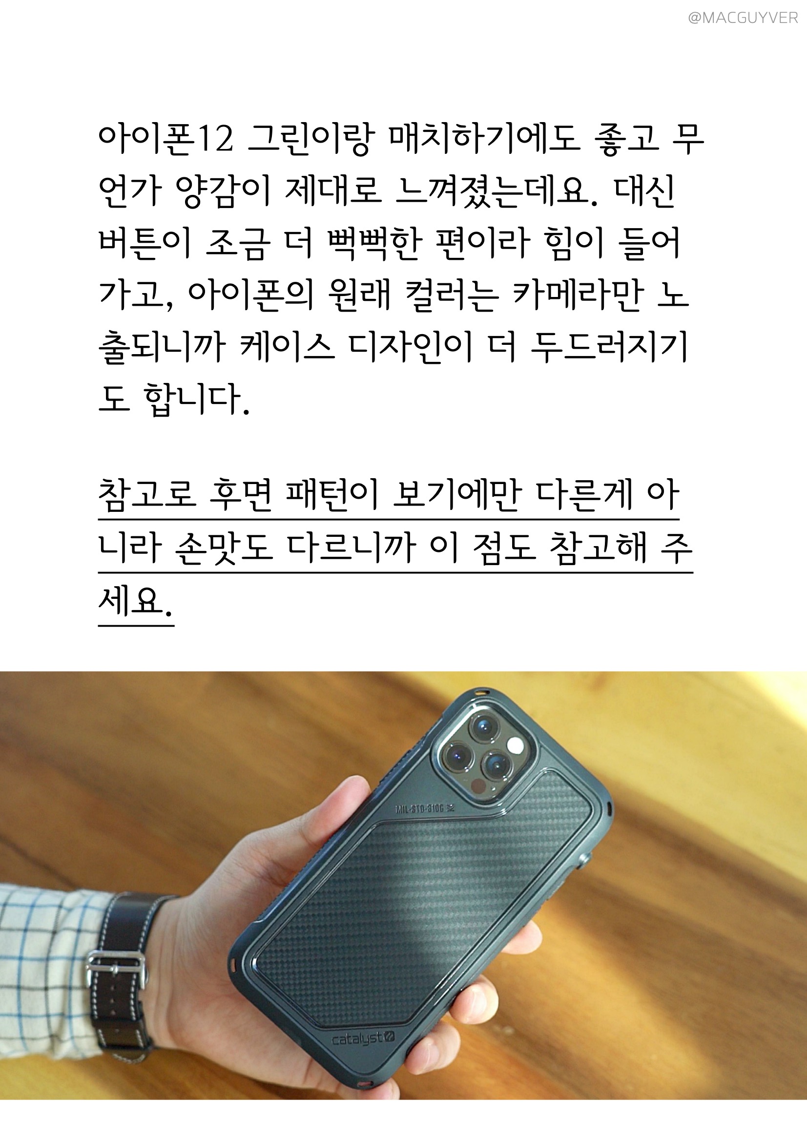 차이점이라면, 카탈임팩트 아이폰12 케이스는 더 슬림해요. 그래서 그립감이 좋은 데다 애플 로고도 보이니까 블랙은 은은하게, 아이스는 투명하게 활용해볼 수 있거든요. 특히 아이스는 컬러마다 파스텔 톤으로 잘 어울리니까 다양하게 매치해볼 수 있고, 블랙은 그래파이트와 정말 잘 어울리더라고요. 참고로 후면 재질은 유분이 잘 안 묻어서 관리도 편하고 버튼도 더 부드럽게 눌려지는 데다 무음 버튼 회전도 조금 더 유들유들합니다. 카탈바이브는 조금 더 두꺼워서 확실히 보호 성능이 더 뛰어난데요. 영상 리뷰에서 다양한 드롭 테스트까지 했으니까 참고해보세요. 내부를 보면 후면까지 충격 방지 구조가 포함되어서 안심이 되더라고요. 그만큼 카메라도 더 제대로 보호하고, 또 자체 디자인이 러기드한 느낌이라 운동을 좋아하거나 다양한 외부 활동을 하시는 분들에게 적합한데요. 긁힘이나 찍힘에도 강하다 보니까 거친 환경에 적합한 거죠. 거기다 측면도 재질감이 뚜렷해서 미끄러움도 덜하고 그린 컬러도 오묘한 매력이 있었어요. 아이폰12 그린이랑 매치하기에도 좋고 무언가 양감이 제대로 느껴졌는데요. 대신 버튼이 조금 더 뻑뻑한 편이라 힘이 들어가고, 아이폰의 원래 컬러는 카메라만 노출되니까 아이폰12 프로 케이스 디자인이 더 두드러지기도 합니다. 참고로 아이폰12 범퍼 케이스 후면 패턴이 보기에만 다른게 아니라 손맛도 다르니까 이 점도 참고해 주세요.