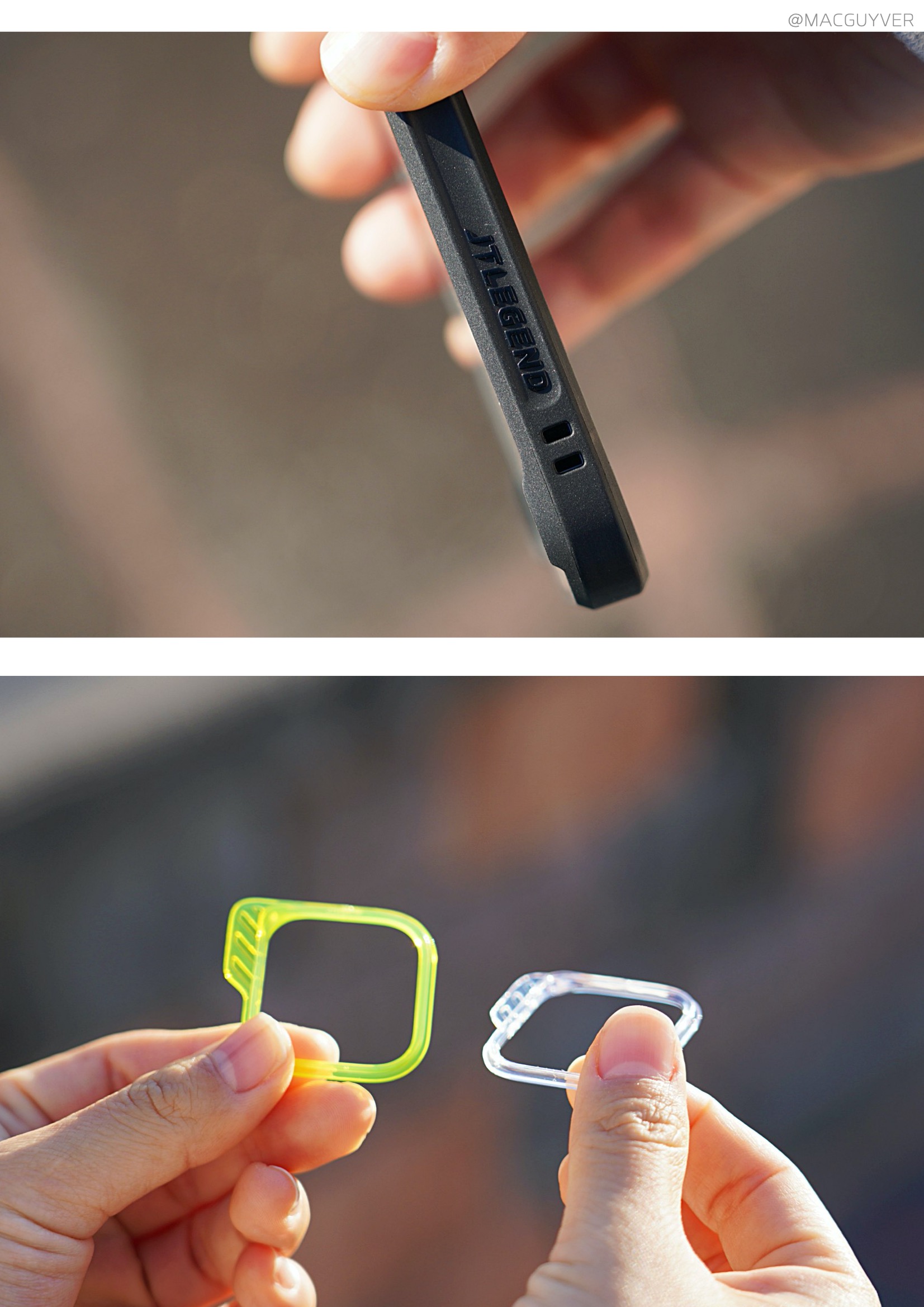 거기다 충격방지 케이스이지만 탈착이 쉬운 편이고, 전면 보호가 되는 데다 버튼이 정말 쉽게 눌러지더라고요. 좌우에 스트랩이 있으니까 다양한 활용도 가능해 보입니다. 내구성 좋은 폴리카보네이트라 슬림 하니까 부담이 없고, 화면 끝에만 살짝 걸치니까 강화유리 호환성도 뛰어났는데요. 한 손으로 들어도 하단부가 거칠지 않아서 사용하기 편하기도 합니다. 또 이음매가 눈에 띄지 않아서 마감도 좋고 특히 전면에서 볼 때 심플하다는 장점이 있더라고요. 저는 그립감도 중요하게 생각해서 손으로 여러 번 쥐어보기도 하는데, 이 케이스는 가운데가 들어가고 측면이 올라와서 놓칠 염려도 없고 안정적으로 잡을 수 있으니까 편했습니다. 참고로 케이스마다 쇼크핀 구성이 모두 달라요. 그래서 원하는 조합이 다른 컬러에 있으면 아쉬울 수 있으니까 혹시나 함께 구입하는 친구가 있다면 서로 나눠서 써보는 걸 추천드립니다.