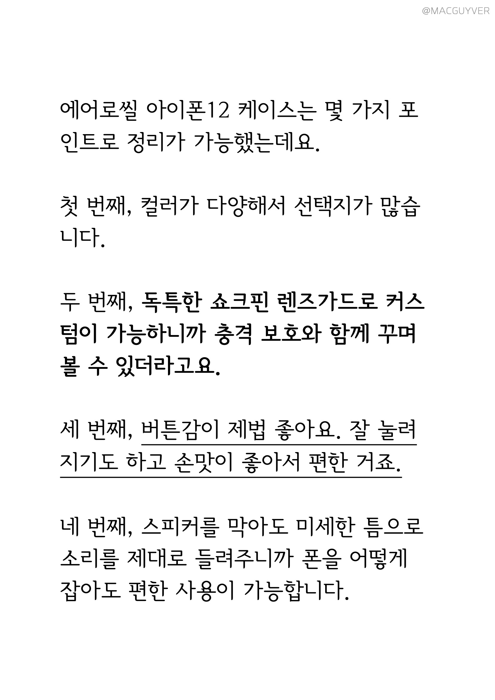 에어로씰 아이폰12 케이스는 몇 가지 포인트로 정리가 가능했는데요. 첫 번째, 컬러가 다양해서 선택지가 많습니다. 두 번째, 독특한 쇼크핀 렌즈가드로 커스텀이 가능하니까 충격 보호와 함께 꾸며볼 수 있더라고요. 세 번째, 버튼감이 제법 좋아요. 잘 눌려지기도 하고 손맛이 좋아서 편한 거죠. 네 번째, 스피커를 막아도 미세한 틈으로 소리를 제대로 들려주니까 폰을 어떻게 잡아도 편한 사용이 가능합니다. 다섯 번째, 밀스펙 케이스에요. 또 일본 타이카에서 개발한 알파젤로 모서리 보호 성능까지 더했다고 하니까 아이폰12 범퍼 케이스로 안심이 되더라고요. 여섯 번째, 특허받은 엘라스트쇼크가 충격을 분산해서 내부 손상까지 줄여주는 기술을 더했다고 하니까 맘 편히 사용할 수 있는 아이폰12 범퍼 케이스입니다. 일곱 번째, 확실히 아이폰 12 블루 컬러를 살려주는 케이스였어요. 아이폰 12 용달 블루를 이렇게 소화하는건 쉽지 않은데 확실히 산뜻하면서도 세련된 느낌까지 들어서 만족스러웠어요.