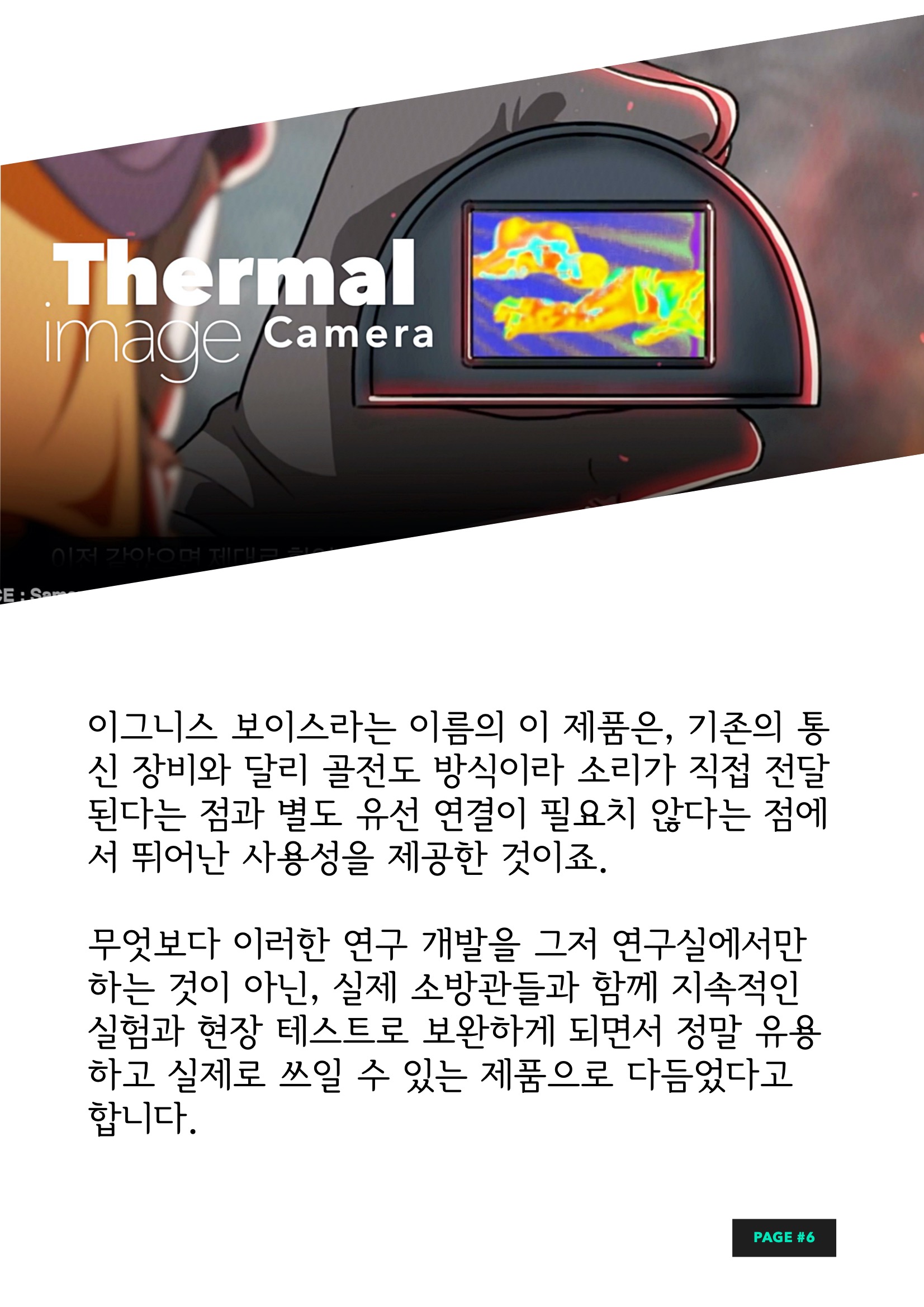 열화상 카메라는 간단히 말해서 물체가 가진 열을 영상으로 시각화해서 보여주는 카메라를 말합니다. 하지만 기존의 소방장비 제품은 크고 무겁고 내구성이 약해서 이그니스를 통해 가벼우면서도 내구성이 뛰어나고, 화염 속에서도 생존자를 구분할 수 있는 새로운 가능성을 선보인 것이죠. 동시에 화재 현장은 엄청난 소음으로 가득한 데다 소방관들이 동시에 현장 속으로 뛰어들면서 의사소통이 힘들다는 한계도 있었습니다. 특히 기존의 소방장비 헤드폰과 이어폰으로는 소음 속에서 대화가 힘들다는 아쉬움도 있었는데요. 이러한 한계 역시 소방공무원의 아이디어 제안으로 새로운 제품으로 탄생했습니다.