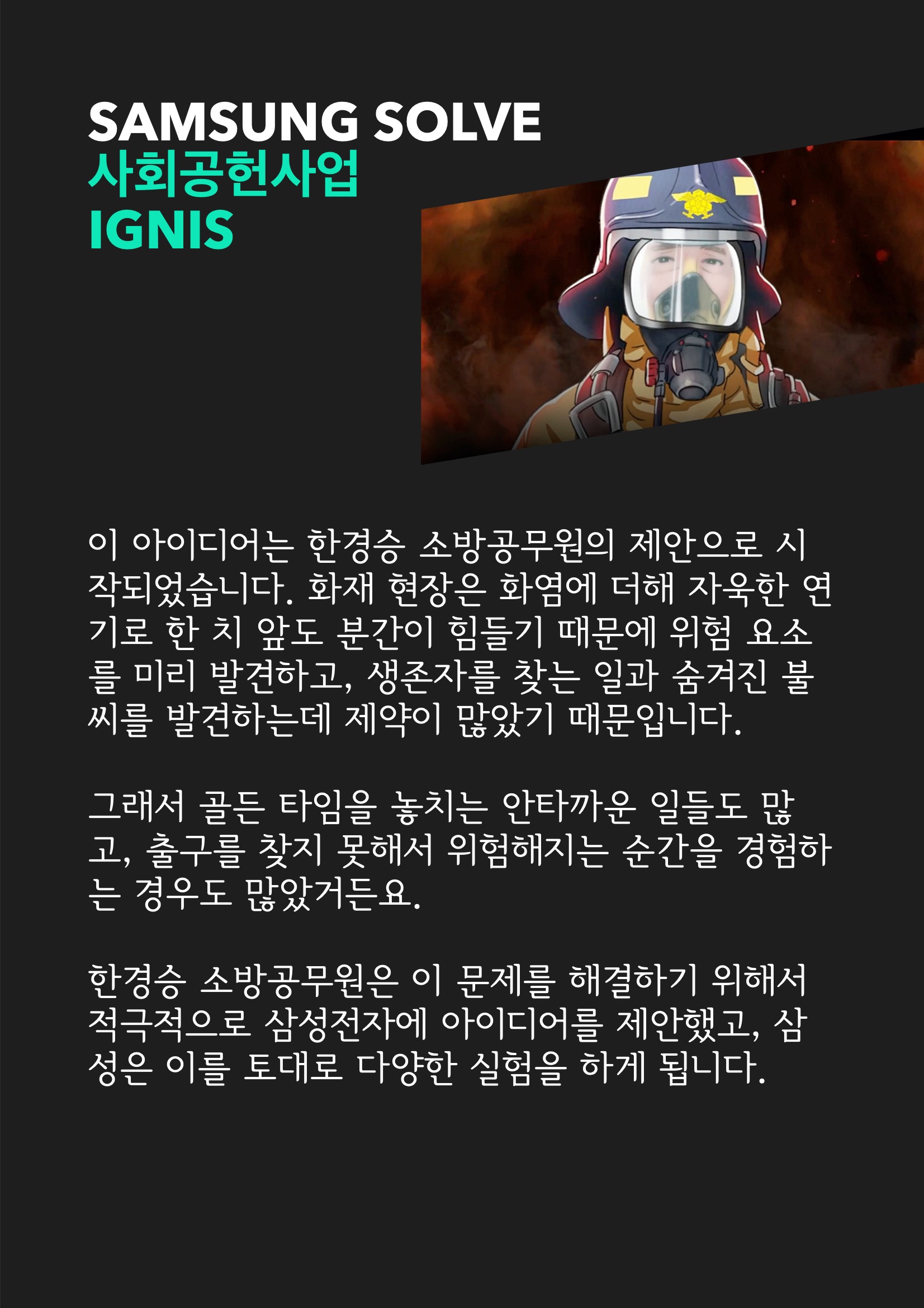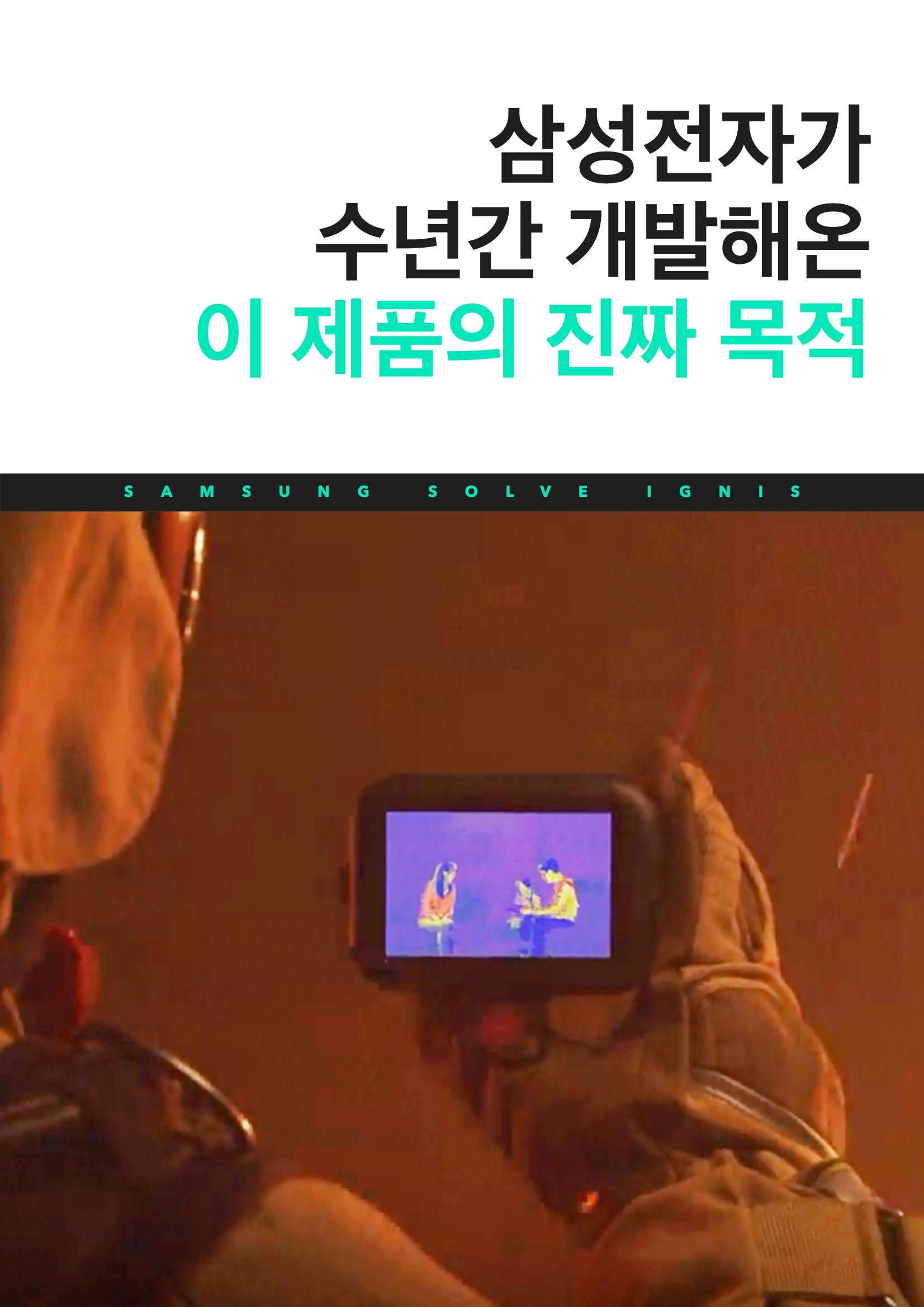 이 아이디어는 한경승 소방공무원의 제안으로 시작되었습니다. 화재 현장은 화염에 더해 자욱한 연기로 한 치 앞도 분간이 힘들기 때문에 위험 요소를 미리 발견하고, 생존자를 찾는 일과 숨겨진 불씨를 발견하는데 제약이 많았기 때문입니다. 그래서 골든 타임을 놓치는 안타까운 일들도 많고, 출구를 찾지 못해서 위험해지는 순간을 경험하는 경우도 많았거든요. 한경승 소방공무원은 이 문제를 해결하기 위해서 적극적으로 삼성전자에 아이디어를 제안했고, 삼성은 이를 토대로 다양한 실험을 하게 됩니다. 결과 이그니스가 탄생했는데요. 열화상 카메라라는 점에서 특별할 것이 없어 보이지만 화재 현장에 맞춰진 제품이라는 점에서 뛰어난 내구성과 성능을 필요로 한다는 점에서 큰 차별점을 가지고 있습니다.