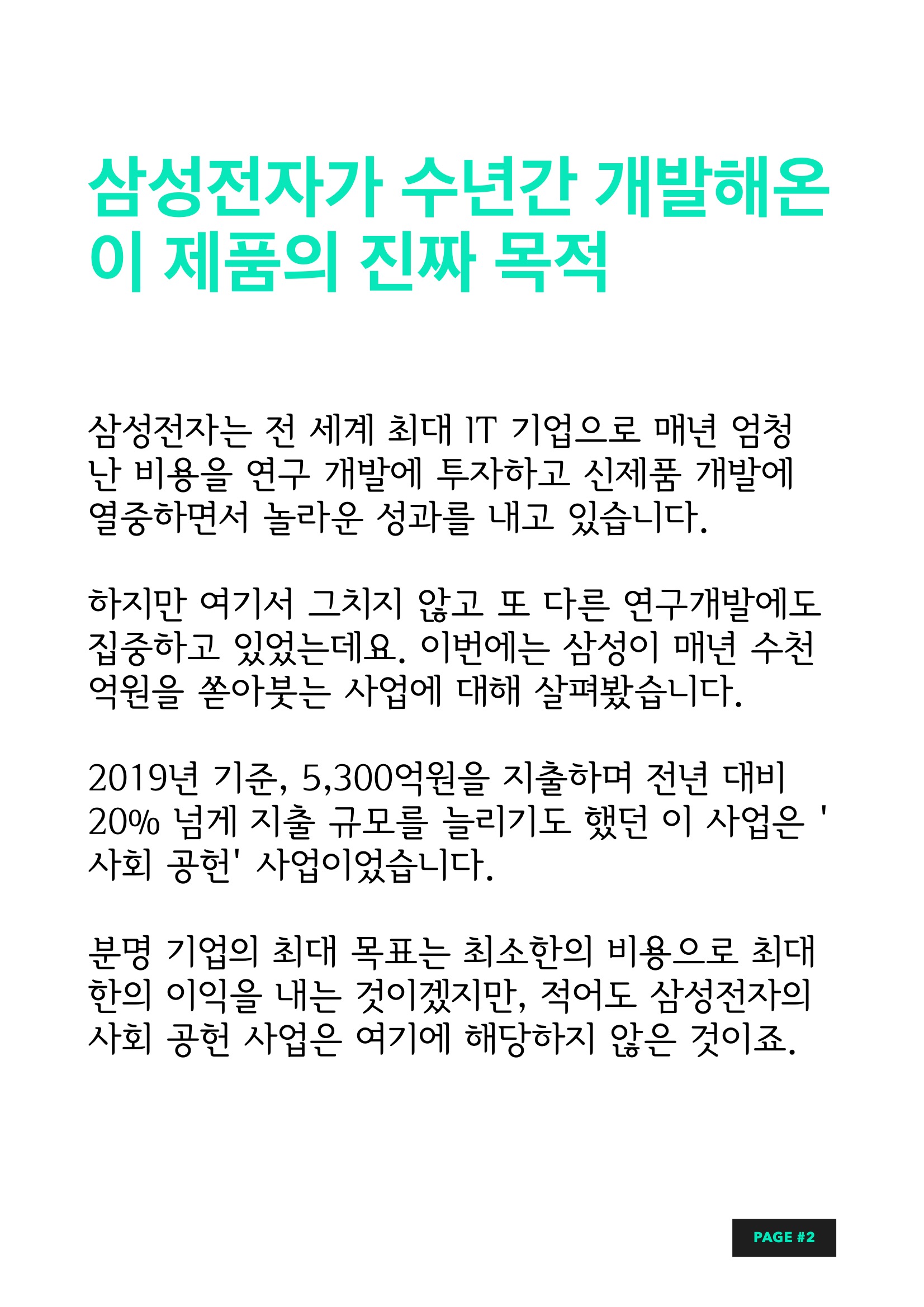 삼성전자가 수년간 개발해온 이 제품의 진짜 목적 삼성전자는 전 세계 최대 IT 기업으로 매년 엄청난 비용을 연구 개발에 투자하고 신제품 개발에 열중하면서 놀라운 성과를 내고 있습니다. 하지만 여기서 그치지 않고 또 다른 연구개발에도 집중하고 있었는데요. 이번에는 삼성이 매년 수천억원을 쏟아붓는 사업에 대해 살펴봤습니다. 2019년 기준, 5,300억원을 지출하며 전년 대비 20% 넘게 지출 규모를 늘리기도 했던 이 사업은 '사회 공헌' 사업이었습니다. 분명 기업의 최대 목표는 최소한의 비용으로 최대한의 이익을 내는 것이겠지만, 적어도 삼성전자의 사회 공헌 사업은 여기에 해당하지 않은 것이죠.