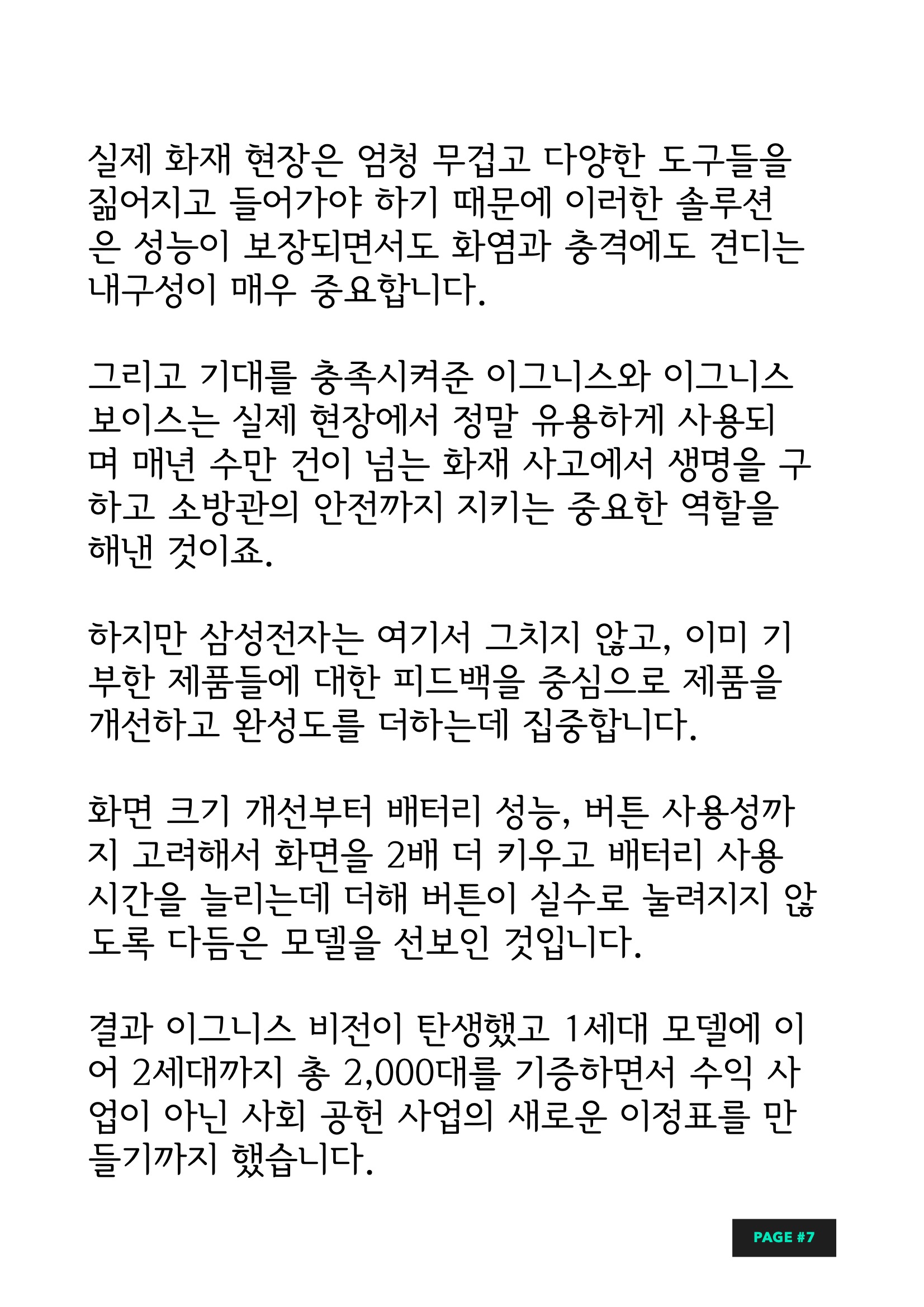 이 아이디어는 한경승 소방공무원의 제안으로 시작되었습니다. 화재 현장은 화염에 더해 자욱한 연기로 한 치 앞도 분간이 힘들기 때문에 위험 요소를 미리 발견하고, 생존자를 찾는 일과 숨겨진 불씨를 발견하는데 제약이 많았기 때문입니다. 그래서 골든 타임을 놓치는 안타까운 일들도 많고, 출구를 찾지 못해서 위험해지는 순간을 경험하는 경우도 많았거든요. 한경승 소방공무원은 이 문제를 해결하기 위해서 적극적으로 삼성전자에 아이디어를 제안했고, 삼성은 이를 토대로 다양한 실험을 하게 됩니다. 결과 이그니스가 탄생했는데요. 열화상 카메라라는 점에서 특별할 것이 없어 보이지만 화재 현장에 맞춰진 제품이라는 점에서 뛰어난 내구성과 성능을 필요로 한다는 점에서 큰 차별점을 가지고 있습니다.