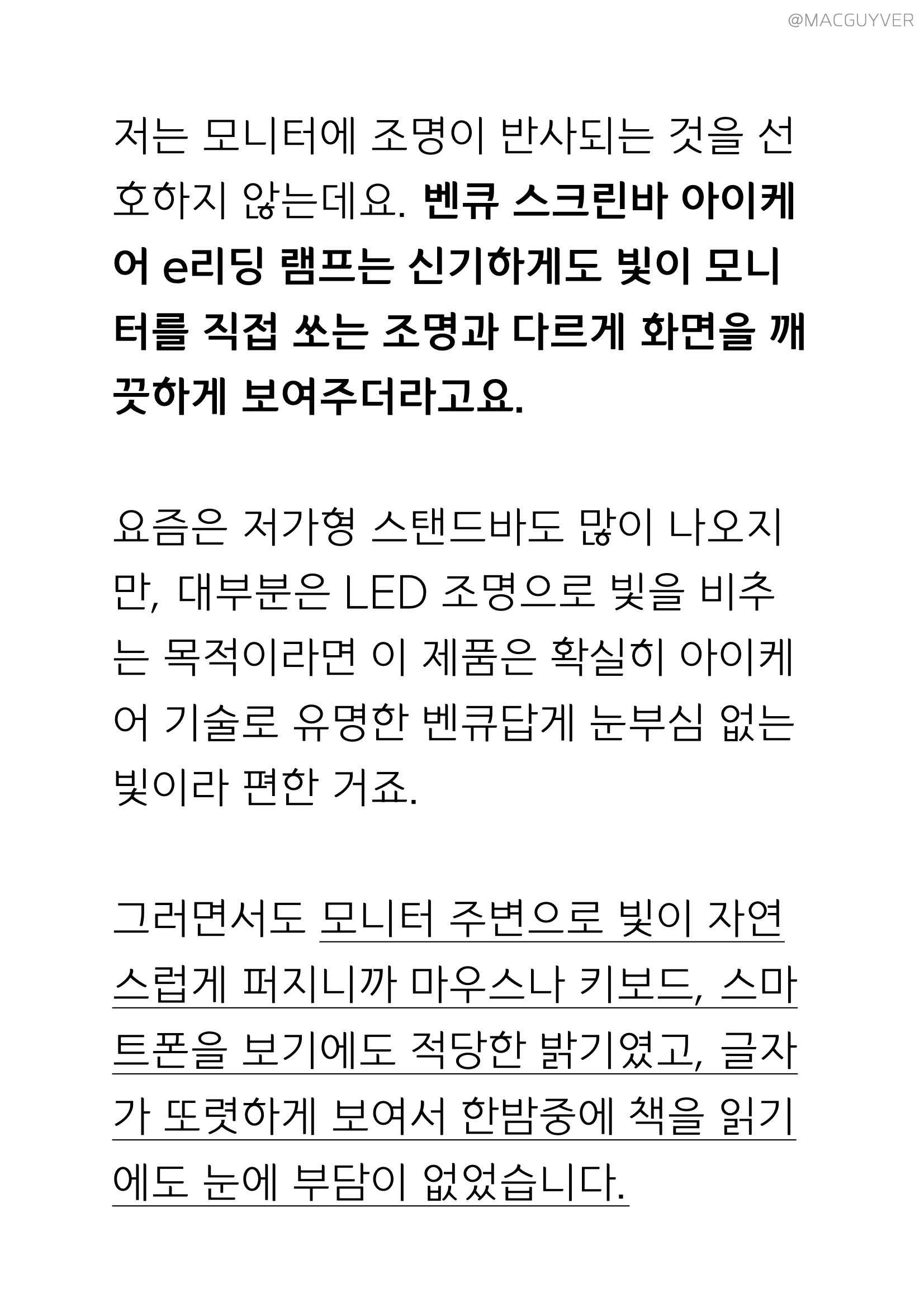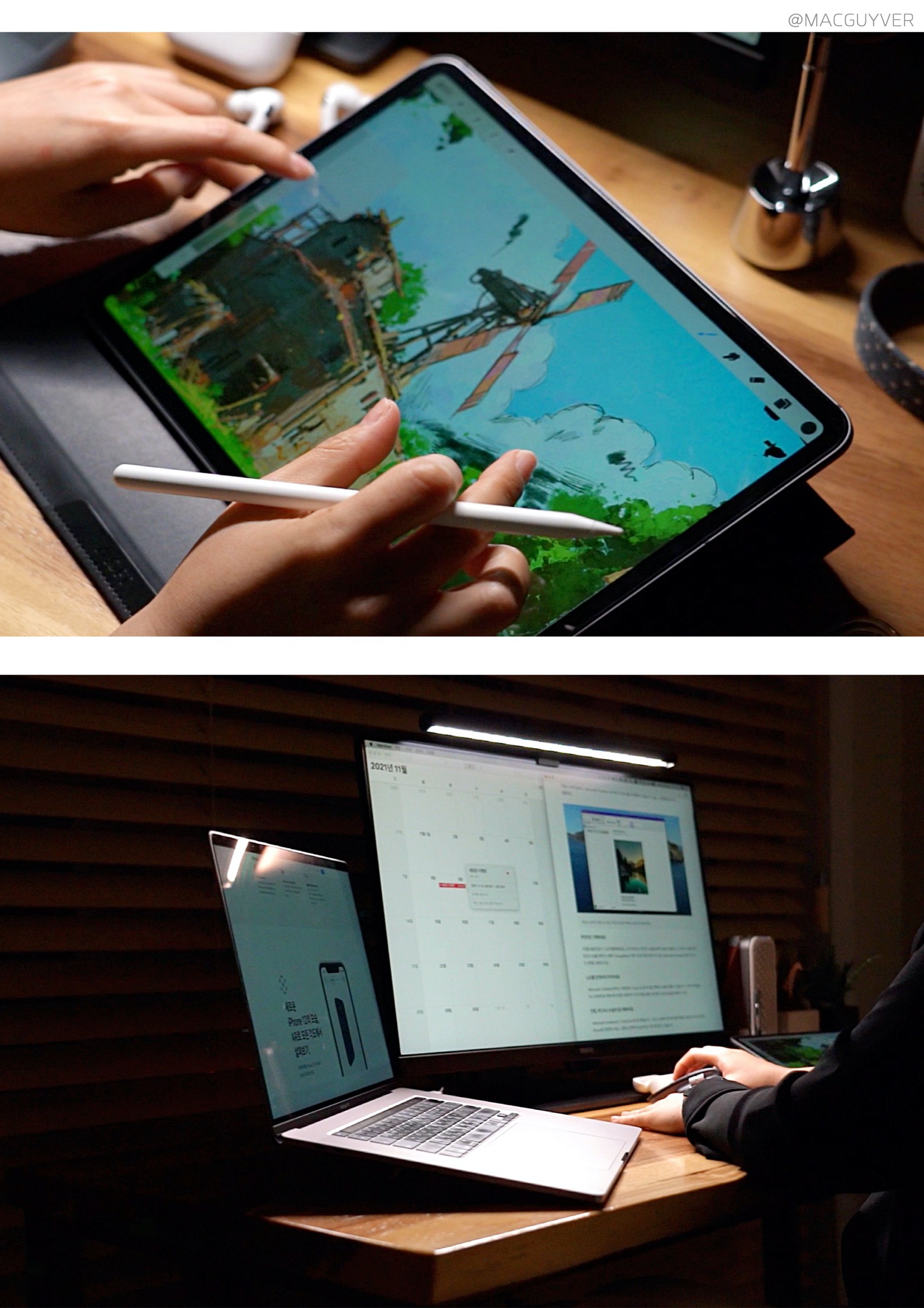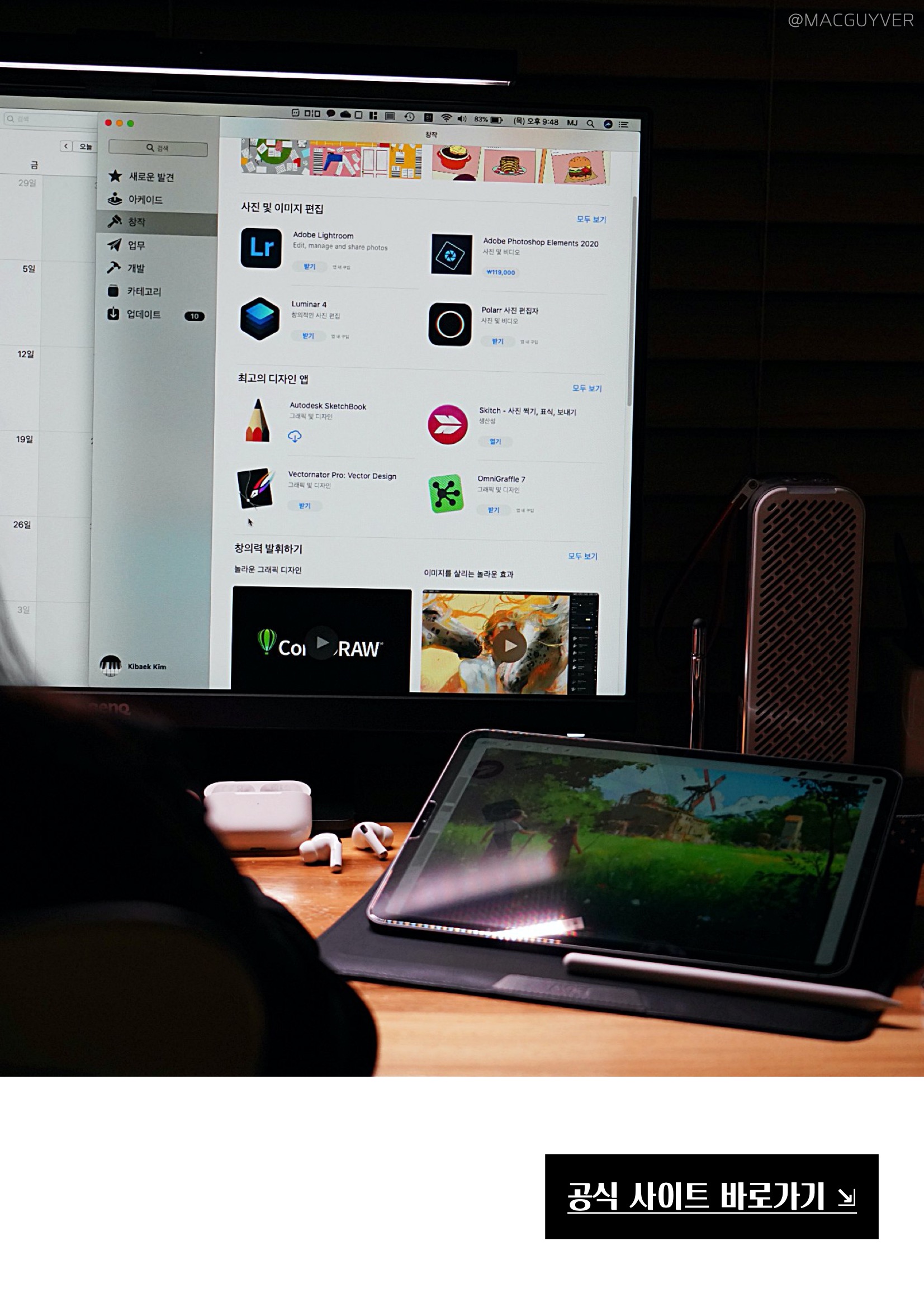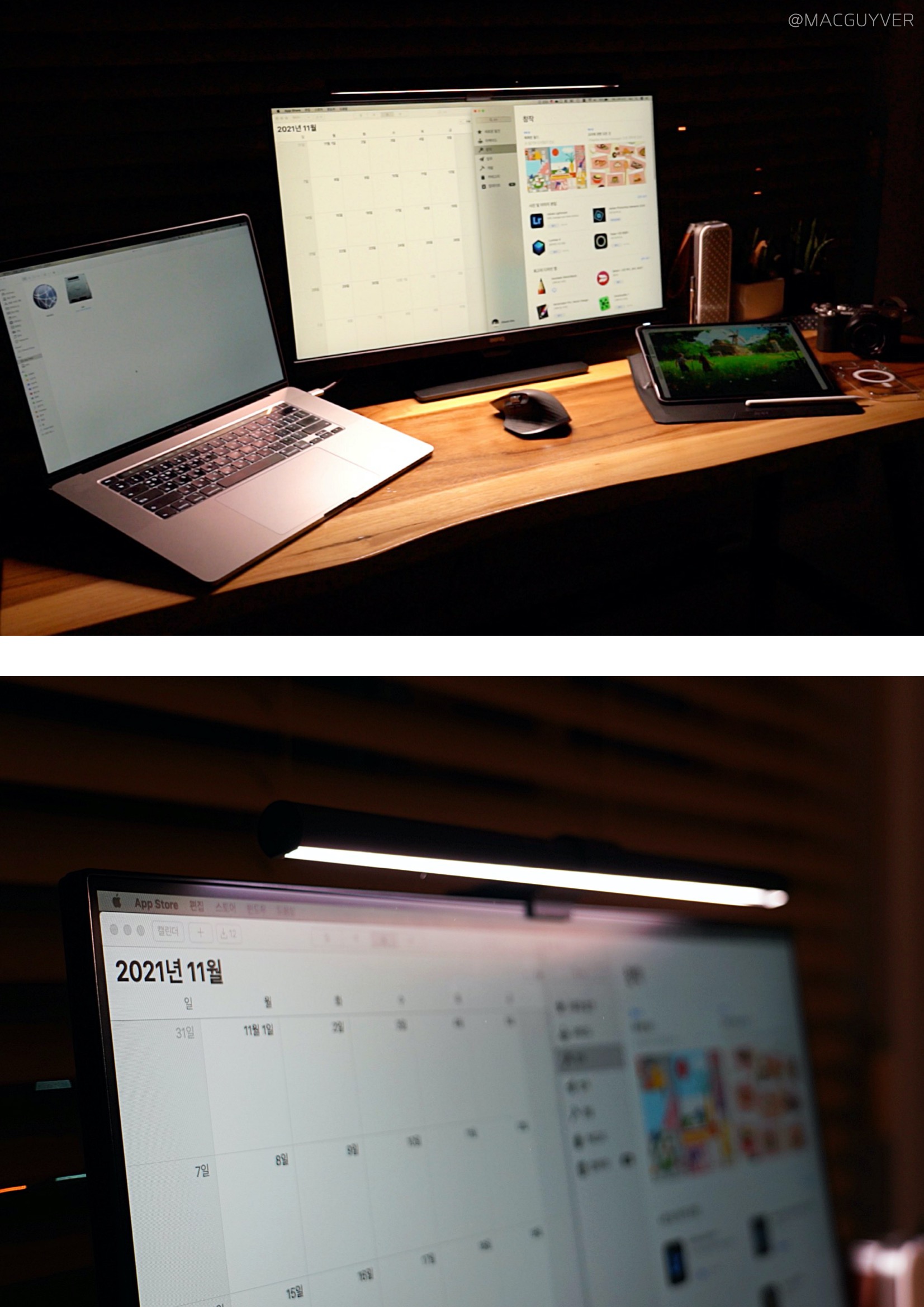 이제 마무리를 해볼까요? 벤큐 스크린바는 모니터를 스탠드처럼 활용하니까 공간도 절약이 되었는데요. 자연스럽게 모니터랑 어우러지는 디자인에 낮에도 적당한 조명이 필요한 분들이나, 모니터를 장시간 사용하시는 분들, 좁은 책상을 더 넓게 사용하시려는 분들에게 좋은 제품이 아닐까 합니다. 참고로, 시력 보호 스탠드 스크린바가 아무리 좋아도 모니터가 너무 쨍하면 여전히 눈이 부실 수 있으니까, 밤에는 모니터도 색온도를 따뜻하게, 그리고 밝기도 적당히 조절해보시는 걸 추천드립니다. 사용 조건이 똑같아도 벤큐 아이케어 스탠드 스크린바 하나만 더했을 뿐인데 장시간 노트북 작업도 눈이 훨씬 더 편안해지고, 모니터를 보는데도 눈부심이 없는 데다 태블릿을 사용할 때도 불편함이 없었습니다. 생각과는 다르게 각도가 낮은 태블릿에서도 조명이 비치지 않으니까 눈부심 없이 스케치를 하는 것도 가능했거든요. 어쩌면 유일한 단점 혹은 고민이 되는 부분이 가격일 정도로 벤큐 노트북 조명 제품 자체는 흠잡을 곳이 없기도 했는데요. 어떤가요? 눈을 위해서 이 정도 투자는 괜찮지 않을까 싶은 제품이기도 했던 벤큐 스크린바가 여러분에게도 정말 유용한 제품이었을지도 궁금합니다. 벤큐 스크린바 아이케어 e리딩 램프에 대해 더 많은 점이 궁금하신 분들은 아래 배너를 통해 알아보실 수 있습니다.