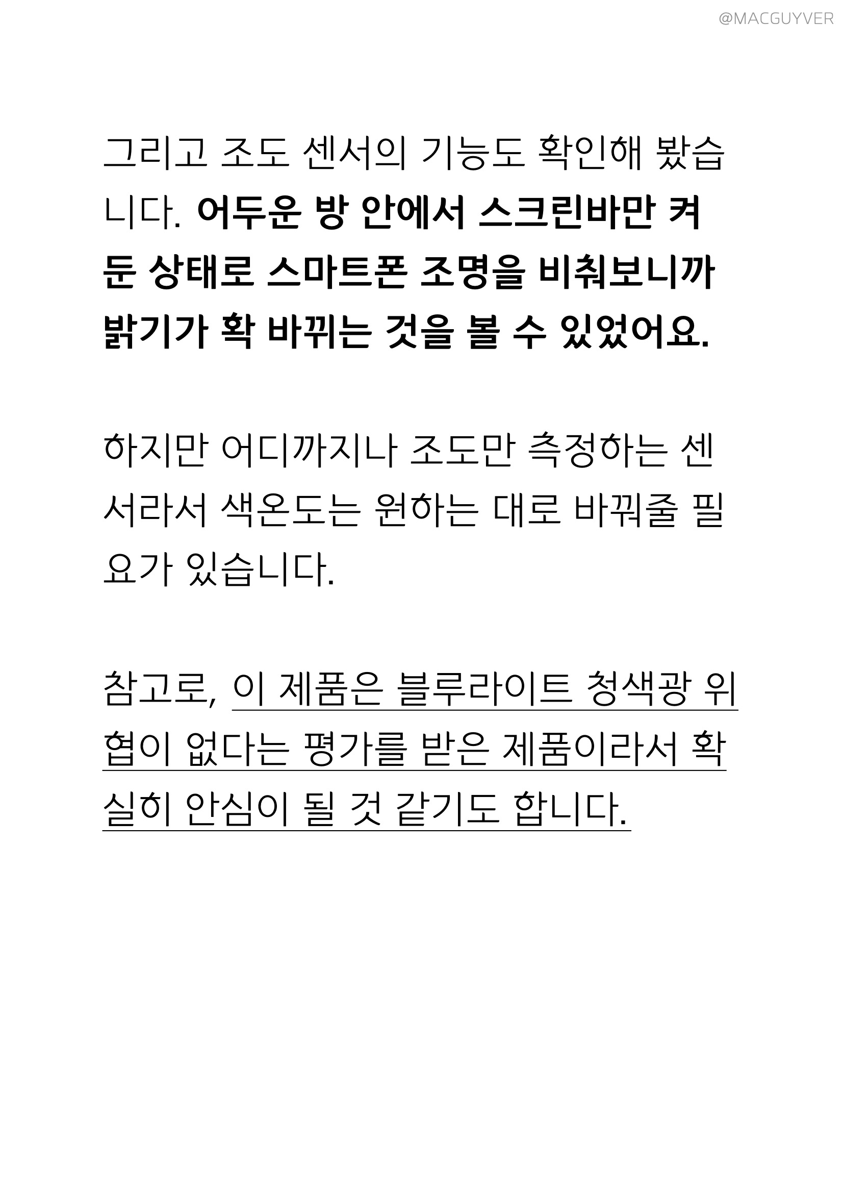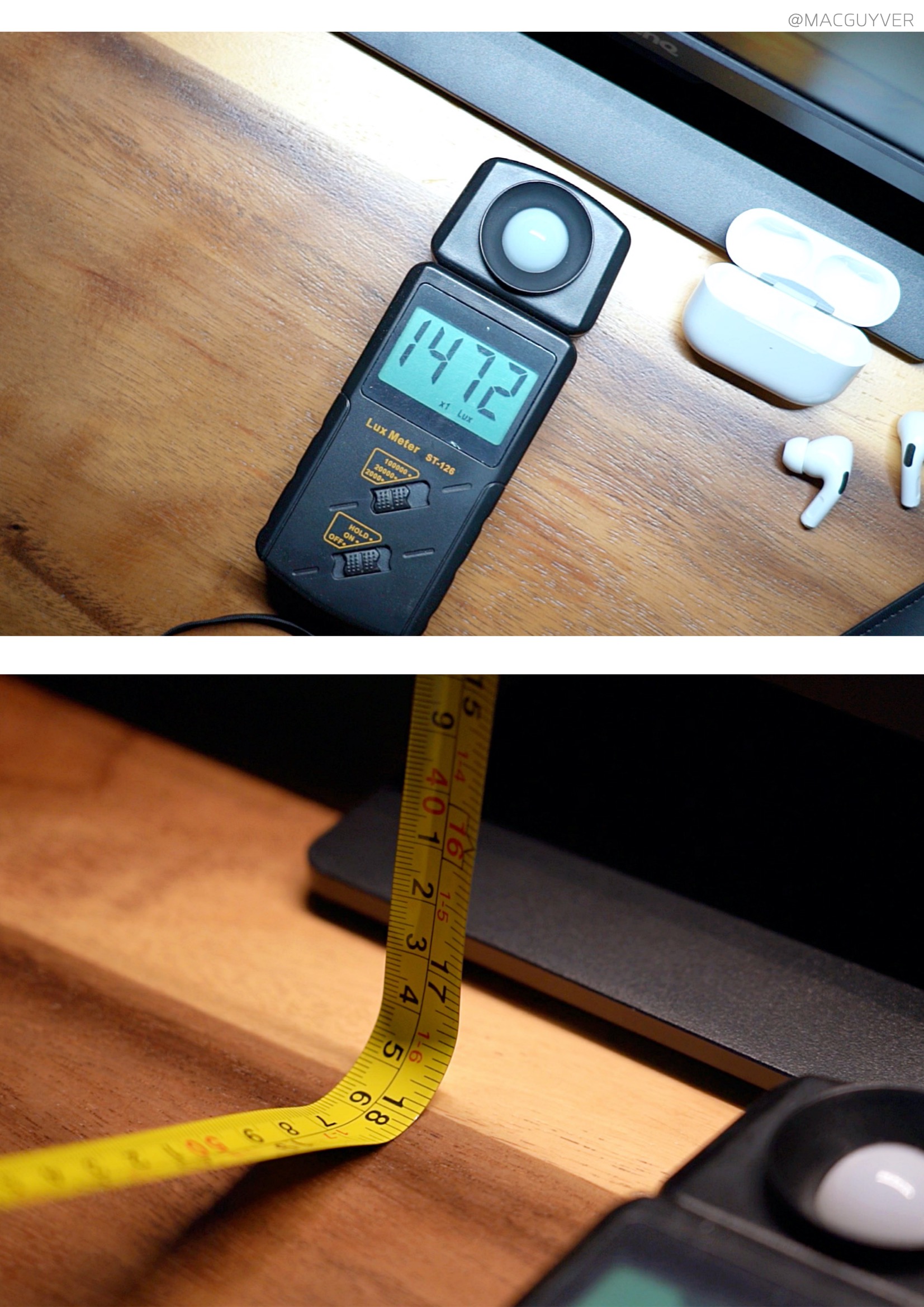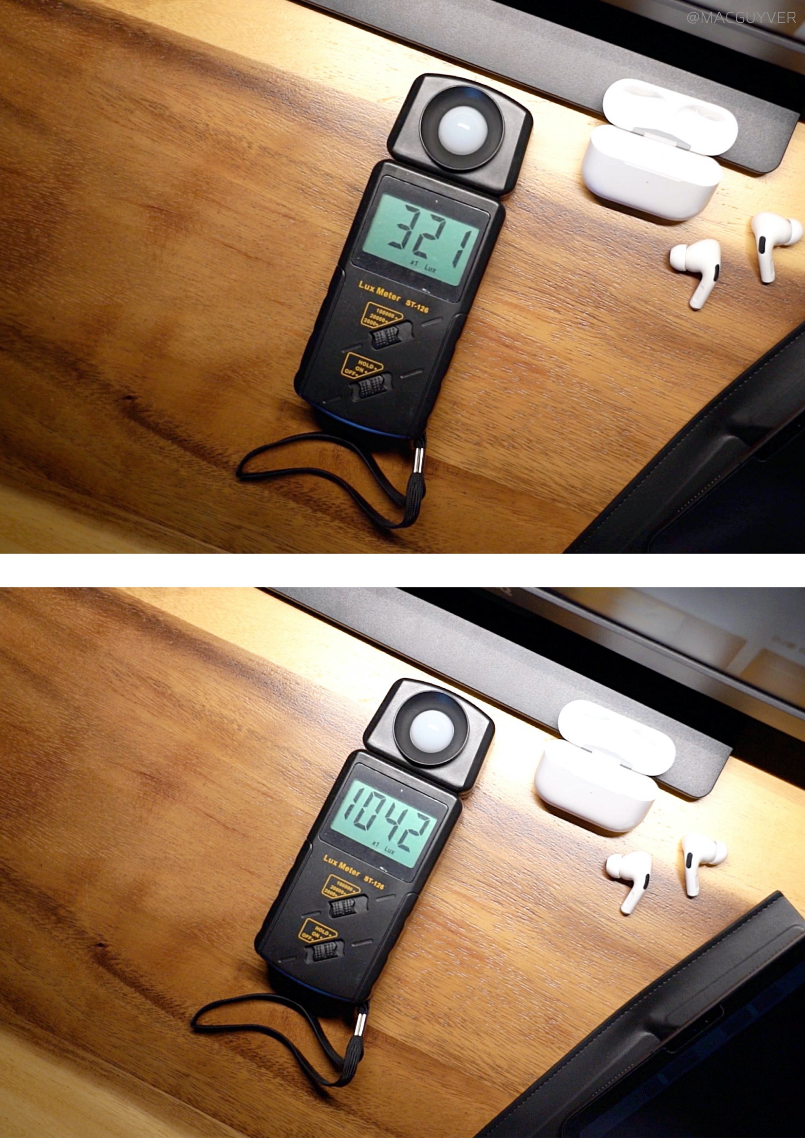 몇 가지 벤큐 스크린바 테스트를 해봤습니다. 가장 먼저 눈을 피로하게 만드는 플리커가 있는지 확인해 봤는데요. 카메라의 셔터 스피드를 1/8000까지 조절해봐도 플리커가 안 보이더라고요. 확실히 벤큐 스크린바가 눈에 부담이 없다는 게 확인이 되더라고요. 물론 가장 중요한 밝기가 어느 정도인지도 확인해 봤습니다. 45cm 정도의 높이에 벤큐 아이케어 스크린바를 설치해서 사용했을 때 최소 밝기는 321럭스 정도였고, 최대 밝기는 스펙보다 조금 더 높은 1042럭스가 나왔어요. 하지만 색온도를 차갑게 바꾸면 무려 1472럭스까지 높아지고, 최소 밝기도 조금 더 밝아지니까 이 점도 참고해두세요. 예상보다 훨씬 밝게 조절하는 것도 가능해서 활용 범위가 더 넓을 것 같습니다. 그리고 조도 센서의 기능도 확인해 봤습니다. 어두운 방 안에서 스크린바만 켜둔 상태로 스마트폰 조명을 비춰보니까 밝기가 확 바뀌는 것을 볼 수 있었어요. 하지만 어디까지나 조도만 측정하는 센서라서 색온도는 원하는 대로 바꿔줄 필요가 있습니다. 참고로, 벤큐 노트북 스탠드는 블루라이트 청색광 위협이 없다는 평가를 받은 제품이라서 확실히 안심이 될 것 같기도 합니다. 저는 모니터에 조명이 반사되는 것을 선호하지 않는데요. 벤큐 스크린바 아이케어 e리딩 램프는 신기하게도 빛이 모니터를 직접 쏘는 조명과 다르게 화면을 깨끗하게 보여주더라고요. 요즘은 저가형 스탠드바도 많이 나오지만, 대부분은 LED 조명으로 빛을 비추는 목적이라면 벤큐 모니터 스크린바는 확실히 아이케어 기술로 유명한 벤큐답게 눈부심 없는 빛이라 편한 거죠. 그러면서도 모니터 주변으로 빛이 자연스럽게 퍼지니까 마우스나 키보드, 스마트폰을 보기에도 적당한 밝기였고, 글자가 또렷하게 보여서 한밤중에 책을 읽기에도 눈에 부담이 없었습니다.