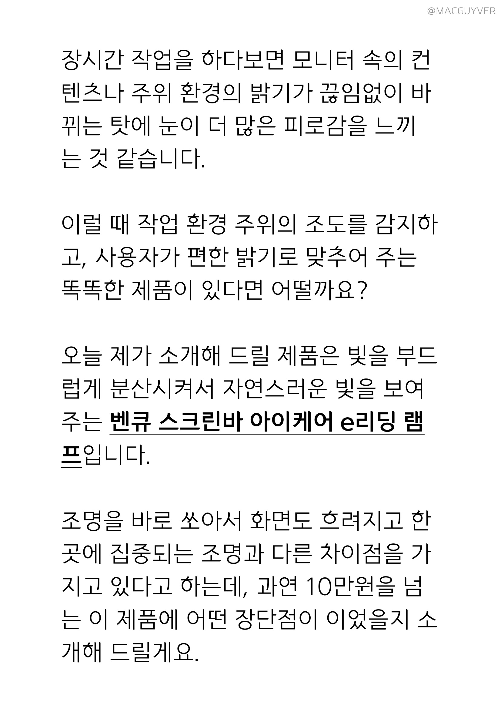모니터 속 컨텐츠나 주위 환경의 밝기가 끊임없이 바뀌는 탓에 눈이 더 많은 피로감을 느끼기도 하는 것 같습니다. 이럴 때 작업 환경 주위의 조도를 감지하고, 사용자가 편한 밝기로 맞추어 주는 똑똑한 제품이 있다면 어떨까요? 오늘 제가 소개해 드릴 제품은 빛을 부드럽게 분산시켜서 자연스러운 빛을 보여주는 벤큐 스크린바 아이케어 e리딩 램프입니다. 벤큐 모니터 LED 스탠드는 조명을 바로 쏘아서 화면도 흐려지고 한 곳에 집중되는 조명과 다른 차이점을 가지고 있다고 하는데, 과연 10만원을 넘는 이 제품에 어떤 장단점이 이었을지 소개해 드릴게요.