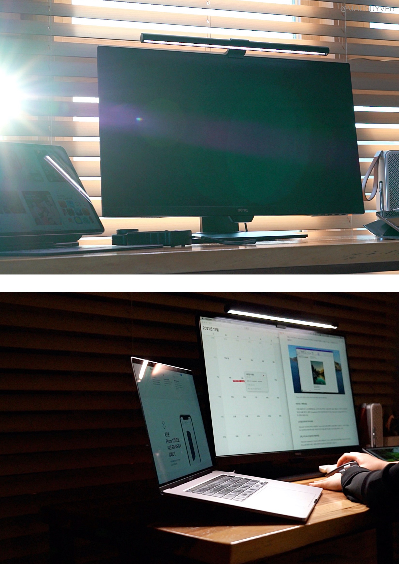 하지만 아쉬움이 없는 제품은 없겠죠. 요즘 많이 사용한다는 커브드 모니터에 벤큐 스크린바를 설치해보니 곡률에 따라서 이렇게 상단부분에 빛이 맺히기도 했습니다. 물론 은은한 빛이라 크게 거슬리지는 않지만 나중에는 커브드 스크린바도 나오면 좋겠다는 생각도 드네요. 또 사용하다 보면 바로 느껴지실 텐데, 벤큐 아이케어 스크린바에 자동 전원 켜짐 기능이 없어요. 센서로 움직임을 감지해서 켜주지는 않으니까 직접 켜고 꺼야 하는데, 너무 자연스러운 조명이라 꺼두는 걸 잊어버릴 때도 종종 있더라고요. 모니터를 비추는 특정 각도에서는 그동안 미처 인지하지 못했던 유분이나 먼지의 존재를 확인하게 된다는 점도 알아두셔야겠습니다. 물론 일부러 비춰보면서 꼼꼼하게 청소하는데 활용하기도 합니다.