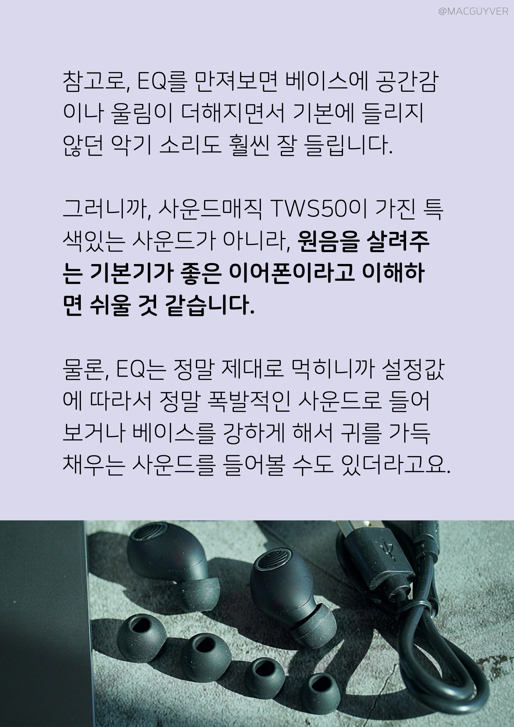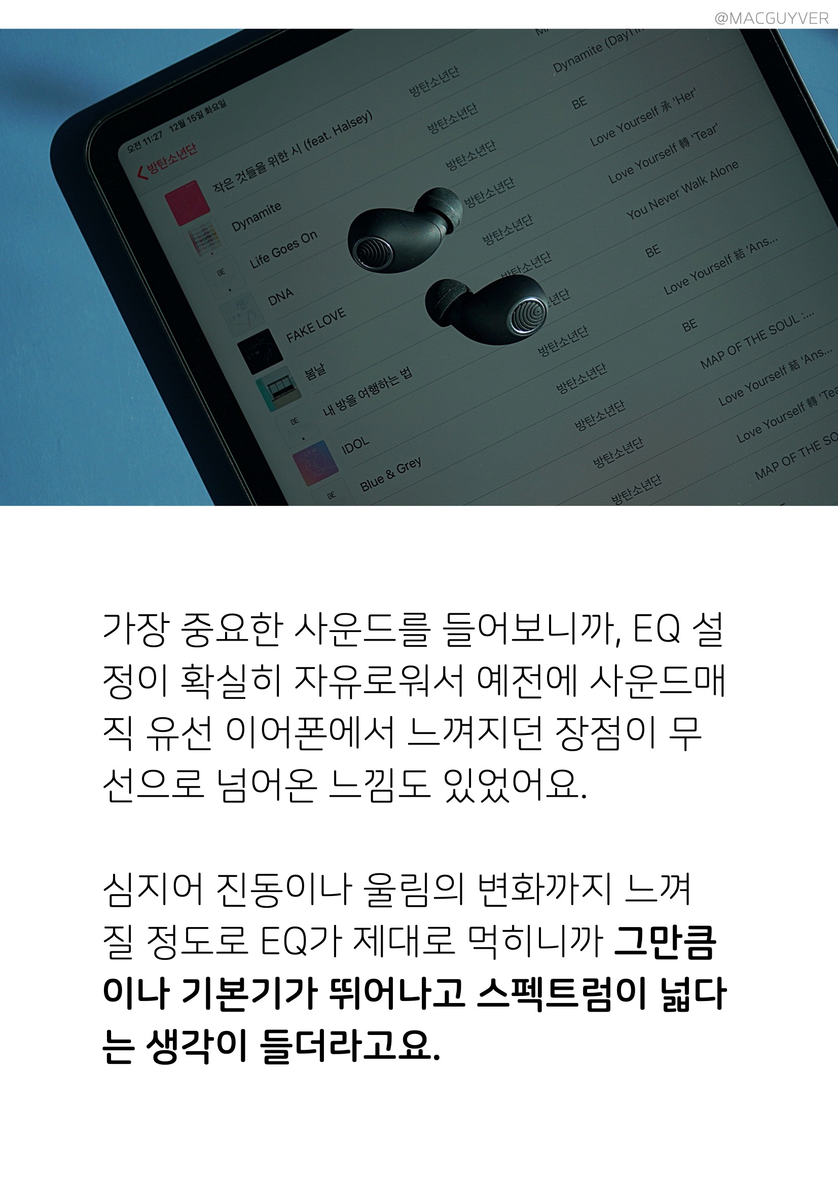 착용이 명확하게 된 상태에서 노캔이 100% 기능을 발휘하니까, 착용이 잘 되었는지 확인하시고 또 이어팁의 크기를 조절하면 꼭 맞춰진 노캔을 체험해볼 수 있을 것 같습니다. 노이즈 캔슬링 이어폰 별도의 전용앱이 없어서 자체 EQ 조절은 안되지만, 기본 음색 자체가 저음부터 고음까지 균일하게 재생이 가능해서 귀에 꽉 차는 사운드를 들려주는 느낌입니다. 고음과 중음, 저음이 모두 비슷하게 만족스러웠는데 따져보자면 저음이 더 좋은 편이었어요. 고음과 중음은 기본에 충실하면서 단정한 느낌이라면, 저음은 아주 자연스러운 소리를 전달해서 마치 귓속에 대고 직접 말하는 느낌이 들었는데요. 가성비 블루투스 이어폰 베이스는 소리를 정확하게 전달해줘서 깔끔하고 힘 있는 소리를 원하는 분들이라면 에어팟보다도 더 만족하지 않을까 싶었습니다. 참고로, EQ를 만져보면 베이스에 공간감이나 울림이 더해지면서 기본에 들리지 않던 악기 소리도 훨씬 잘 들립니다.