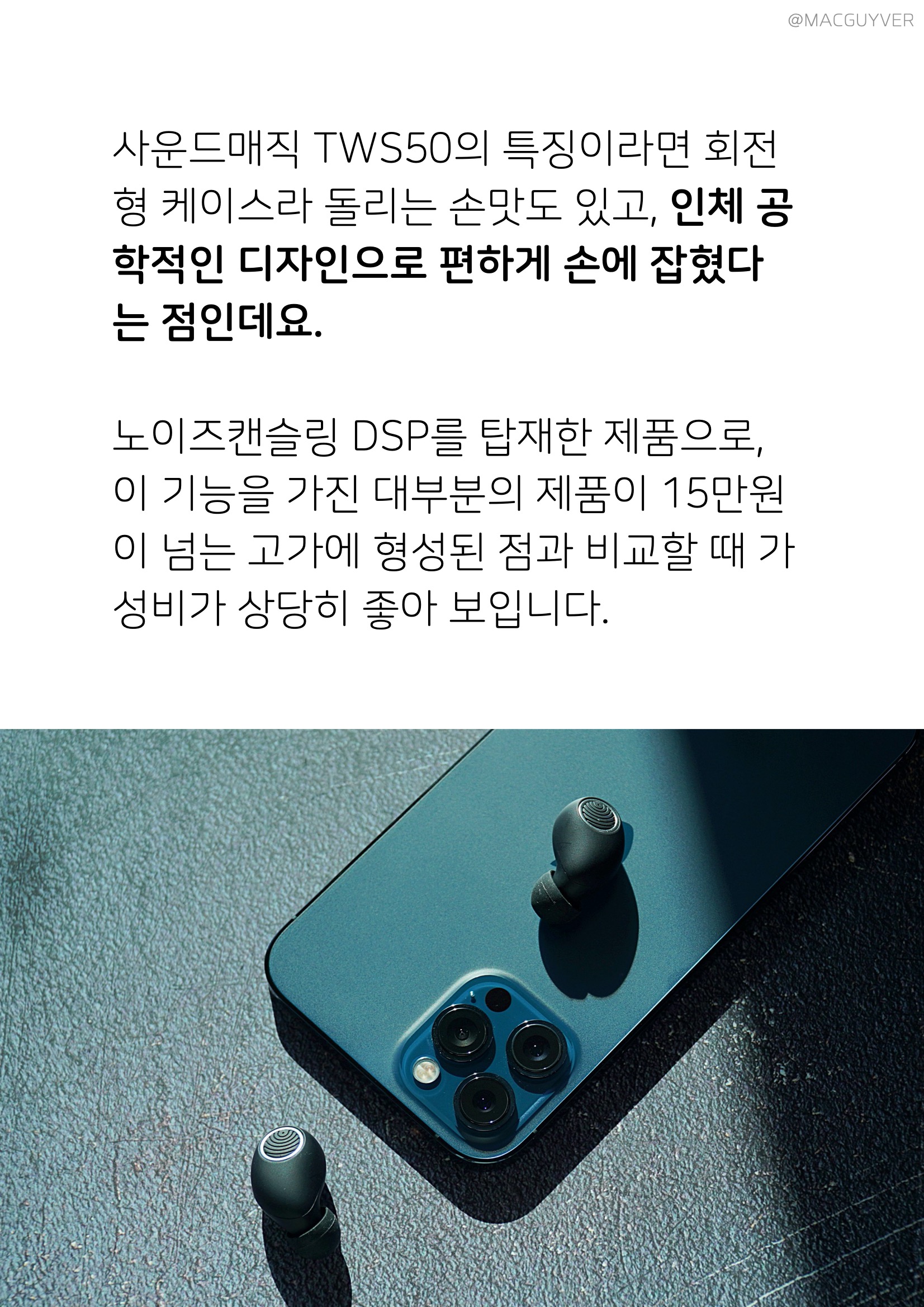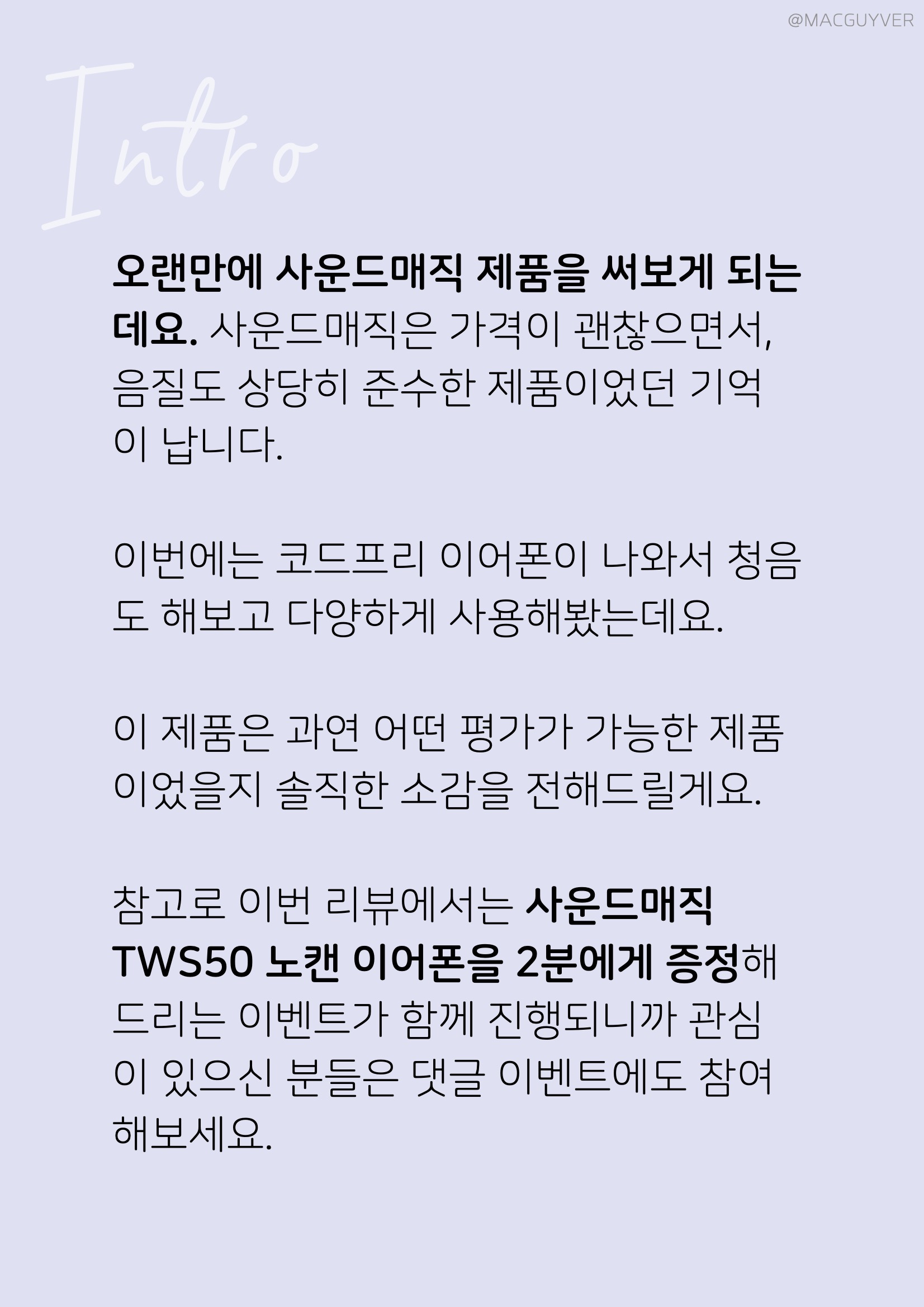 오랜만에 사운드매직 가성비 블루투스 이어폰을 써보게 되는데요. 사운드매직은 가격이 괜찮으면서, 음질도 상당히 준수한 제품이었던 기억이 납니다. 이번에는 노이즈 캔슬링 이어포이 나와서 청음도 해보고 다양하게 사용해봤는데요. 이 가성비 블루투스 이어폰은 과연 어떤 평가가 가능한 제품이었을지 솔직한 소감을 전해드릴게요. 참고로 이번 리뷰에서는 사운드매직 TWS50 무선 이어폰 추천 제품을 2분에게 증정해드리는 이벤트가 함께 진행되니까 관심이 있으신 분들은 댓글 이벤트에도 참여해보세요. 사운드매직 TWS50 노이즈 캔슬링 이어폰의 특징이라면 회전형 케이스라 돌리는 손맛도 있고, 인체 공학적인 디자인으로 편하게 손에 잡혔다는 점인데요.