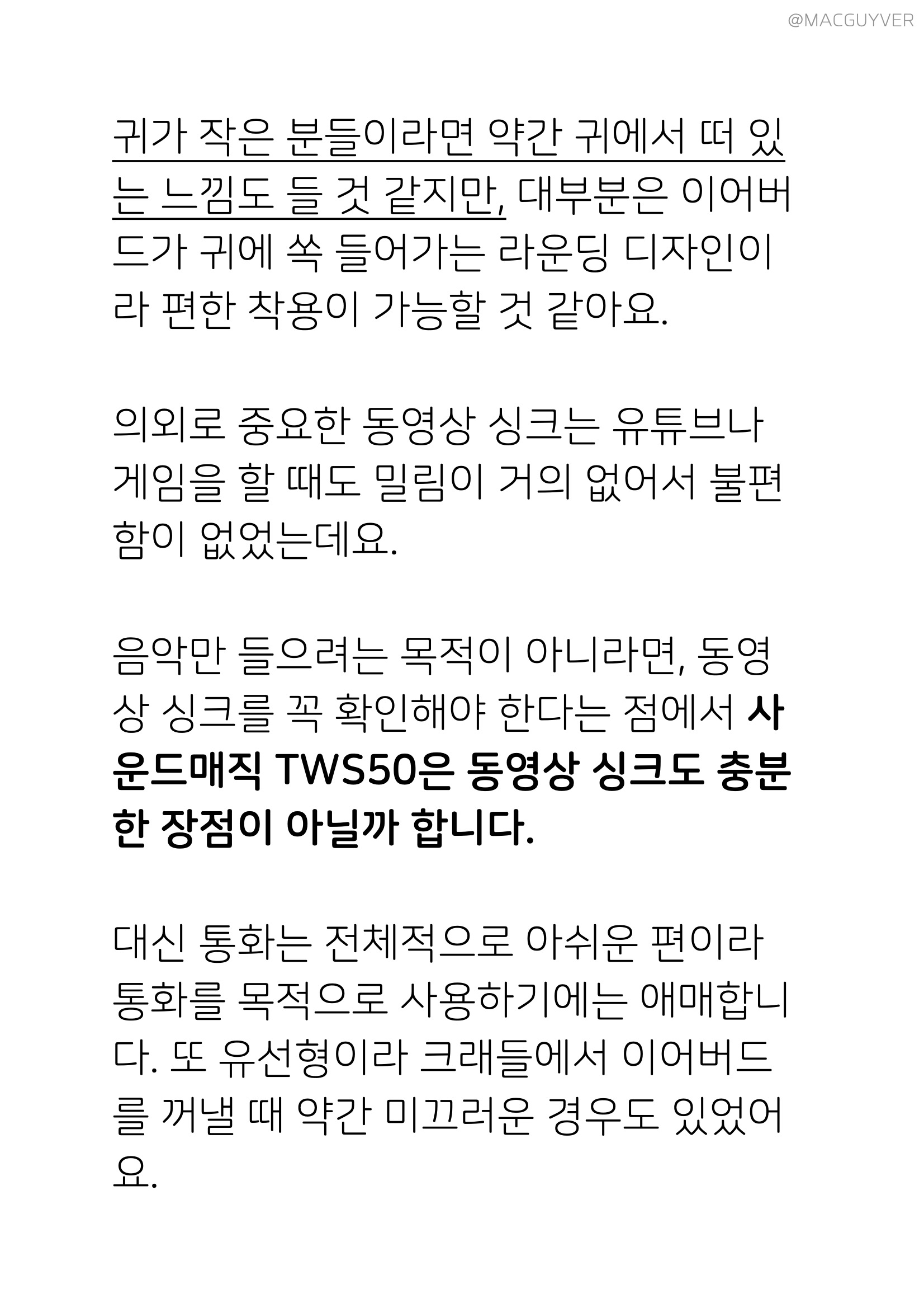 충전 중에는 %가 계속 나오지만 사용중에는 이어버드를 넣고 닫을때만 잠깐 나와서 원할 때 바로 확인이 불편한 점은 아쉬운 것 같습니다. 조작성은 무난한데요. 가성비 블루투스 이어폰 전화 받기부터 음악 재생/정지, 이전/다음곡, 볼륨 업/다운까지 다 되더라고요. 대신 볼륨을 조절하려면 0.5초씩 눌러야 하는데 계속 눌러도 한 단계만 조절되니까 반복해서 해야 한다는게 번거롭기도 합니다. 귀가 작은 분들이라면 약간 귀에서 떠 있는 느낌도 들 것 같지만, 대부분은 이어버드가 귀에 쏙 들어가는 라운딩 디자인이라 편한 착용이 가능할 것 같아요. 노이즈 캔슬링 이어폰은 의외로 중요한 동영상 싱크는 유튜브나 게임을 할 때도 밀림이 거의 없어서 불편함이 없었는데요. 음악만 들으려는 목적이 아니라면, 동영상 싱크를 꼭 확인해야 한다는 점에서 사운드매직 TWS50은 동영상 싱크도 충분한 장점이 아닐까 합니다.