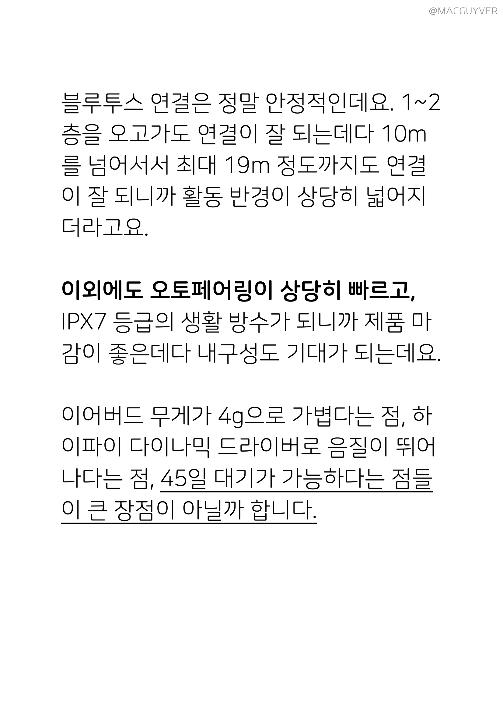 대신 통화는 전체적으로 아쉬운 편이라 통화를 목적으로 사용하기에는 애매합니다. 또 유선형이라 크래들에서 이어버드를 꺼낼 때 약간 미끄러운 경우도 있었어요. 블루투스 연결은 정말 안정적인데요. 1~2층을 오고가도 연결이 잘 되는데다 10m를 넘어서서 최대 19m 정도까지도 연결이 잘 되니까 활동 반경이 상당히 넓어지더라고요. 이외에도 오토페어링이 상당히 빠르고, IPX7 등급의 생활 방수가 되니까 제품 마감이 좋은데다 내구성도 기대가 되는데요. 이어버드 무게가 4g으로 가볍다는 점, 하이파이 다이나믹 드라이버로 음질이 뛰어나다는 점, 45일 대기가 가능하다는 점들이 큰 장점이 아닐까 합니다. 사운드매직 TWS50 무선 이어폰 추천 제품은 유럽 WHAT HI-FI 전문 음향지에서 꾸준히 가성비가 좋은, 음질이 뛰어난 이어폰으로 인정받는 사운드매직의 무선 이어폰으로 해외에서도 인정받는 제품이라는 점도 눈에 띄더라고요. 그리고 볼매처럼, 조개를 연상하게 하는 디자인도 인상적인데요. 정가에서 할인된 79,900원에 구입할 수 있는데다 12월 28일까지 한정 기간 59,900원으로 구입할 수 있으니까 관심이 있으신 분들은 한정 혜택을 받아보시는 것도 좋을 것 같습니다.