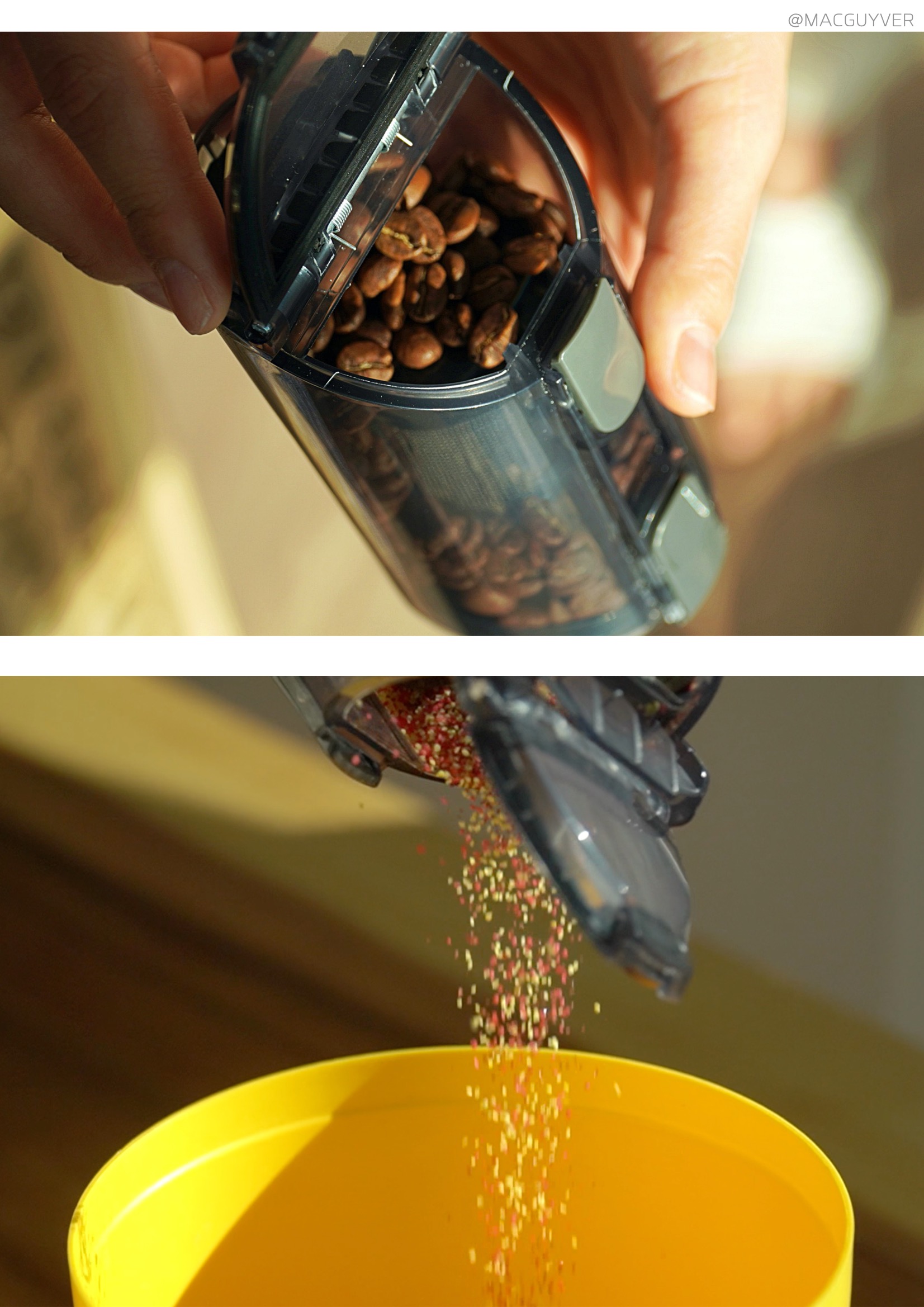 우선,핸디청소기지만 핸디형 뿐만 아니라 일반 무선청소기로도 쓸만한지 흡입력이 궁금해서 테스트를 해봤는데요. 큰 먼지부터 작은 알갱이까지 말끔하게 흡입해 줘서 만족스러웠어요. 예를 들면, 이렇게 입자가 작고 고운 모래부터 큼지막한 쌀알이나 커피콩까지도 흡입해 줬어요. 연장헤드를 장착해서 사용할 때보다 핸디형으로 사용했을 때 압력으로 인해 바닥면에 더 밀착되는 듯한 느낌이 들었어요. 핸디형 청소기는 일반 청소기보다 부피가 작은 만큼 먼지통도 더 자주 비워줘야 하는데요. 먼지통 분리도 간편한 데다, 먼지통부터 필터까지 물세탁이 가능해서 훨씬 깨끗하게 사용할 수 있었어요. 이쯤에서 미니청소기 디자인을 밀착해서 보여드리자면, 거치대가 공간 절약형인데다 꽂으면 바로 충전이 되고, 툴킷 보관까지 되니까 편했는데요.