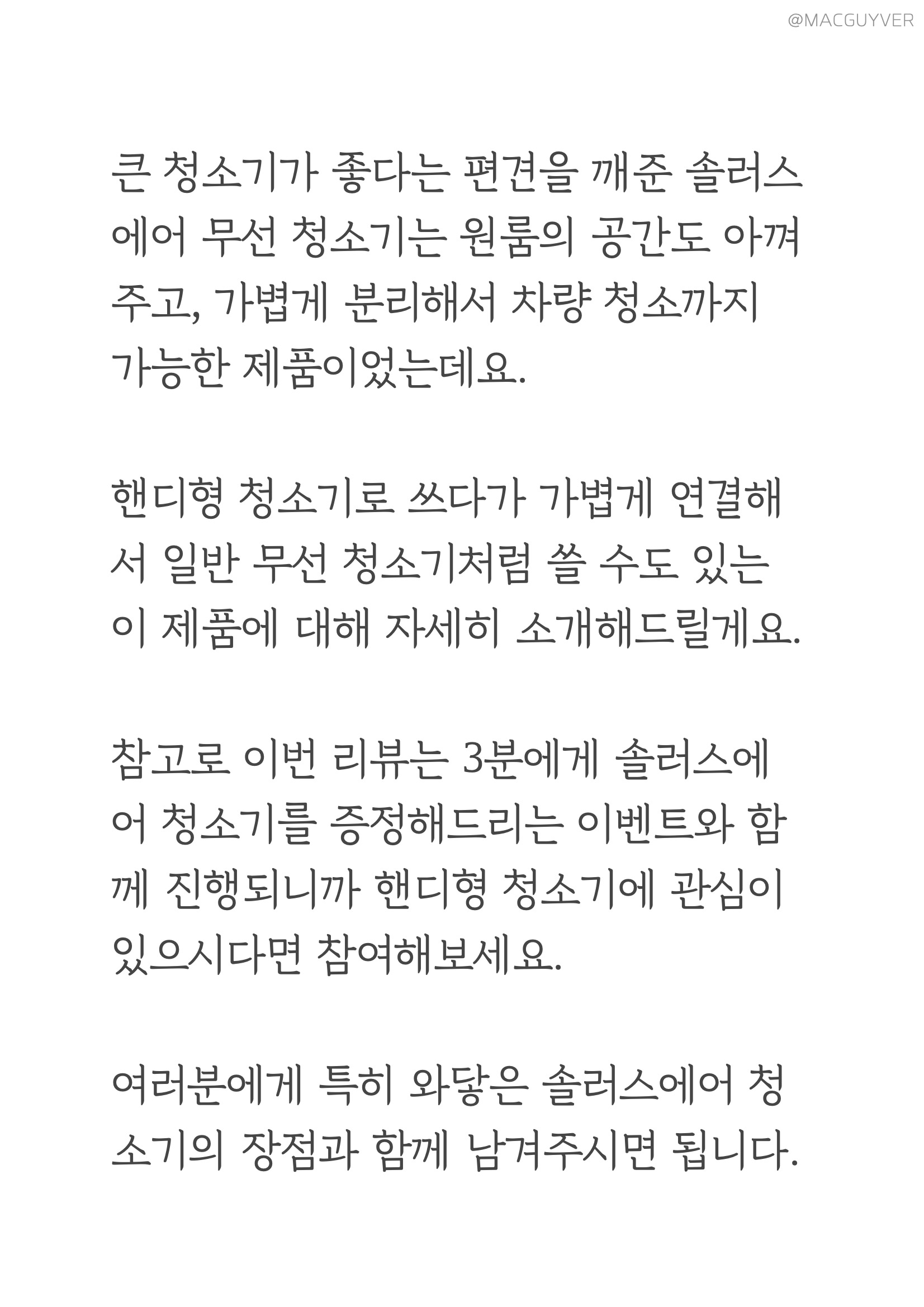 큰 청소기가 좋다는 편견을 깨준 솔러스에어 무선 청소기는 원룸의 공간도 아껴주고, 가볍게 분리해서 차량 청소까지 가능한 제품이었는데요. 핸디형 청소기로 쓰다가도 가볍게 연결해서 일반 무선 청소기처럼 쓸 수도 있는 이 제품에 대해 자세히 소개해드릴게요. 참고로 이번 소형청소기 리뷰는 3분에게 솔러스에어 청소기를 증정해드리는 이벤트와 함께 진행되니까 핸디형 청소기에 관심이 있으시다면 참여해보세요. 여러분에게 특히 와닿은 솔러스에어 청소기의 장점과 함께 남겨주시면 됩니다.