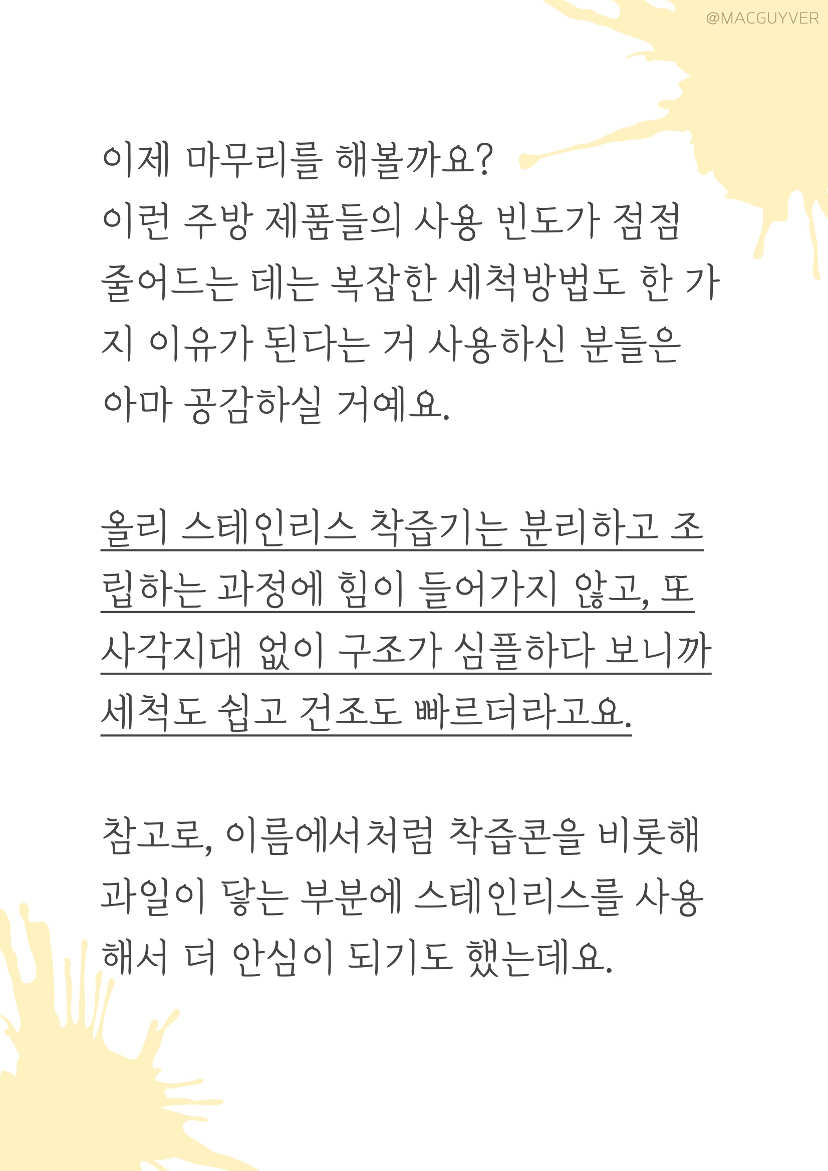 이제 마무리를 해볼까요? 이런 주방 제품들의 사용 빈도가 점점 줄어드는 데는 복잡한 세척방법도 한 가지 이유가 된다는 거 사용하신 분들은 아마 공감하실 거예요. 올리 스테인리스 착즙기는 분리하고 조립하는 과정에 힘이 들어가지 않고, 또 사각지대 없이 구조가 심플하다 보니까 쥬서기 세척도 쉽고 건조도 빠르더라고요. 참고로, 이름에서처럼 착즙콘을 비롯해 과일이 닿는 부분에 스테인리스를 사용해서 더 안심이 되기도 했는데요. 쥬서기 소비 전력도 55W로 낮은 데다, 저속으로 회전하니까 소음도 크지 않아서 이른 아침이든 늦은 밤이든 사용에 부담이 없다는 점도 만족스러웠어요. 과일 원액기를 보관할 때 꼬이고 늘어져있는 케이블도 은근히 신경이 쓰이죠? 올리 스테인리스 착즙기는 아래쪽에 있는 케이블 정리 홀더를 이용하면 깔끔한 정리도 되니까 좋았어요.